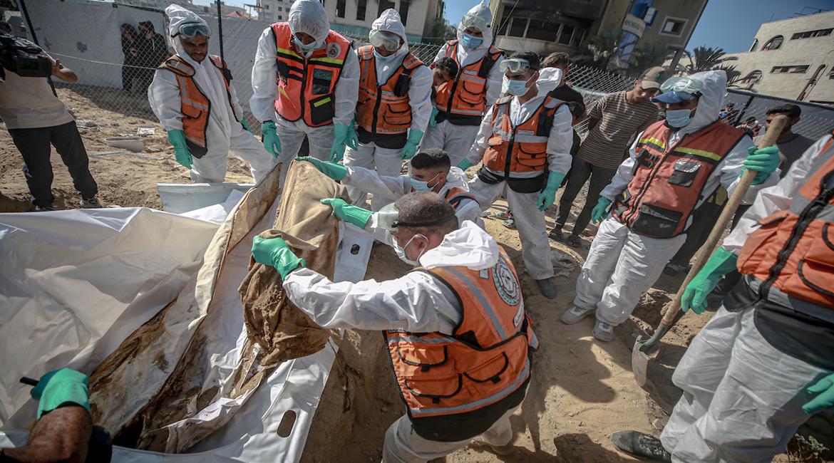 عادة دفن جثامين أكثر من ستين شهيداً بينهم مجهولو الهوية بعد انتشالهم من قبور مؤقتة في ساحة الكتيبة غرب مدينة غزة