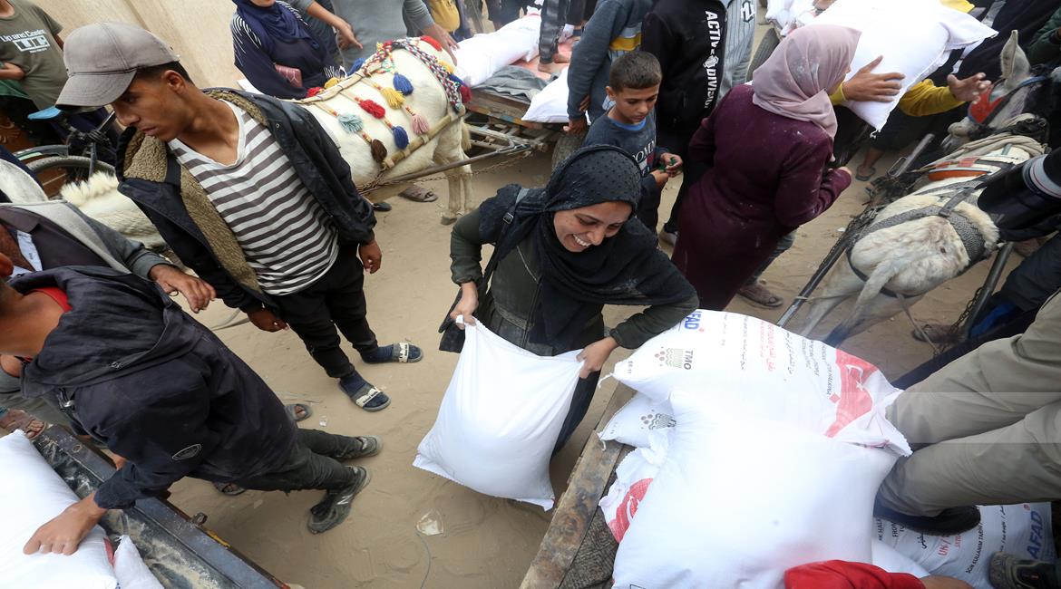 غزة - مواطنون يتجمعون للحصول على الدقيق الذي توزعه وكالة الاونروا في ظل ازمة نقص الدقيق وعجز المخابز عن توفير احتياج النازحين.