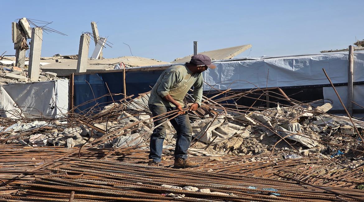 مواطنون يستخرجون حديد البناء من المباني التي دمرها الاحتلال لإعادة تدويره واستخدامه في بناء الخيام والملاجئ المؤقتة