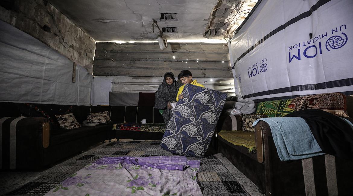عائلة نازحة تعيش داخل بناية مدمرة في مخيم البريج في ظل ظروف إنسانية قاسية نتيجة اشتداد المنخفض الجوي