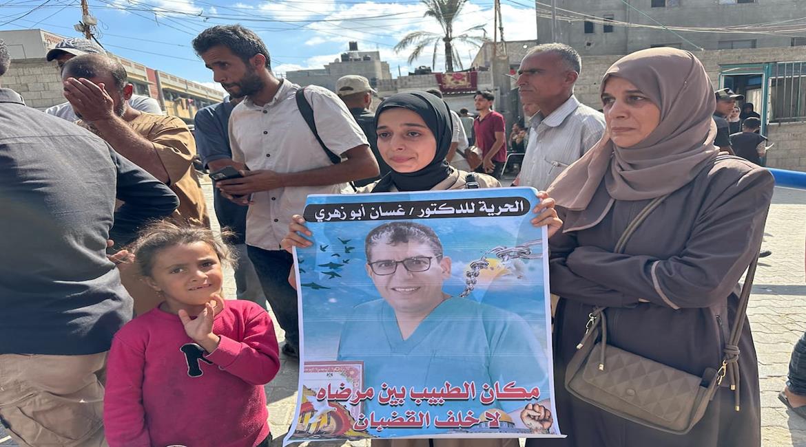 وقفة أمام مستشفى ناصر في خان يونس جنوب قطاع غزة للمطالبة بالإفراج عن الأطباء والممرضين والعاملين في المجال الطبي المعتقلين في سجون الاحتلال الإسرائيلي