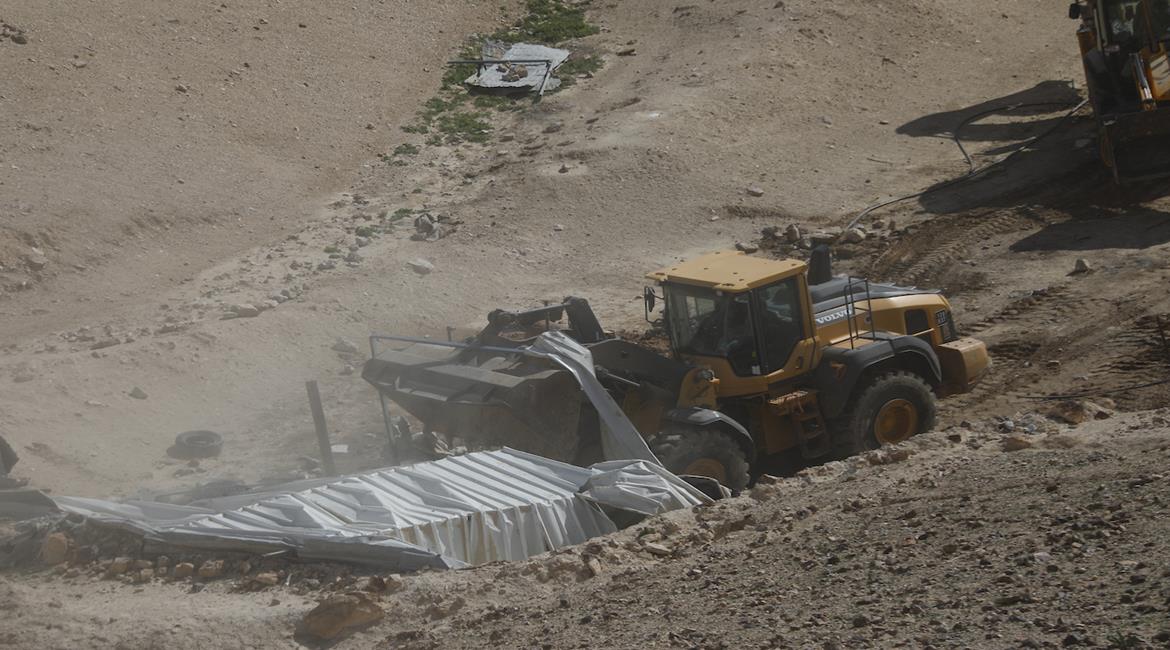 قوات الاحتلال تهدم عددا من البركسات وحظائر الماشية لمواطنين من عائلة الحمادين في وادي القراشية بقرية خشم الدرج في بادية يطا جنوب الخليل