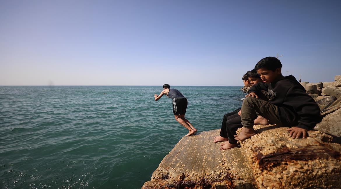 أطفال يمارسون السباحة قرب ميناء غزة المتضرر من الحرب، ويشكّل بحر غزة المتنفّس الوحيد للسكان الذين يعانون آثار الحرب والنزوح