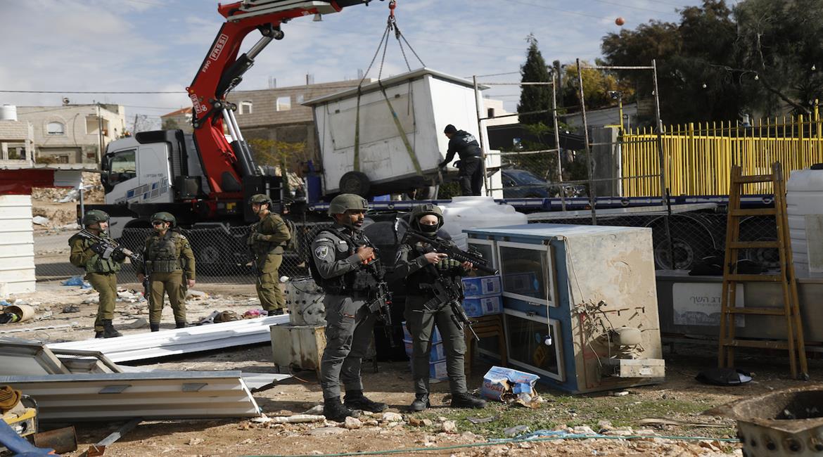 قوات الاحتلال تهدم وتصادر عدد من المحلات التجارية المصنوعة من الكرفانات في بلدة السموع