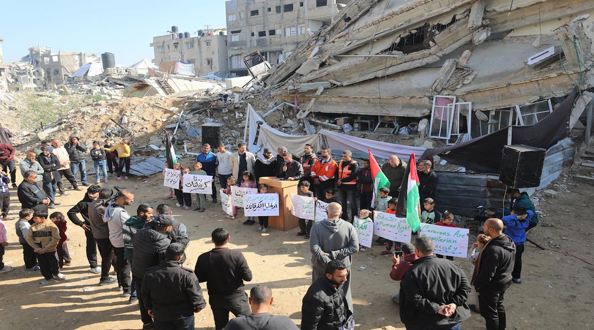 مواطنون ينظمون وقفة أمام منزل عائلة لبد المنهار في مدينة غزة، مطالبين بتسريع جهود إعادة الإعمار وتوفير منازل متنقلة بدلا من الخيام التي لا تقيهم برد الشتاء ولا حرّ الصيف