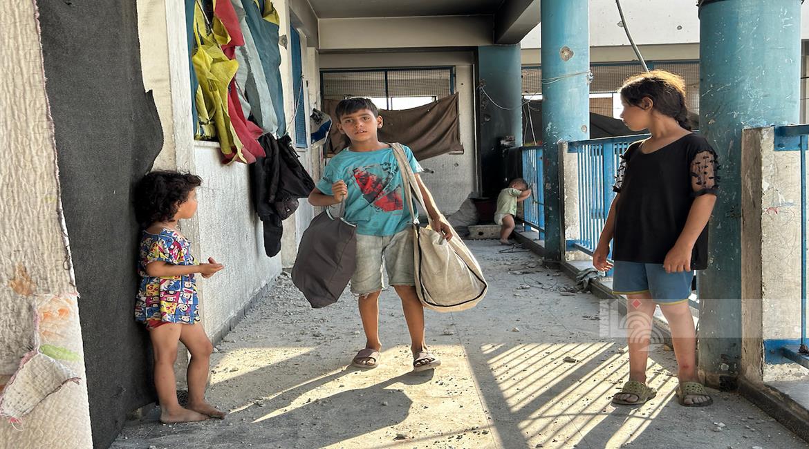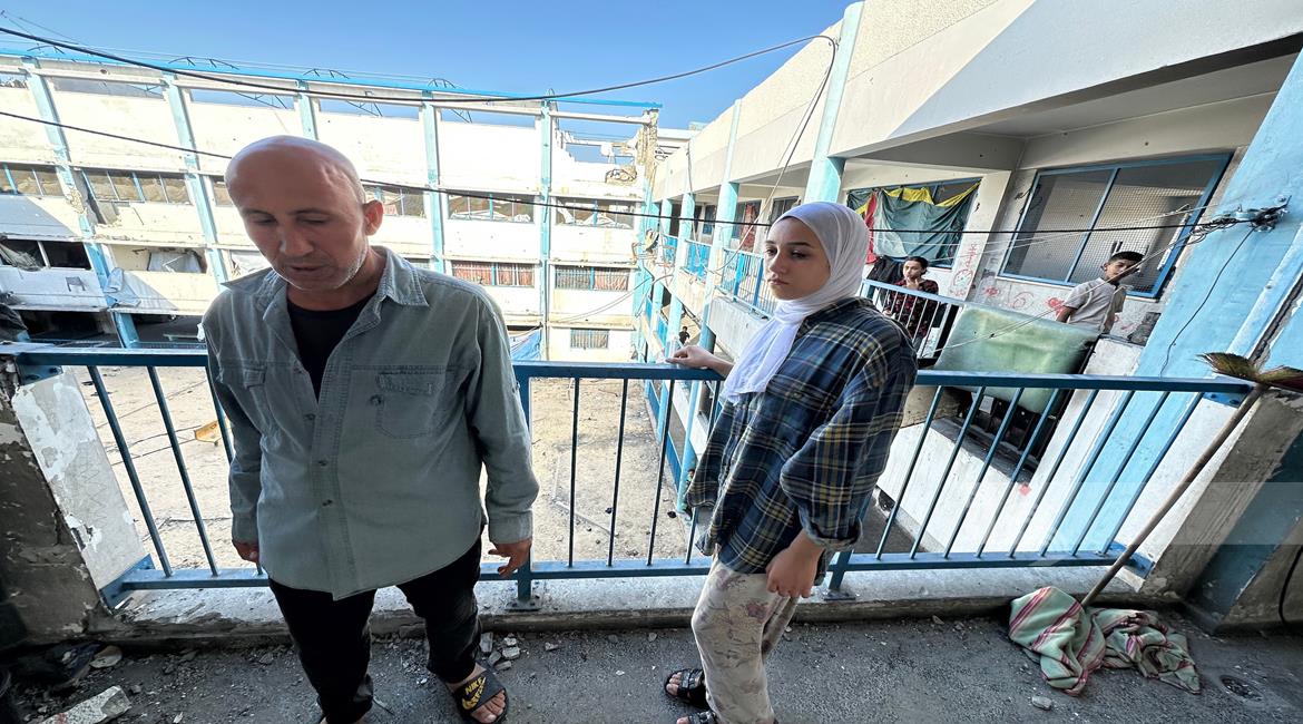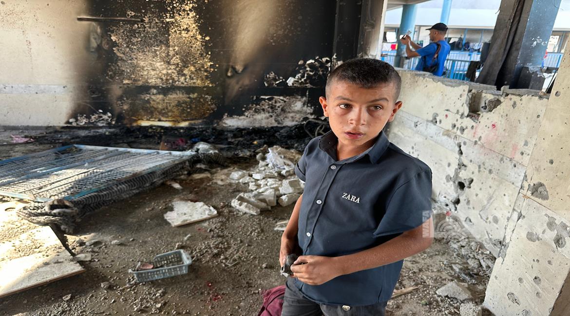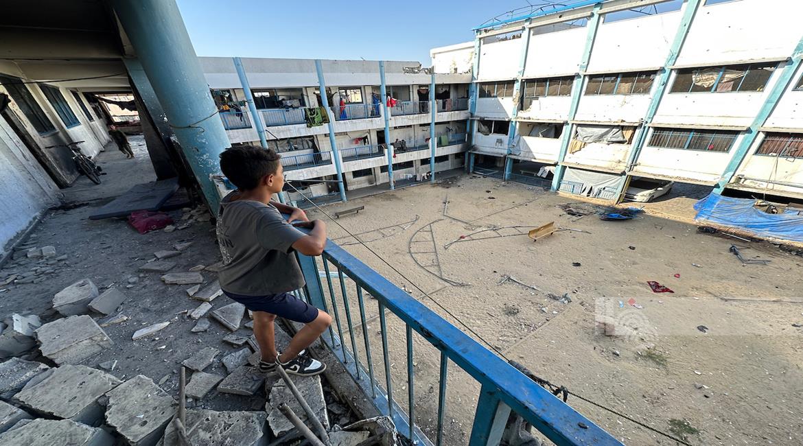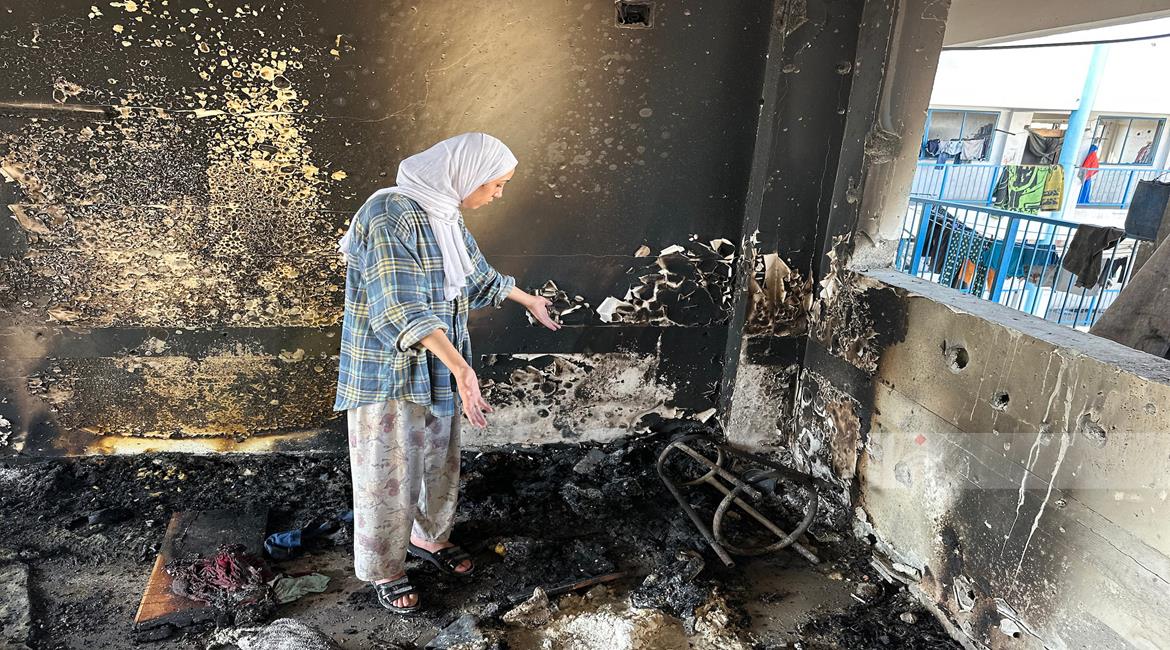 غزة - مواطنون يتفقدون الدمار الذي خلفه القصف الاسرائيلي على مدرسة تؤوي نازحين في خان يونس جنوب قطاع غزة