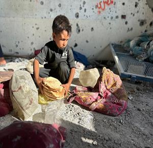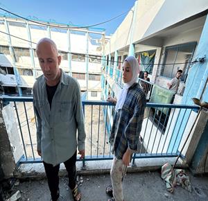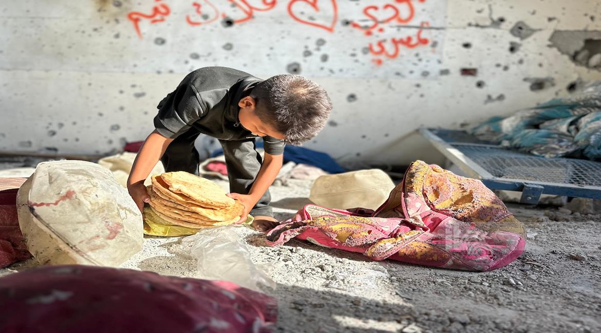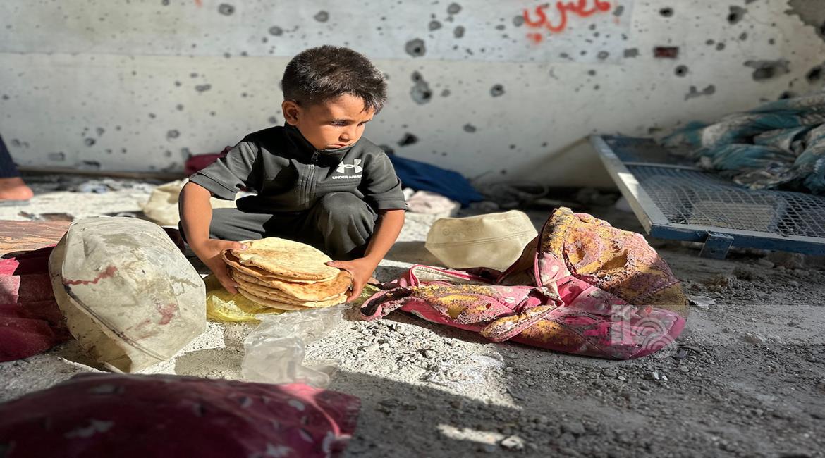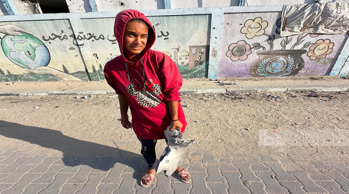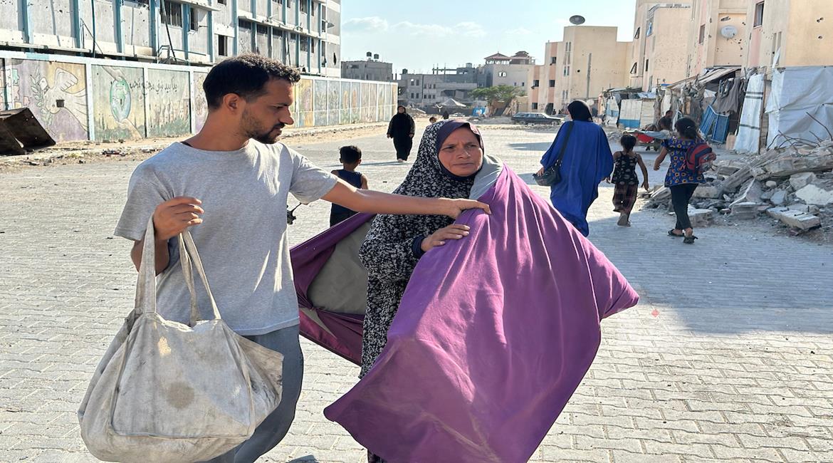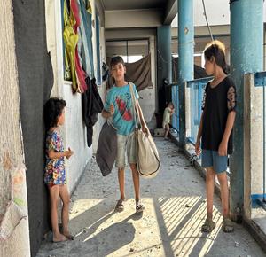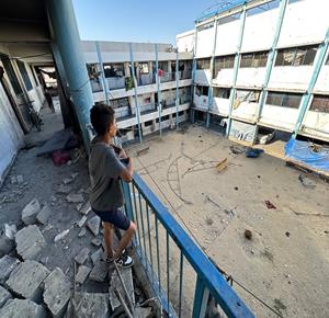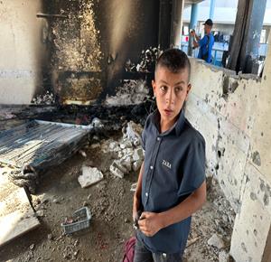 غزة - مواطنون يتفقدون الدمار الذي خلفه القصف الاسرائيلي على مدرسة تؤوي نازحين في خان يونس جنوب قطاع غزة