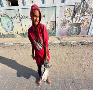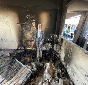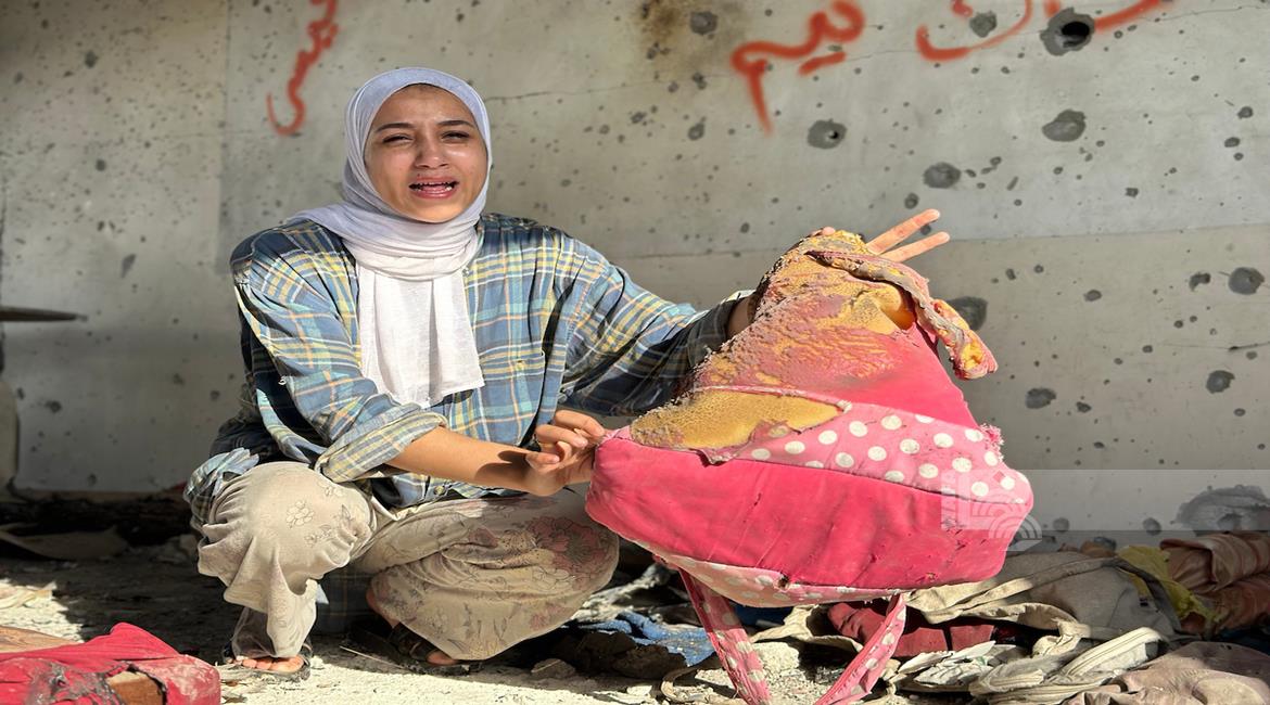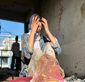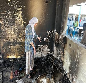 مواطنون يتفقدون الدمار في مستشفى الرنتيسي في حي النصر بمدينة غزة، بعد انسحاب القوات الإسرائيلية ووقف إطلاق النار في القطاع