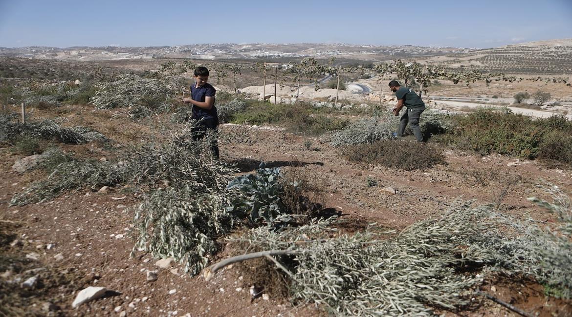 مواطنون يتفقدون أشجار الزيتون التي أتلفها مستعمرون في قرية المنيه قرب بيت لحم