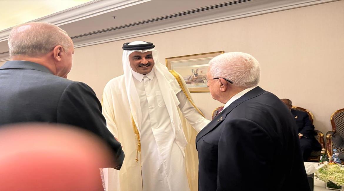 الدوحة - الرئيس محمود عباس، يلتقي أمير دولة قطر الشيخ تميم بن حمد آل ثاني، على هامش اجتماعات القمة العربية الإسلامية الطارئة لبحث الهجوم الإسرائيلي على دولة قطر