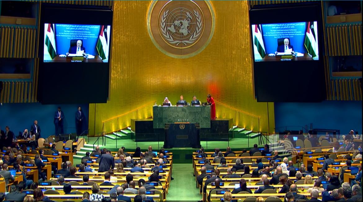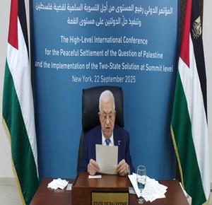 رام الله - الرئيس محمود عباس، في كلمته عبر الفيديو أمام المؤتمر الدولي رفيع المستوى للتسوية السلمية لقضية فلسطين وتنفيذ حل الدولتين