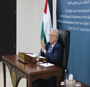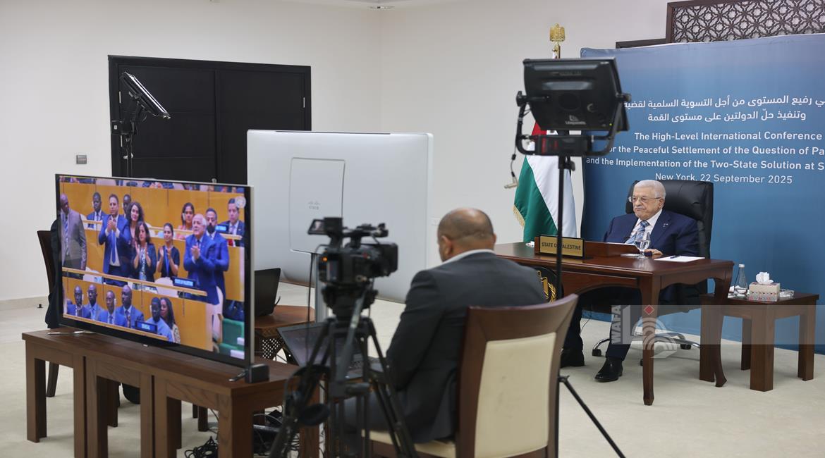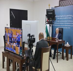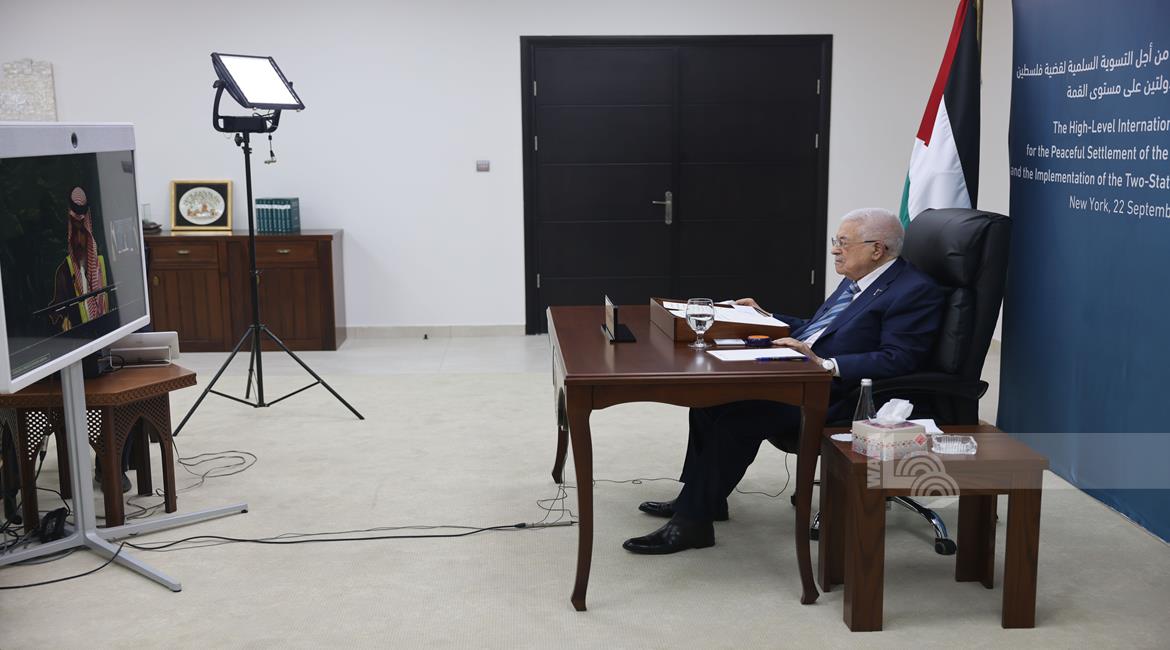 الرئيس محمود عباس، في كلمته عبر الفيديو أمام المؤتمر الدولي رفيع المستوى للتسوية السلمية لقضية فلسطين وتنفيذ حل الدولتين