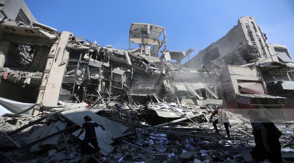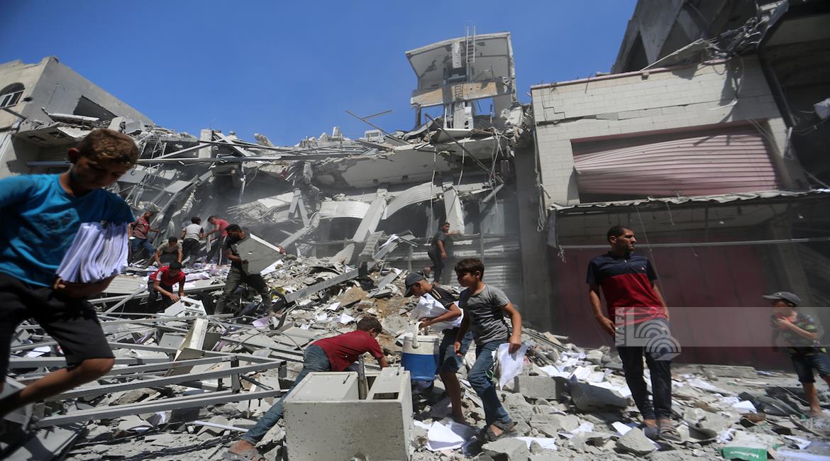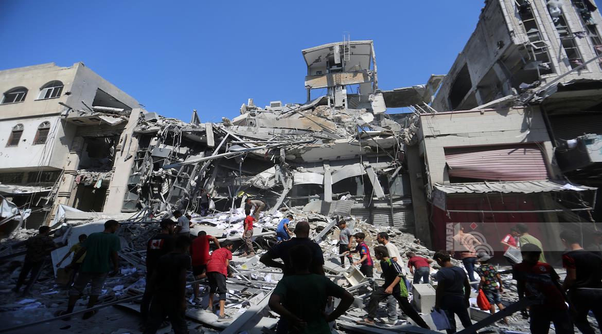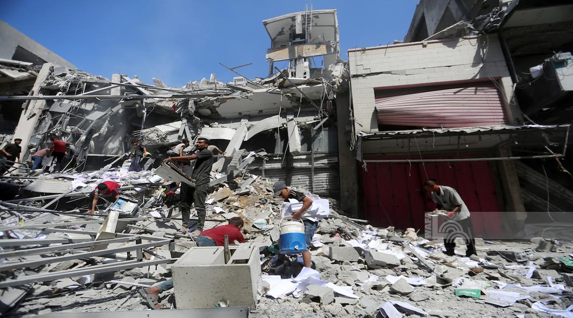 غزة - مواطنون يتفقدون مبنى بنك فلسطين الذي دمرته قوات الاحتلال الاسرائيلي بمدينة غزة
