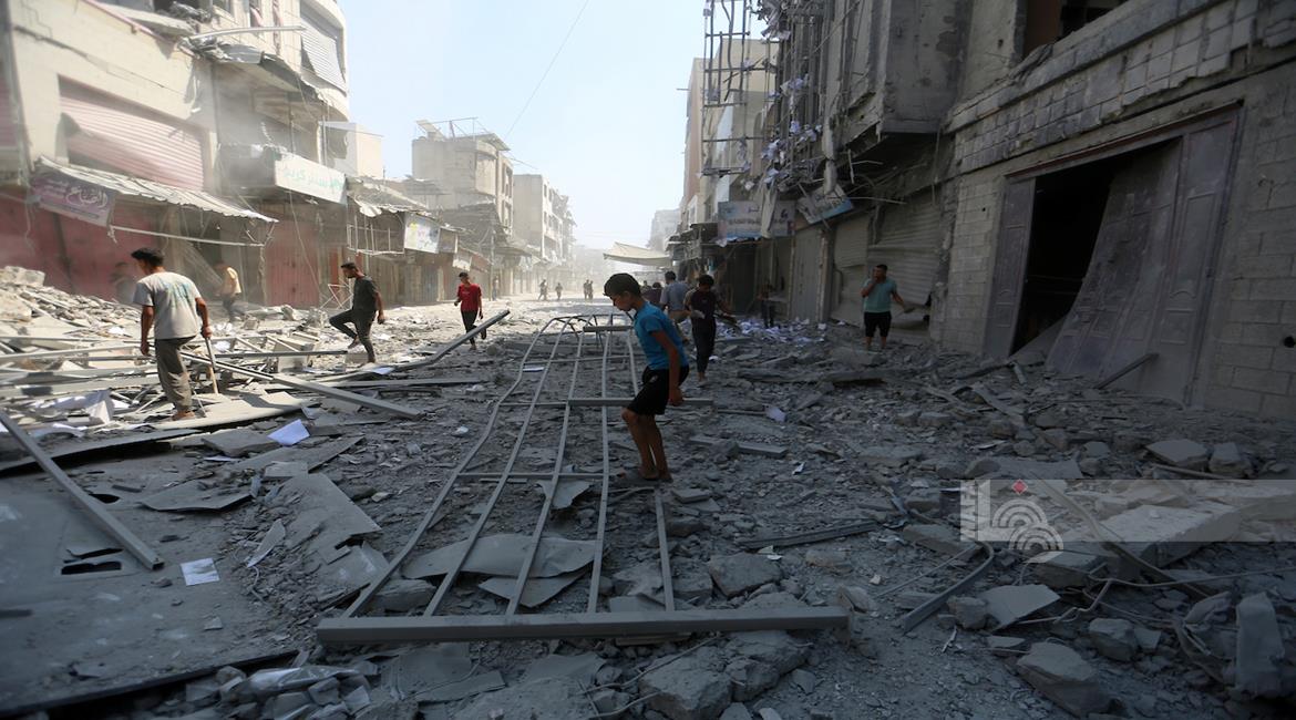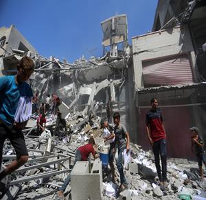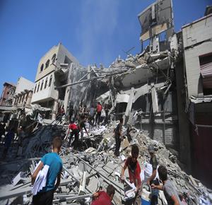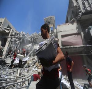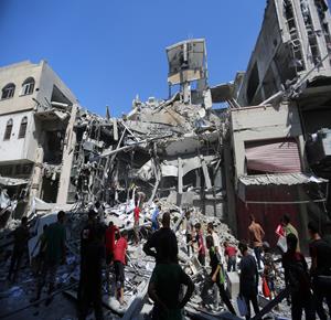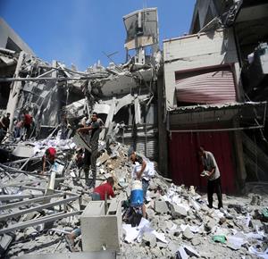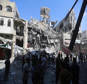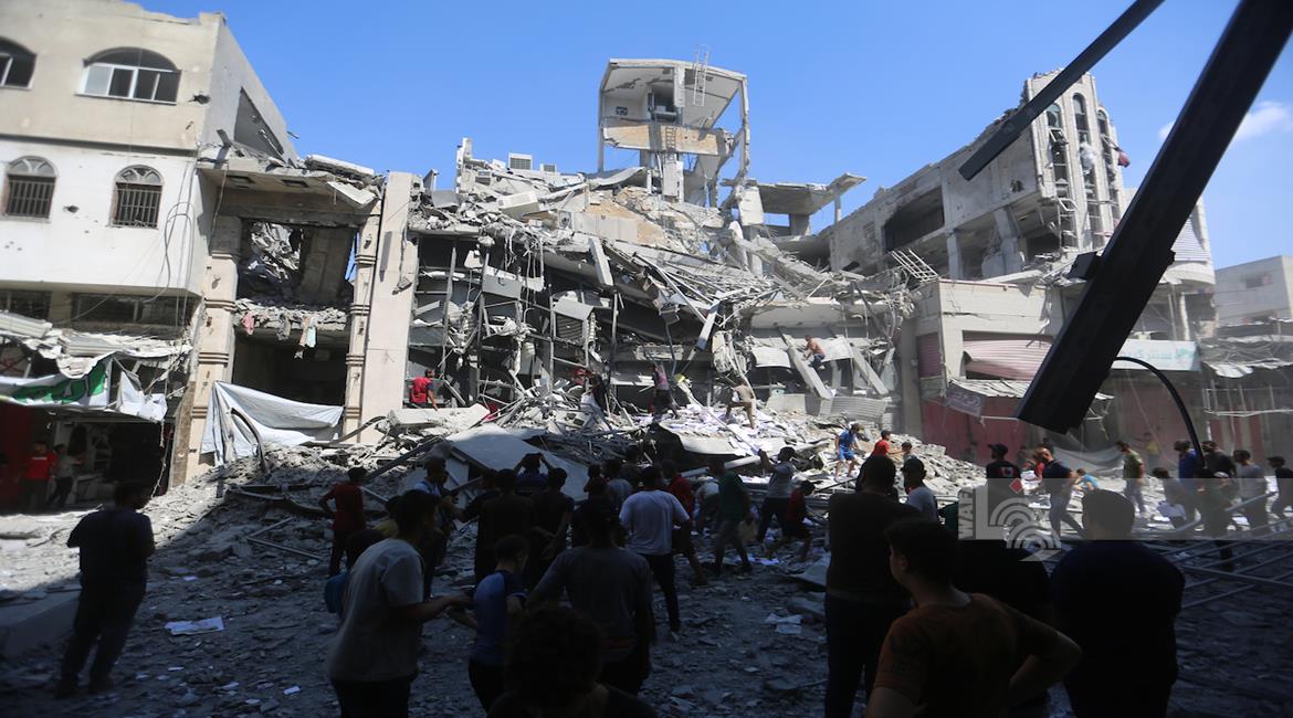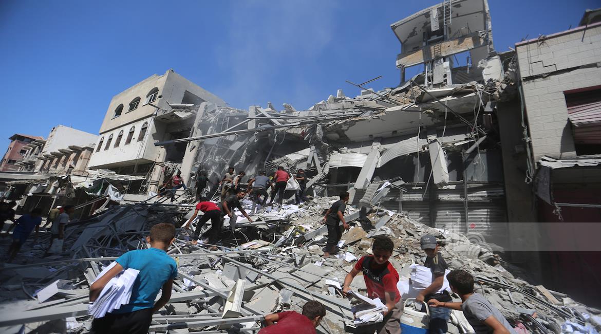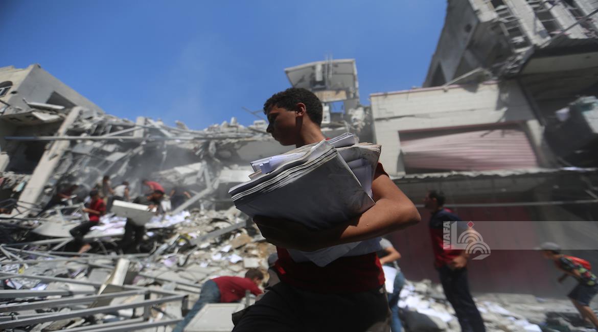 غزة - مواطنون يتفقدون مبنى بنك فلسطين الذي دمرته قوات الاحتلال الاسرائيلي بمدينة غزة