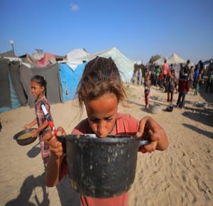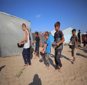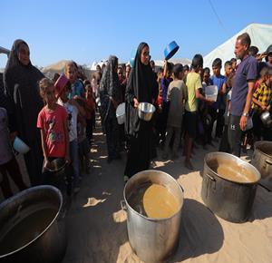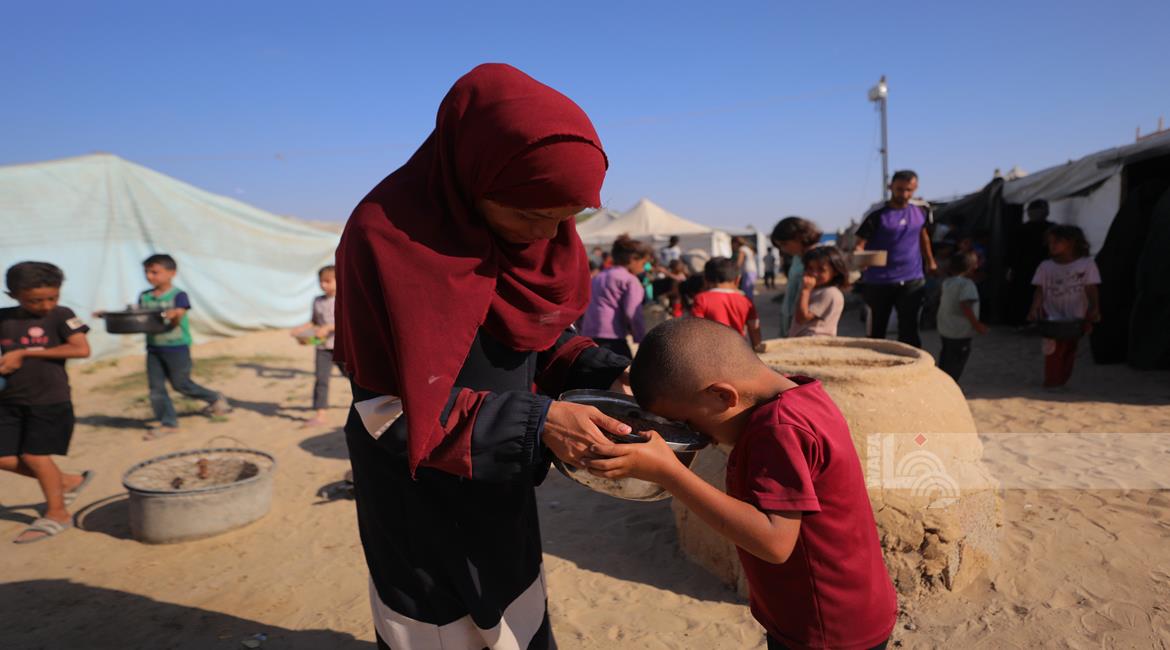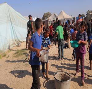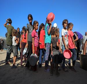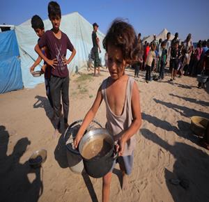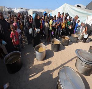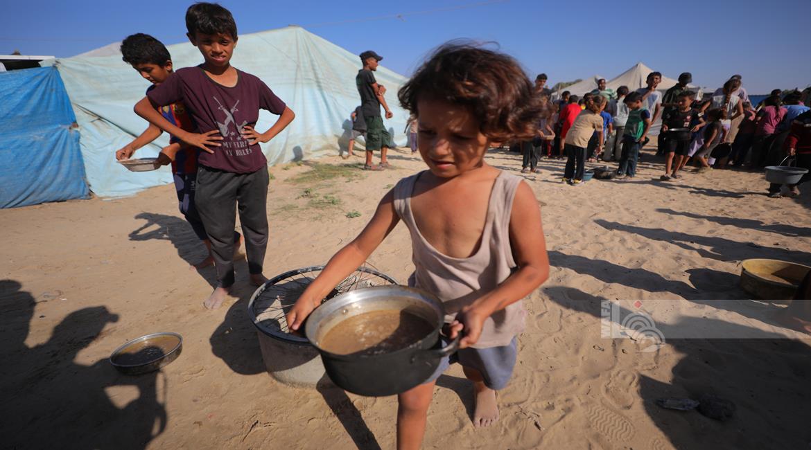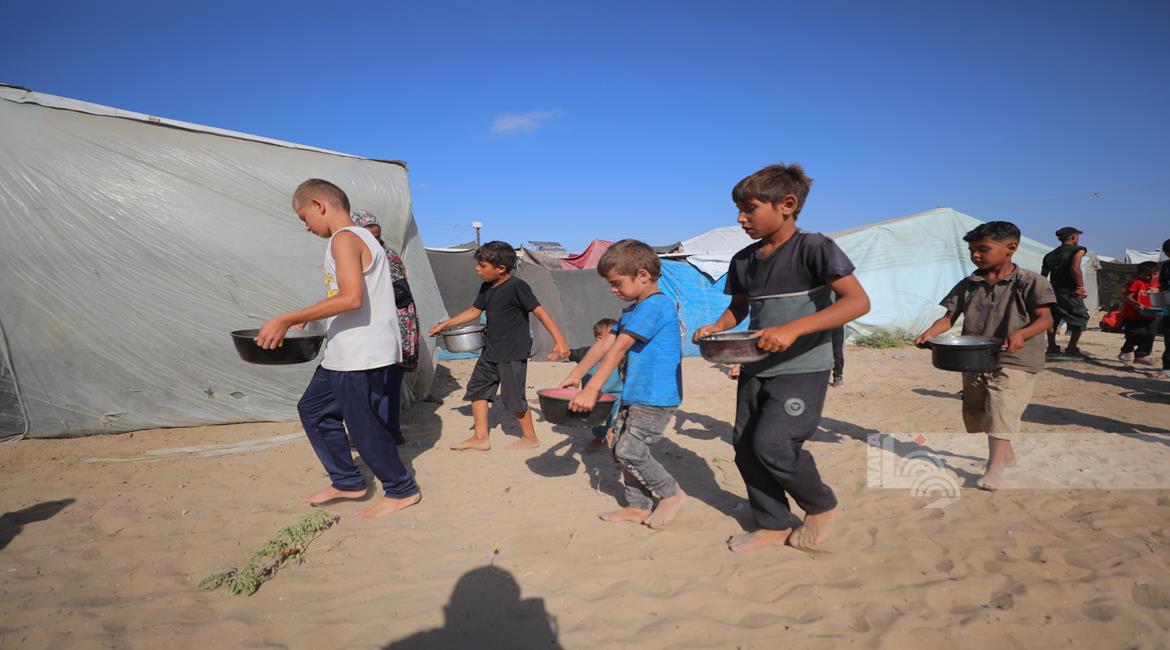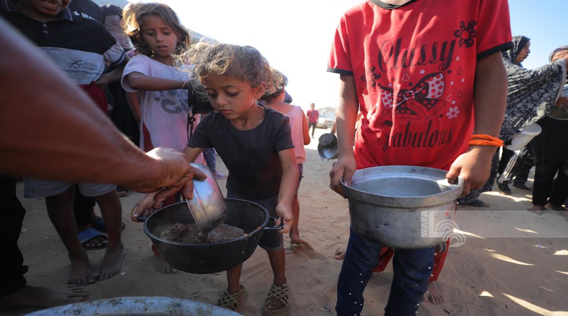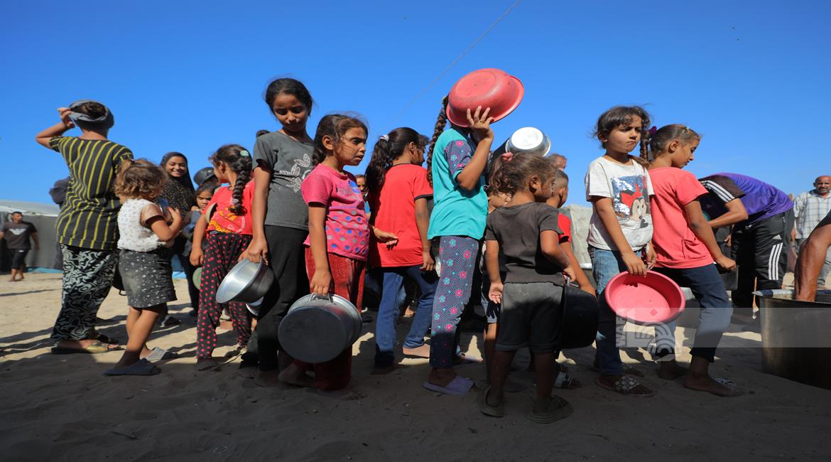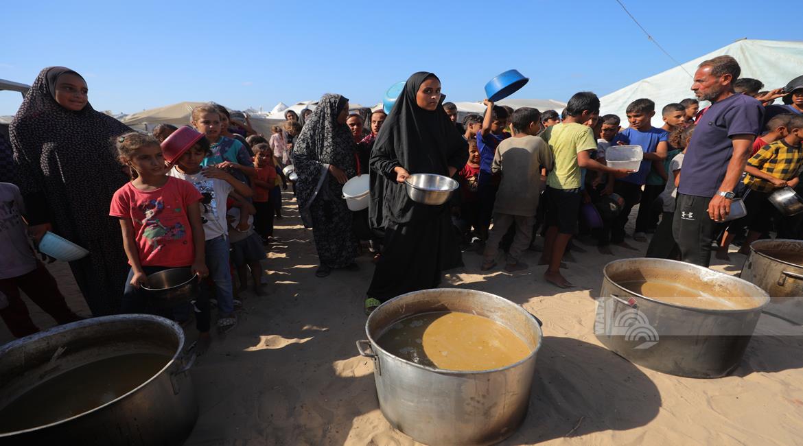 غزة - مواطنون يتجمعون للحصول على الطعام المجاني من احدى التكيات الخيرية في مخيم النصيرات وسط قطاع غزة