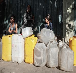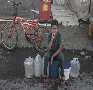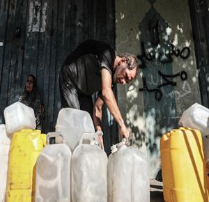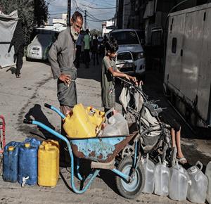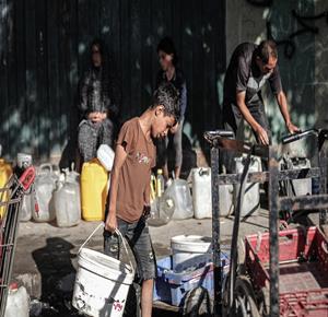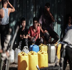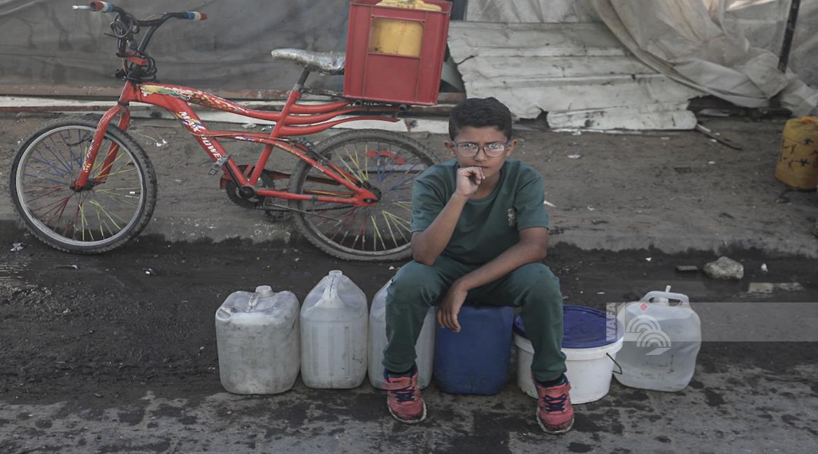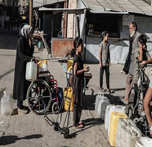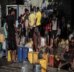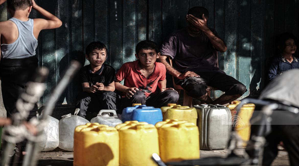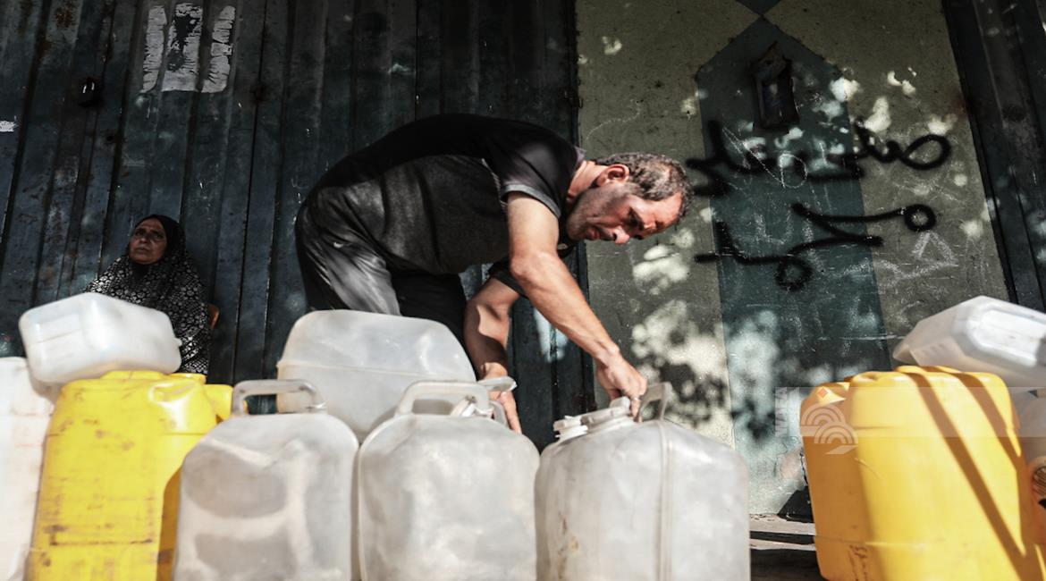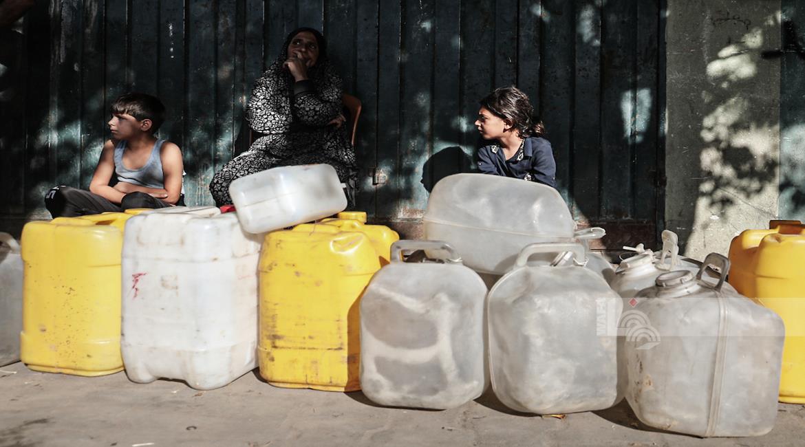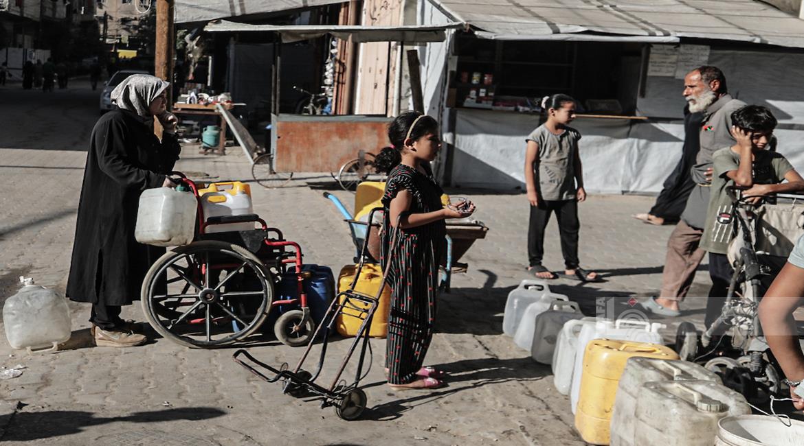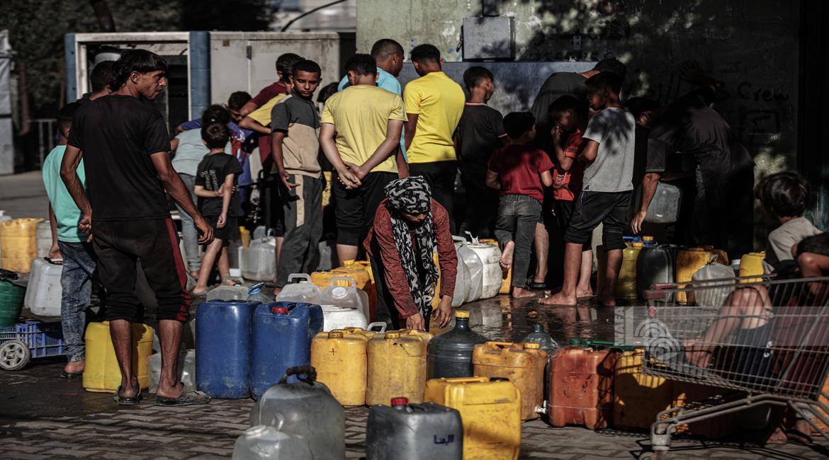 غزة - مواطنون يتجمعون للحصول على مياه الشرب في مخيم النصيرات وسط قطاع غزة