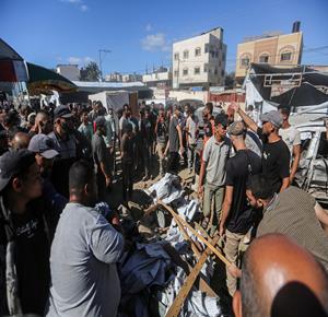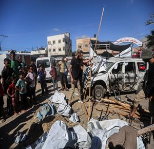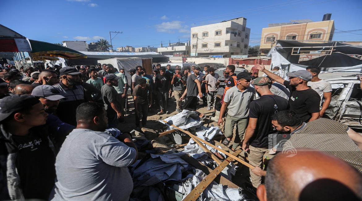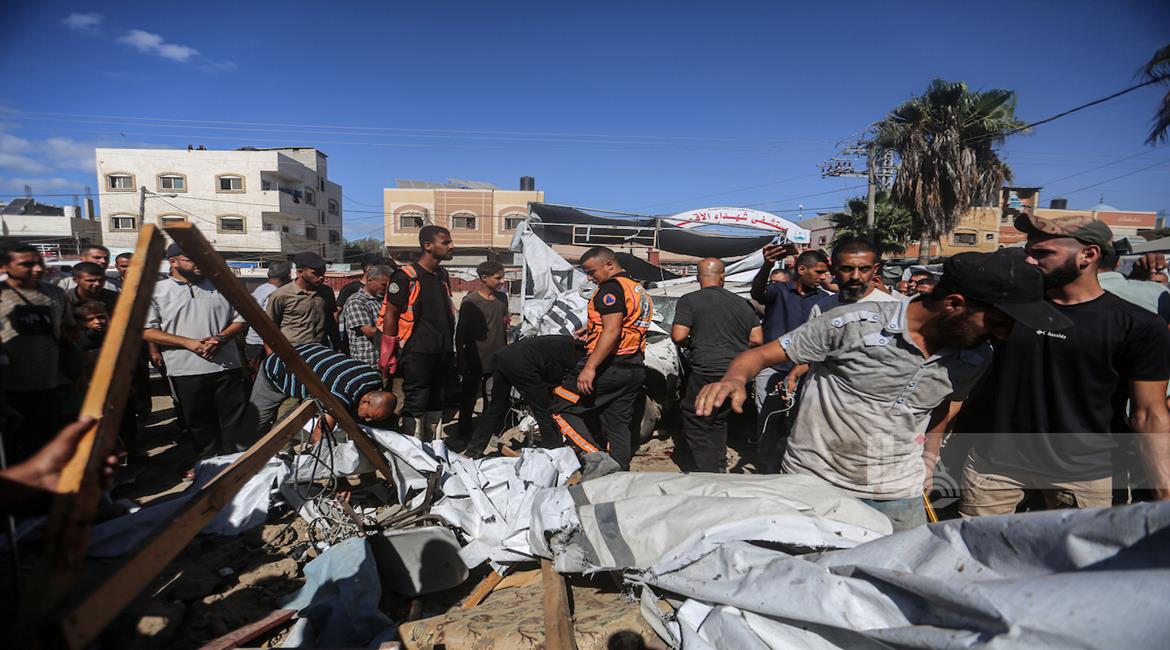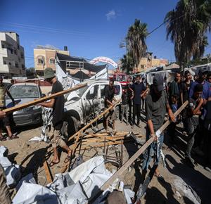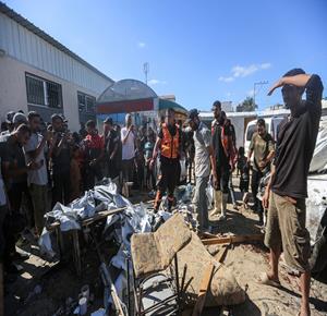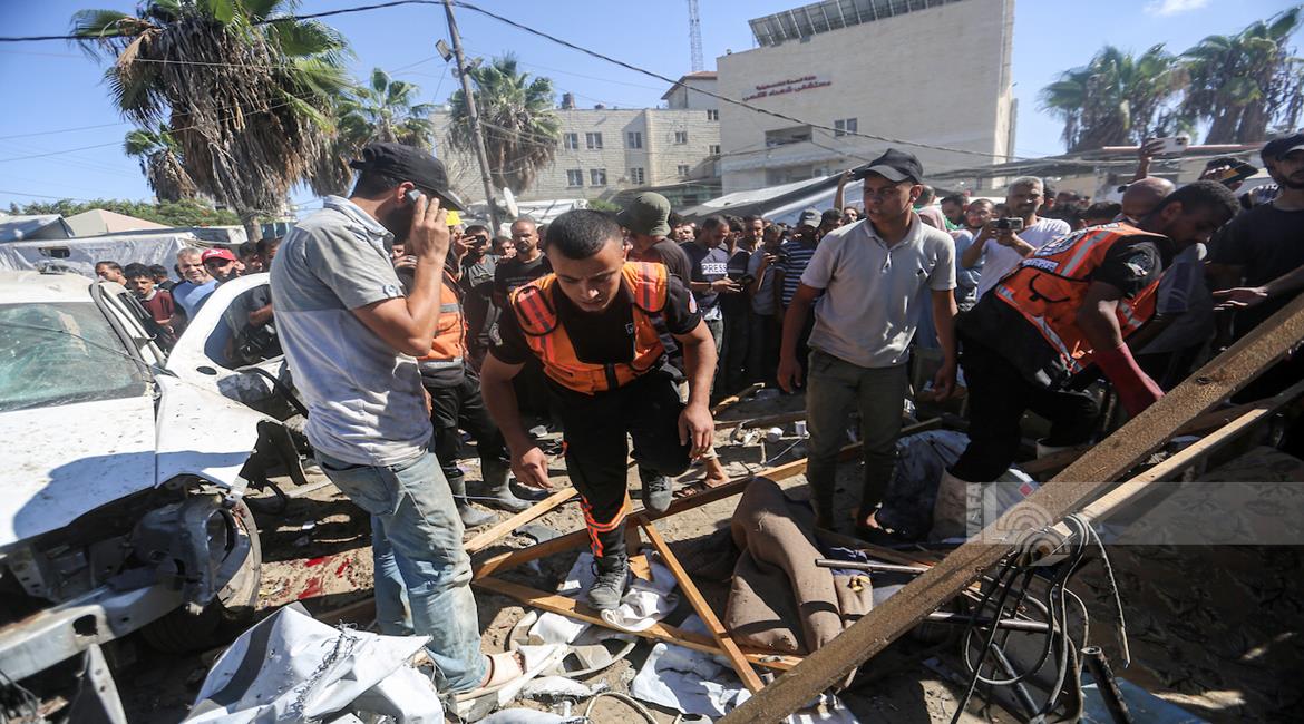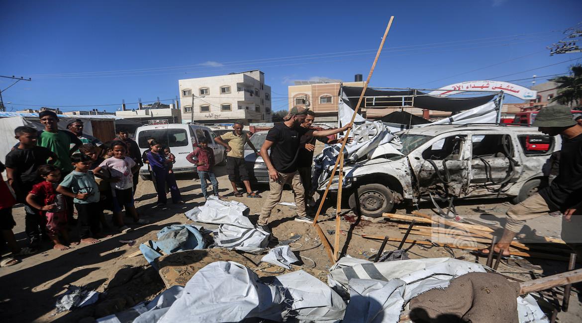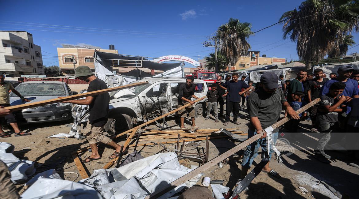 غزة - مواطنون يتفقدون موقع غارة اسرائيلية على خيمة داخل مستشفى شهداء الأقصى في دير البلح وسط قطاع غزة