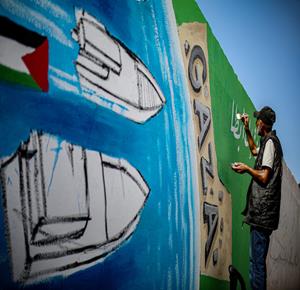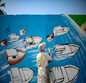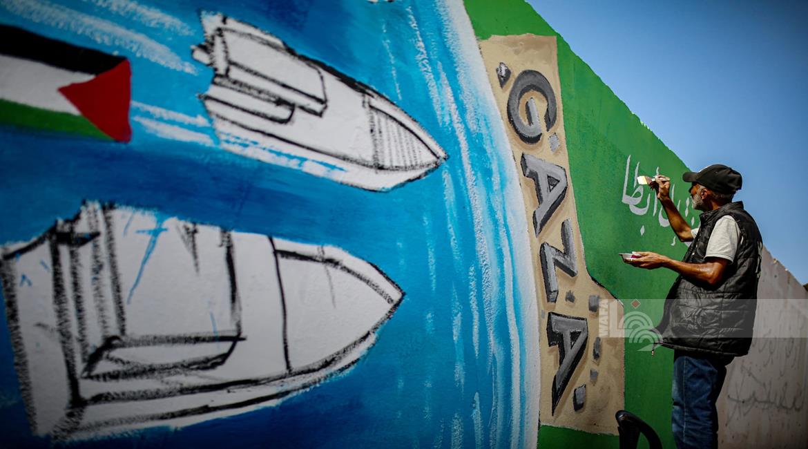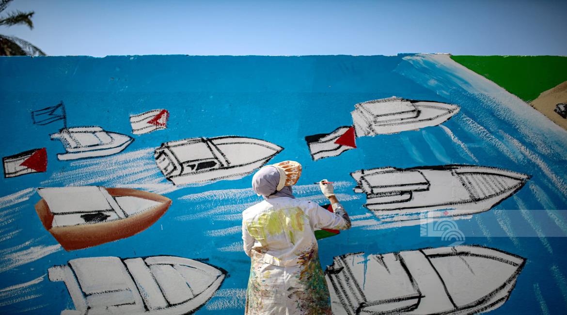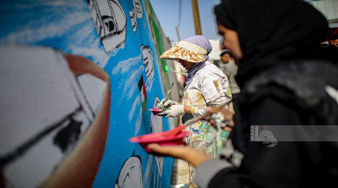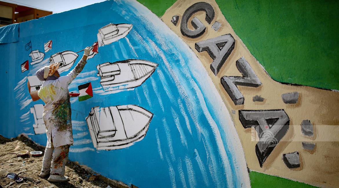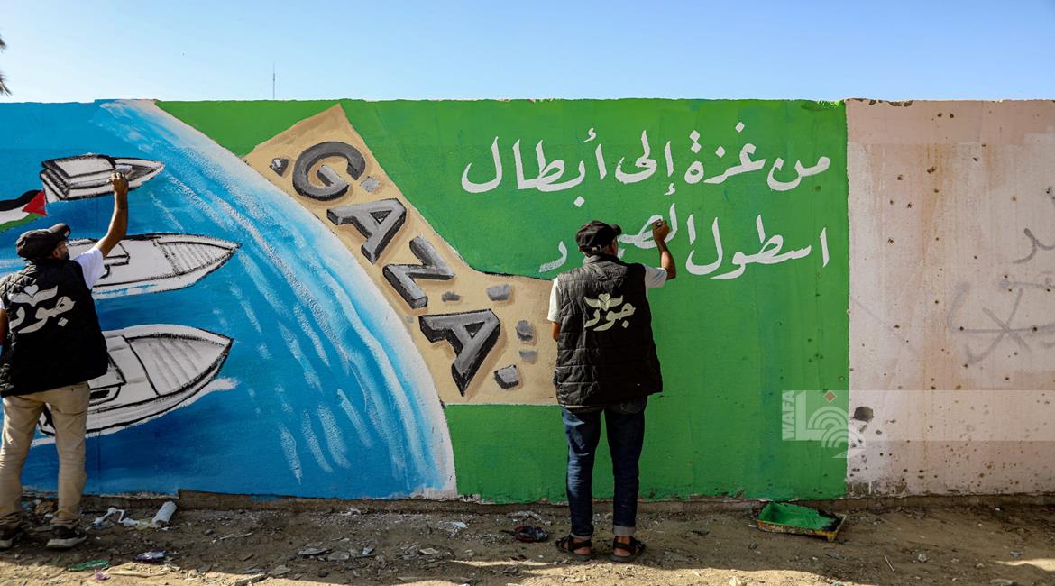 غزة - فنانون يرسمون جداريات في دير البلح ترحيبا بأسطول الصمود العالمي الذي منعه الاحتلال من الوصول إلى غزة