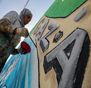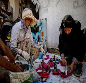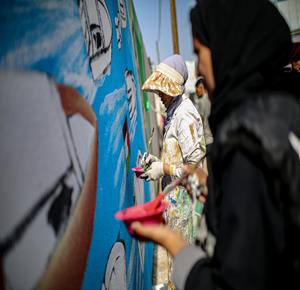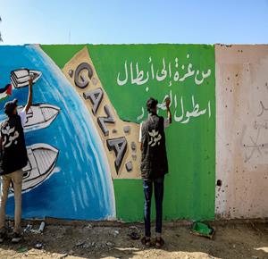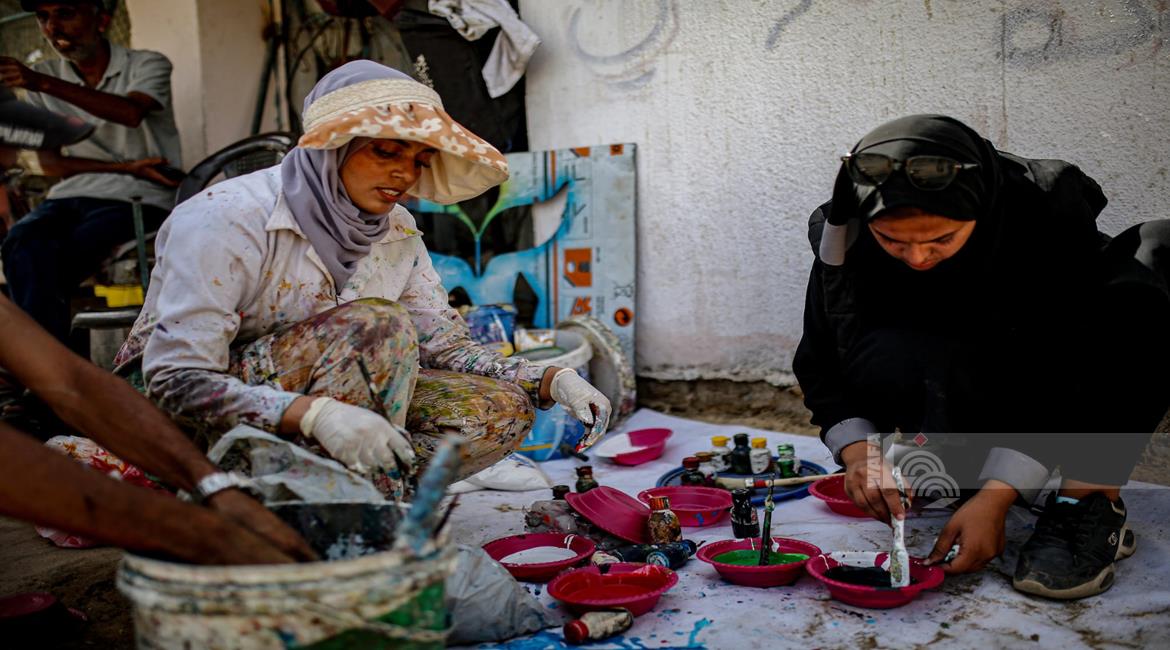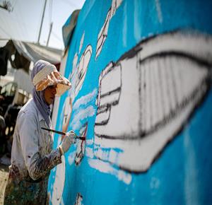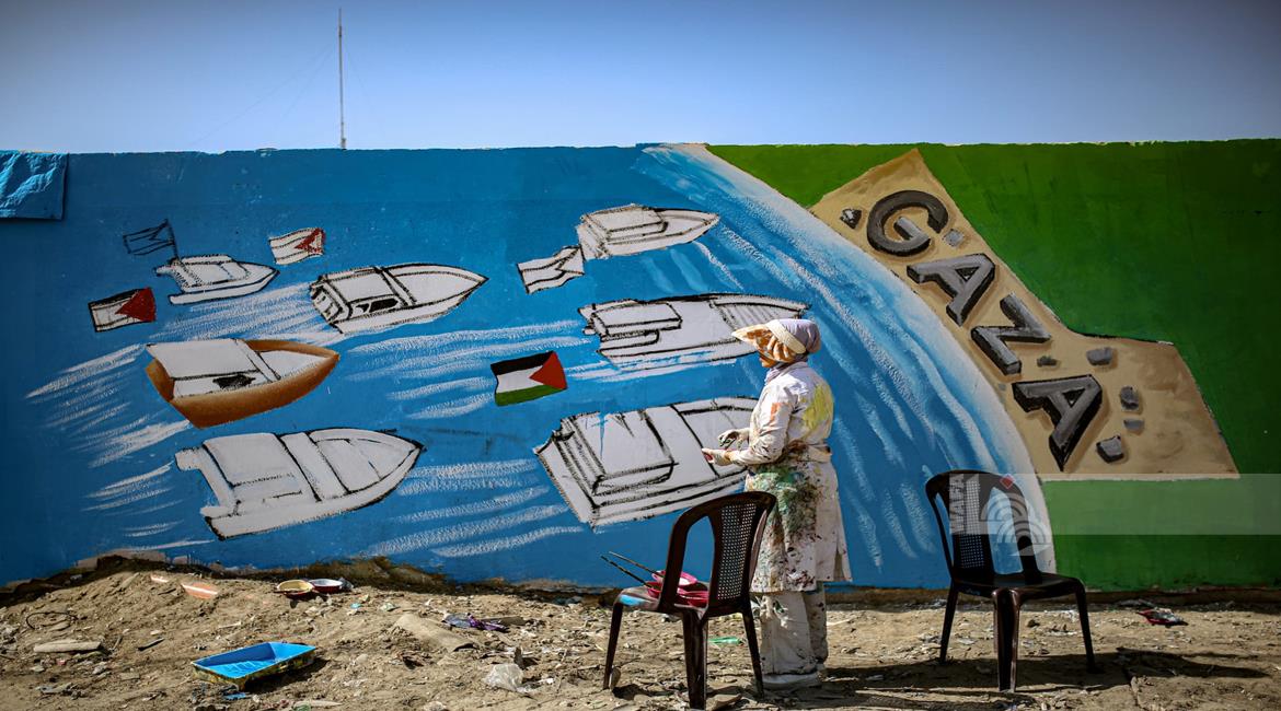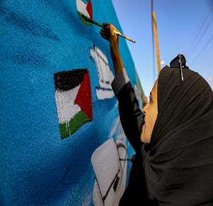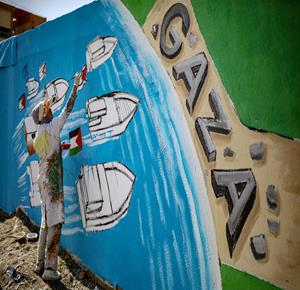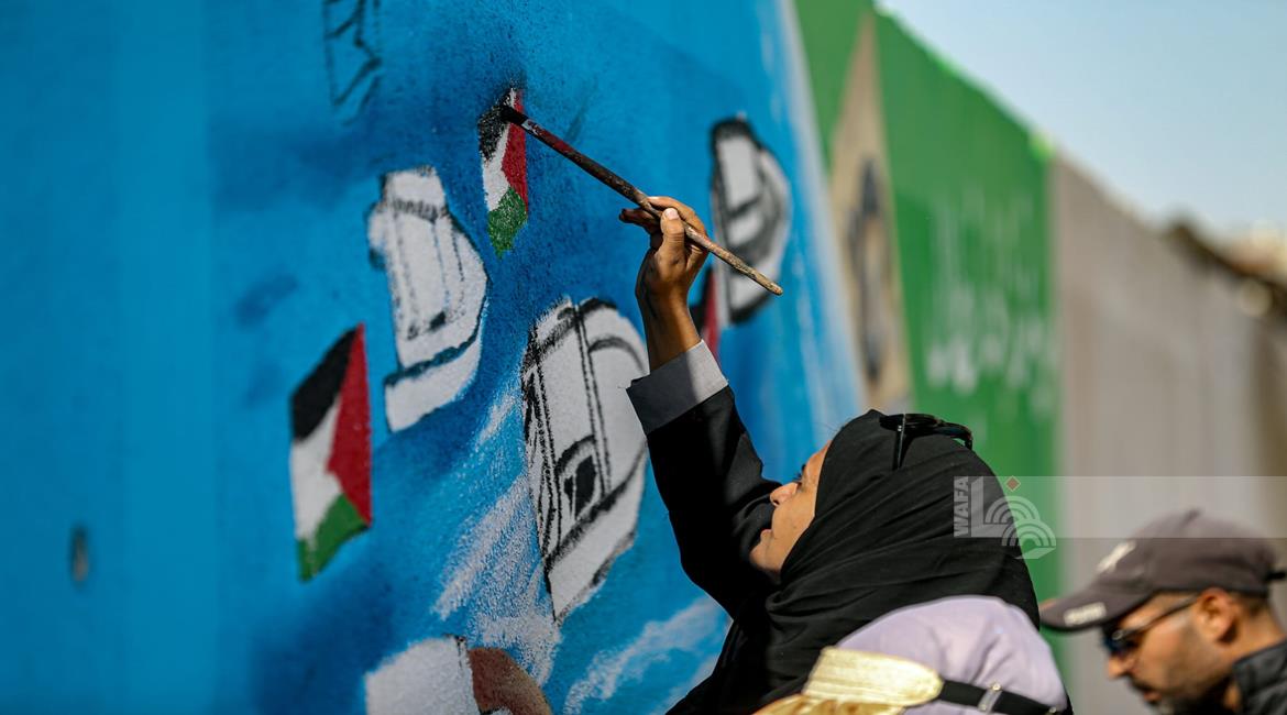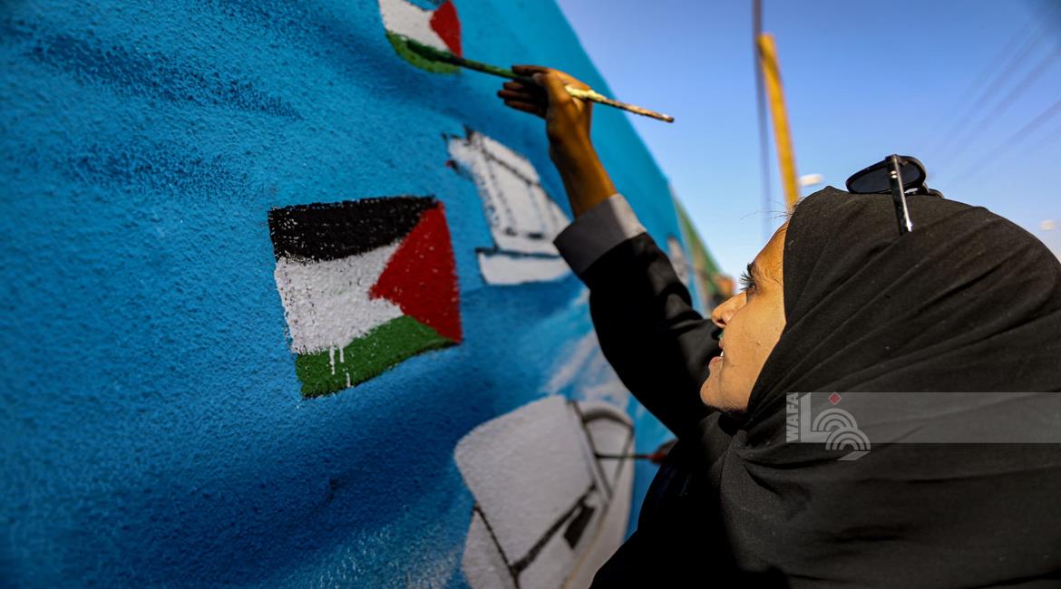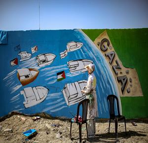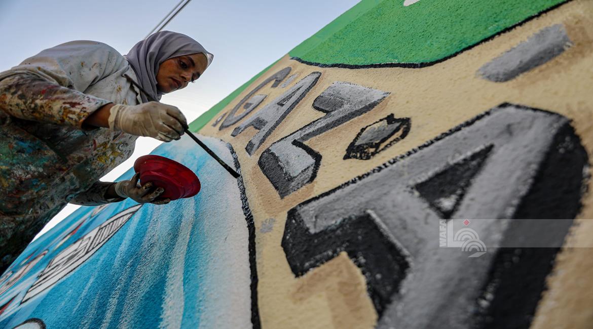 غزة - فنانون يرسمون جداريات في دير البلح ترحيبا بأسطول الصمود العالمي الذي منعه الاحتلال من الوصول إلى غزة