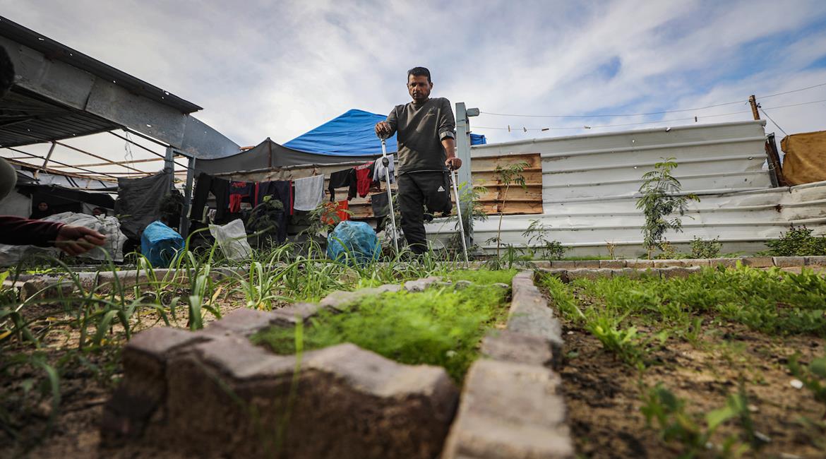 محمد نصير (44 عاما) فقد منزله وساقه اليسرى في عدوان الاحتلال على قطاع غزة، يستغل أرضه في زراعة الخضراوات على أمل تحسين ظروف معيشته والسفر من أجل العلاج