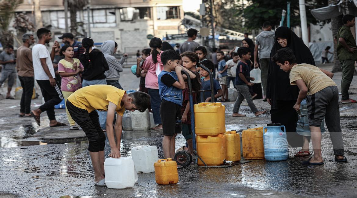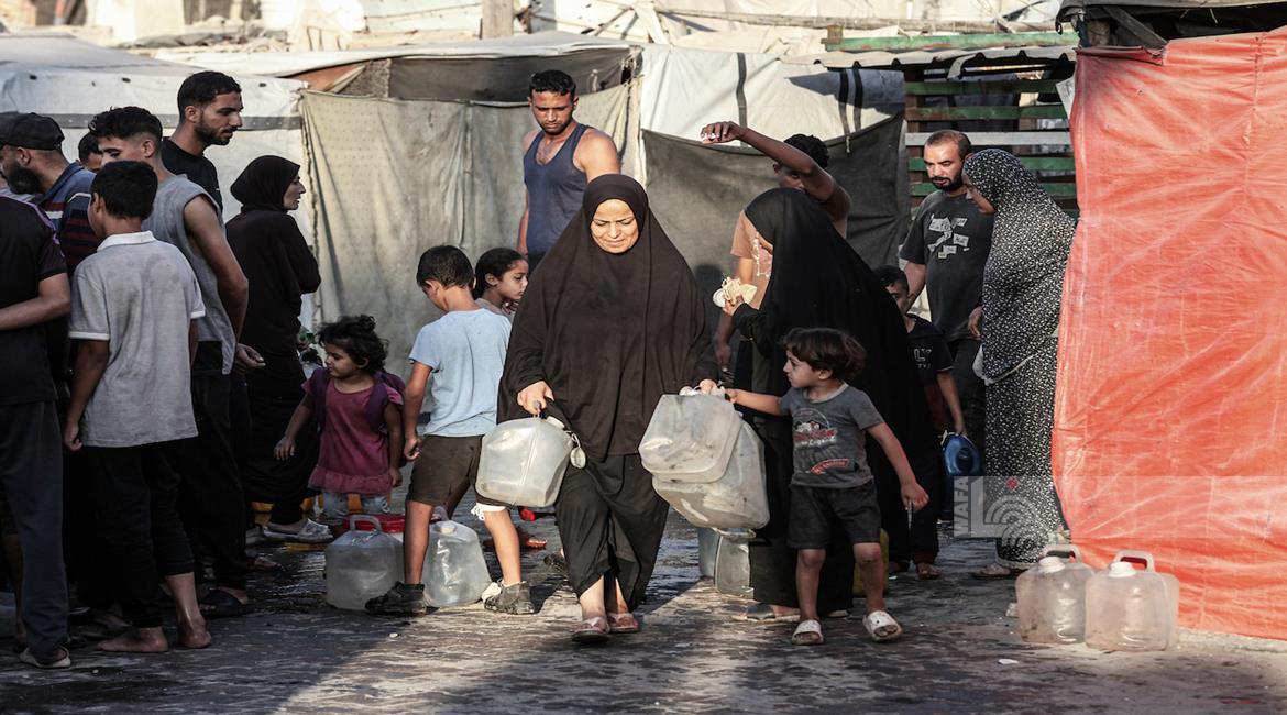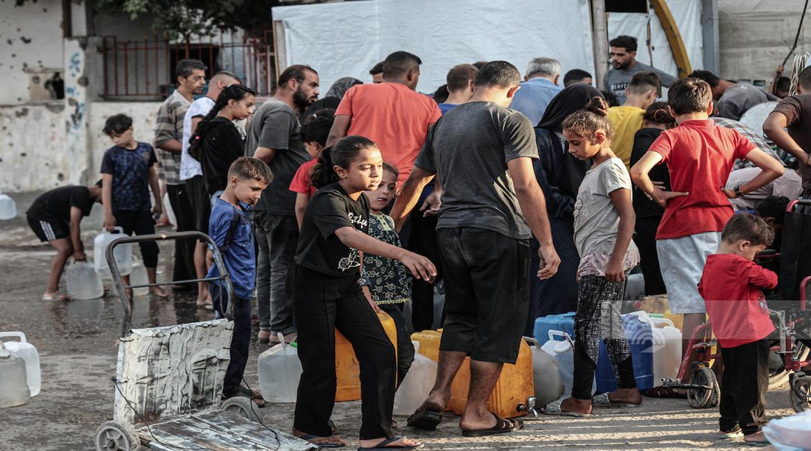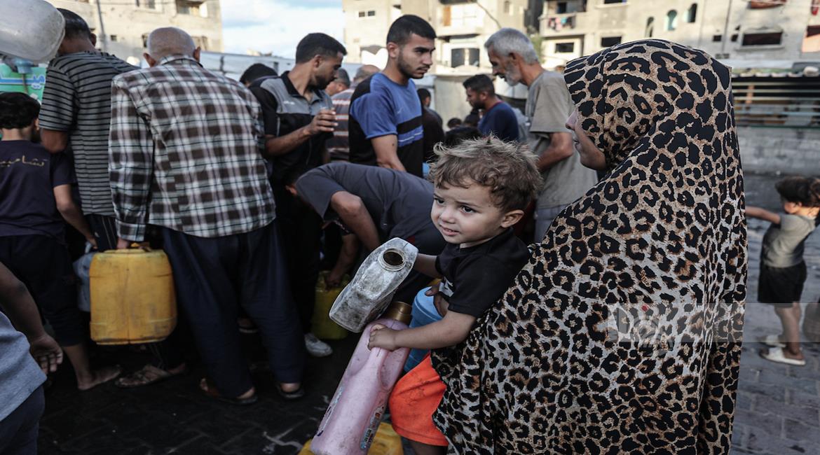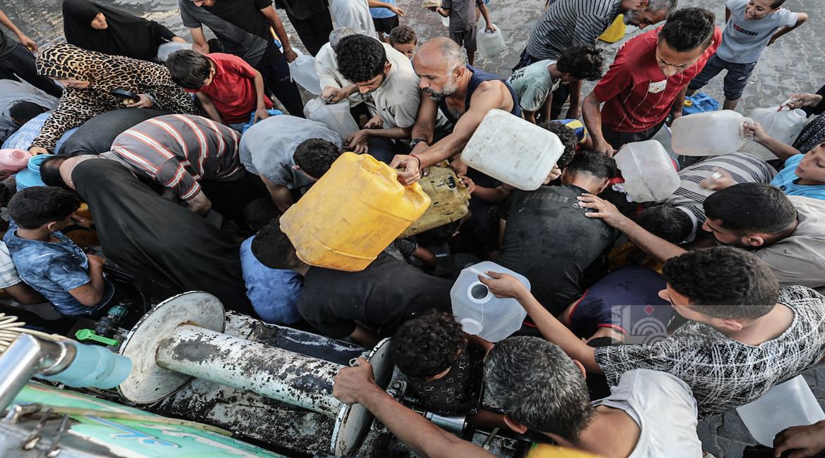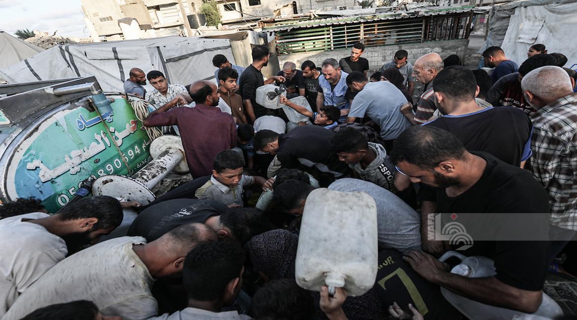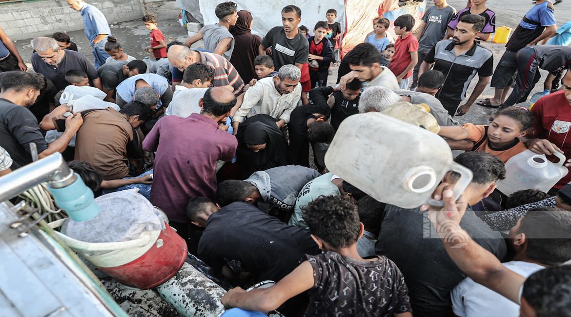 غزة - نازحون يتزاحمون في طوابير للحصول على مياه الشرب في مخيم البريج وسط قطاع غزة