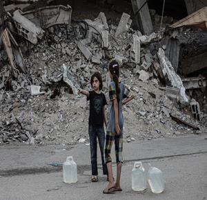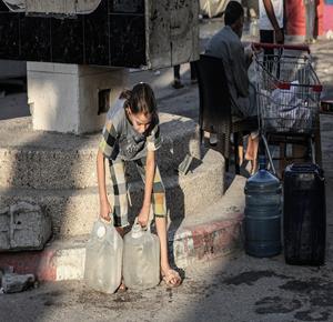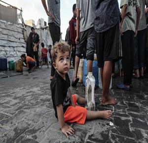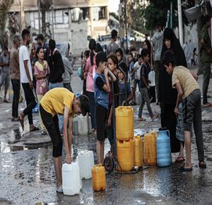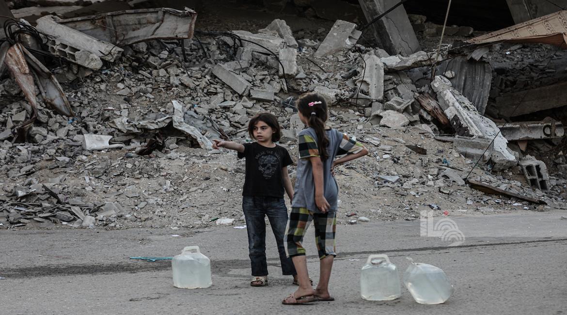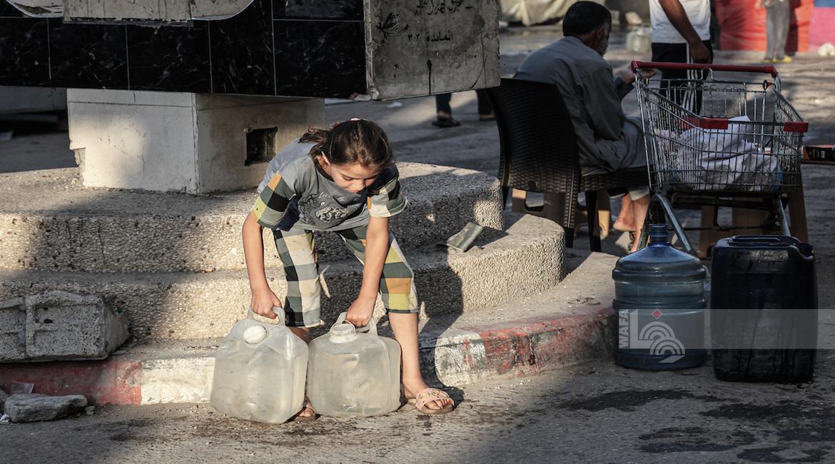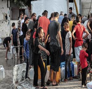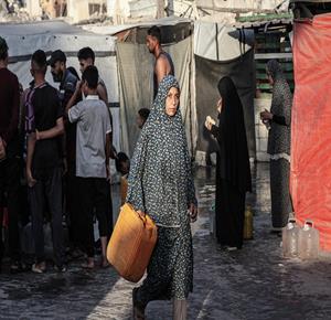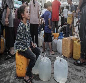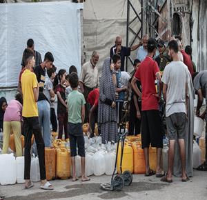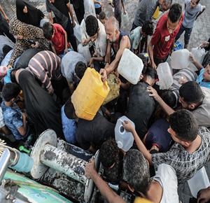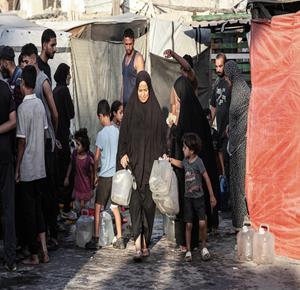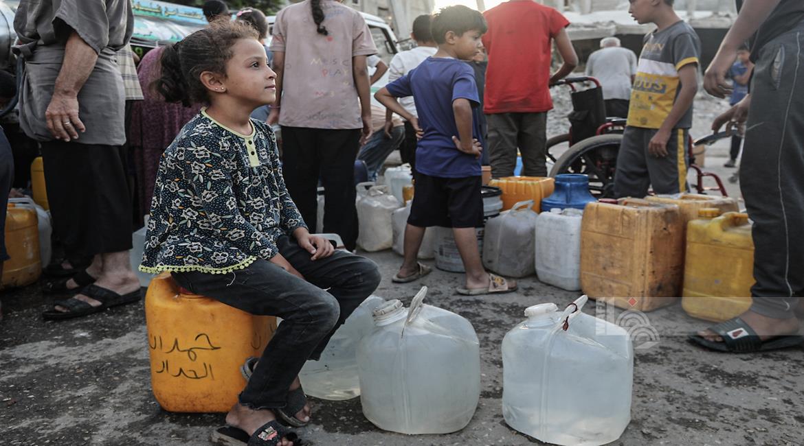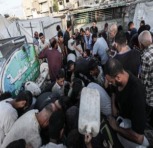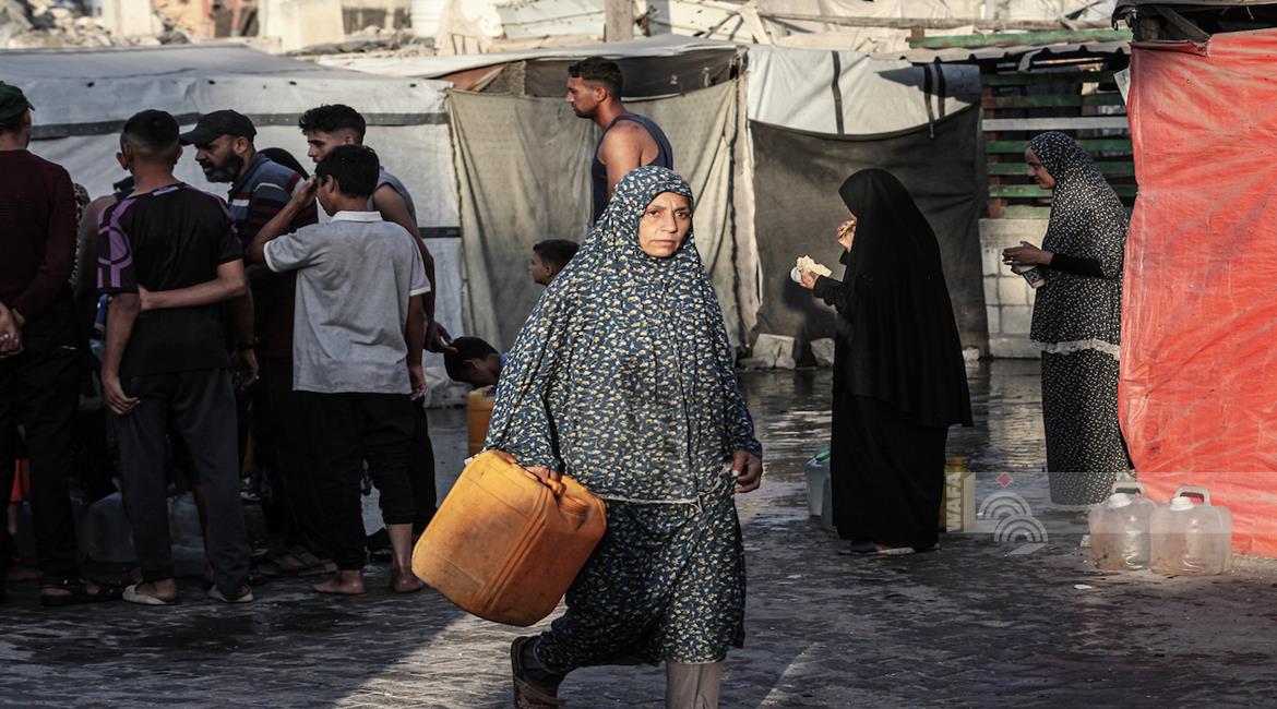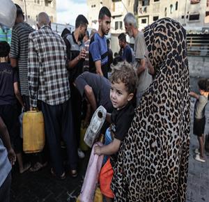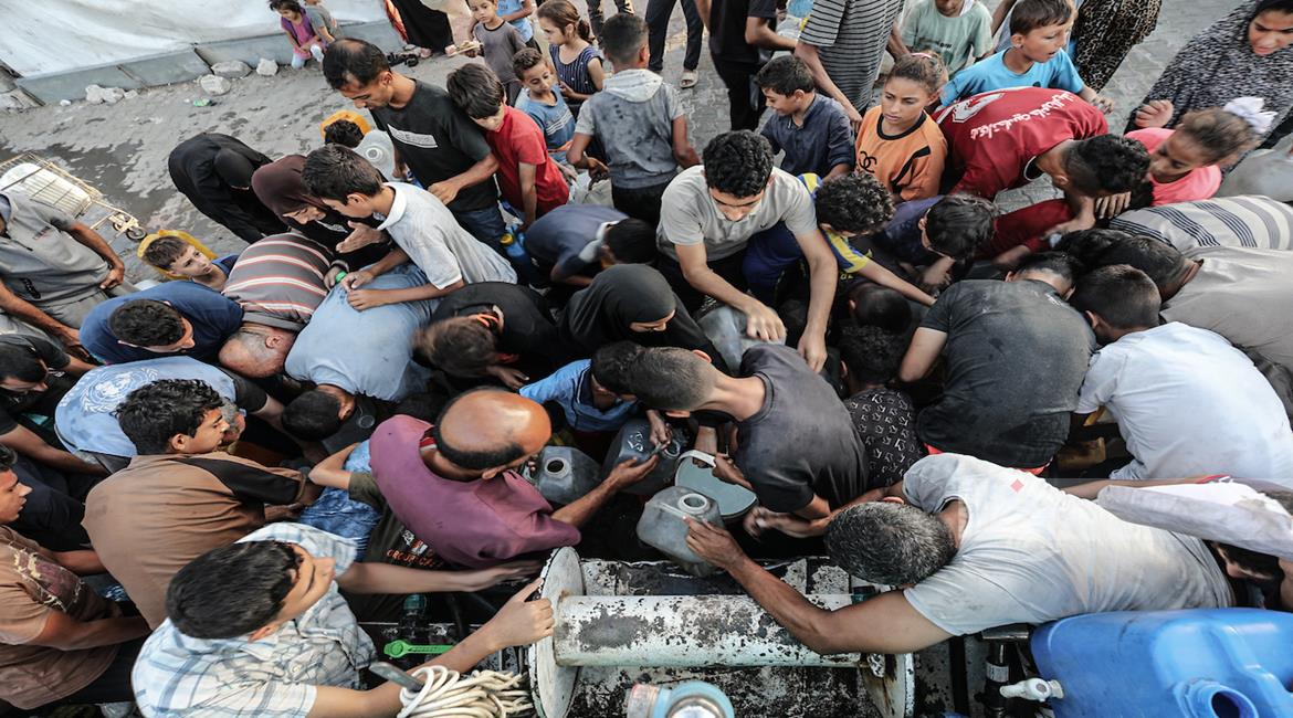 غزة - نازحون يتزاحمون في طوابير للحصول على مياه الشرب في مخيم البريج وسط قطاع غزة