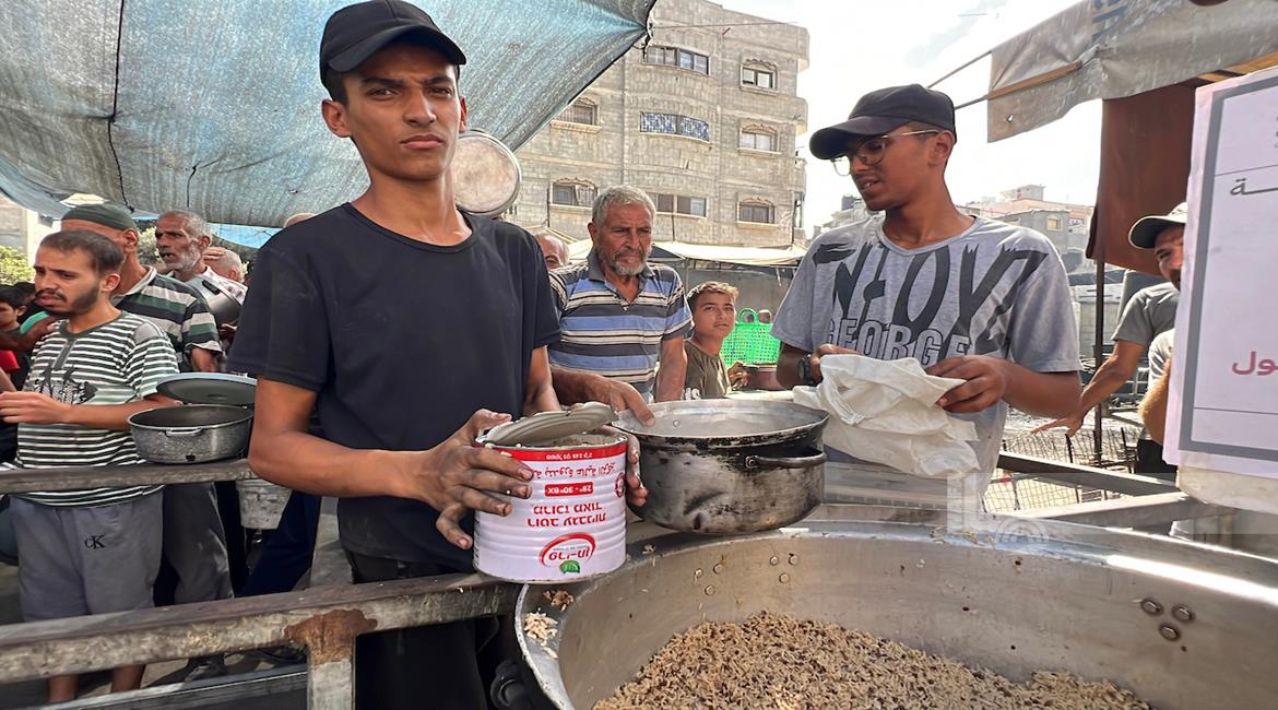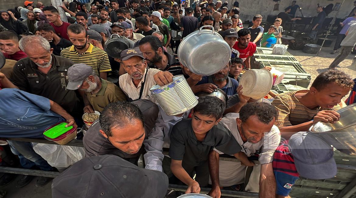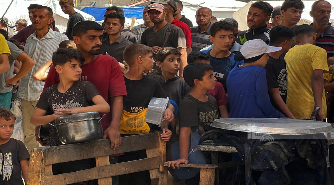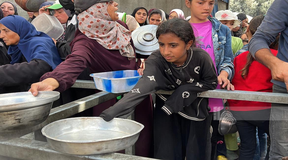 غزة - مواطنون يتجمعون للحصول على طعام مجاني من تكية خيرية في مخيم النصيرات وسط قطاع غزة
