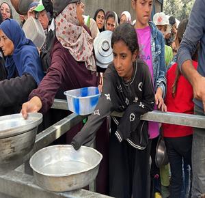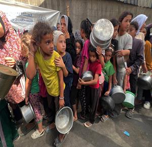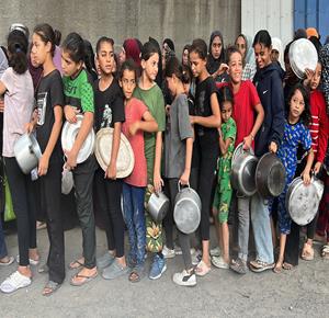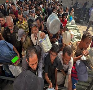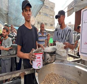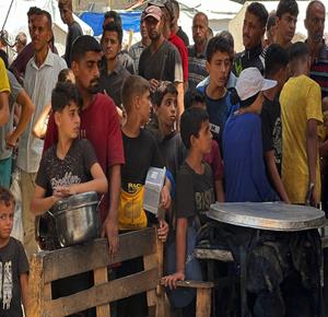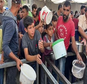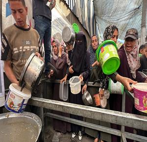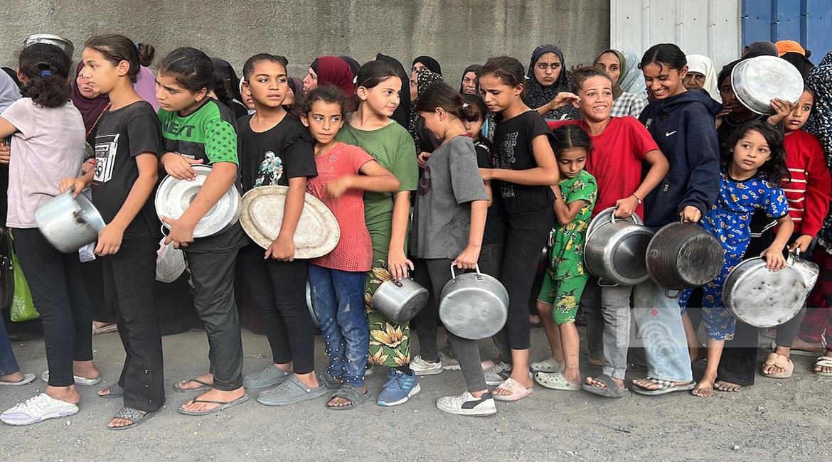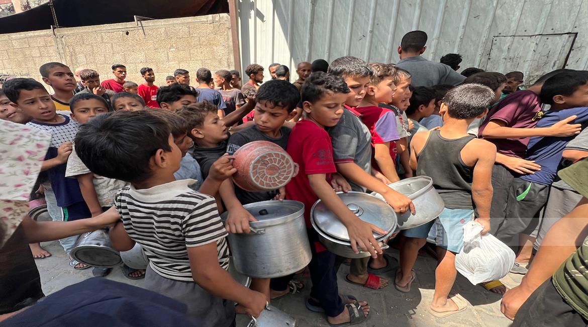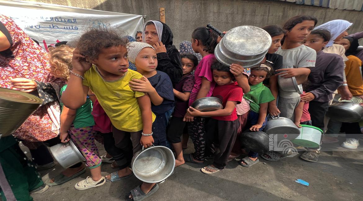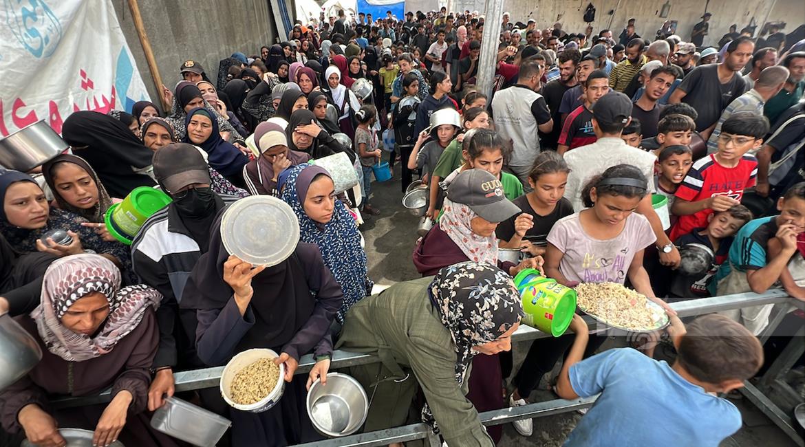 غزة - مواطنون يتجمعون للحصول على طعام مجاني من تكية خيرية في مخيم النصيرات وسط قطاع غزة