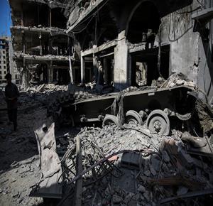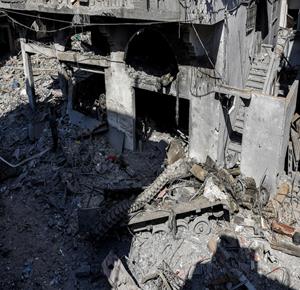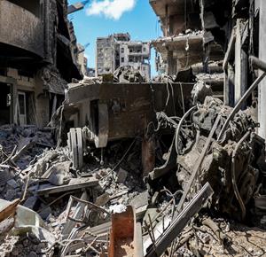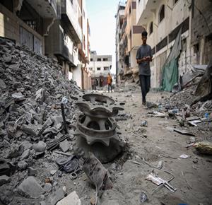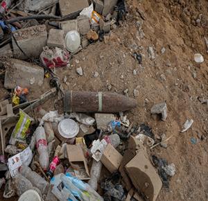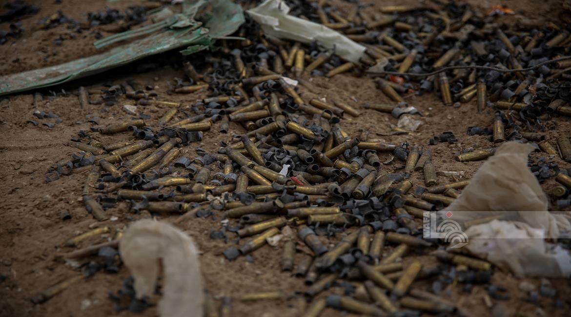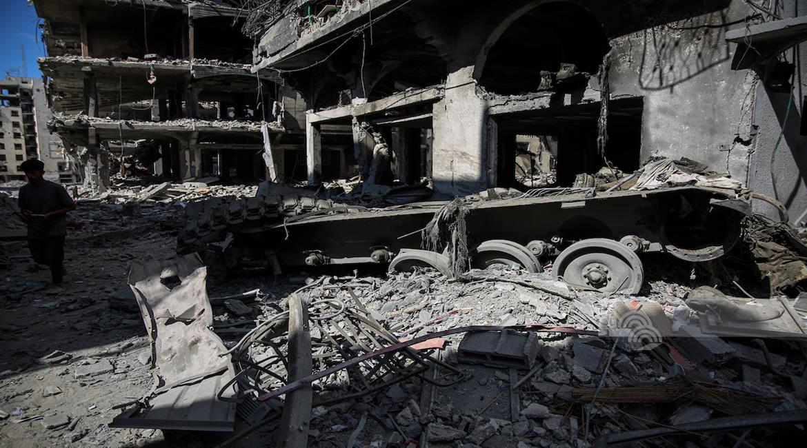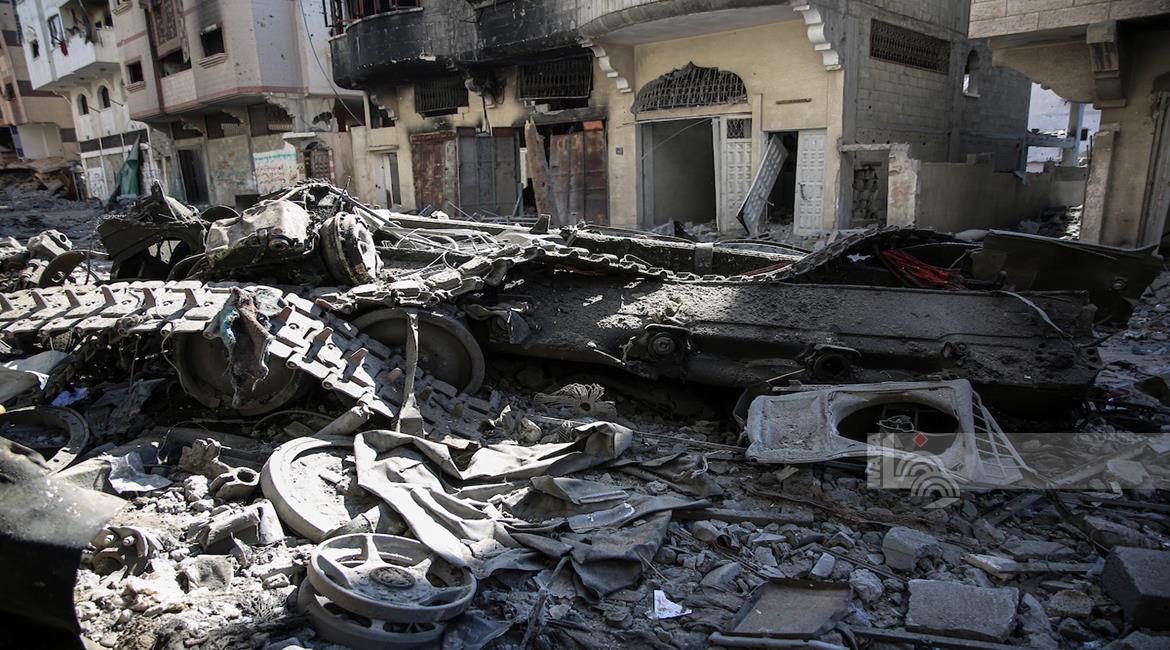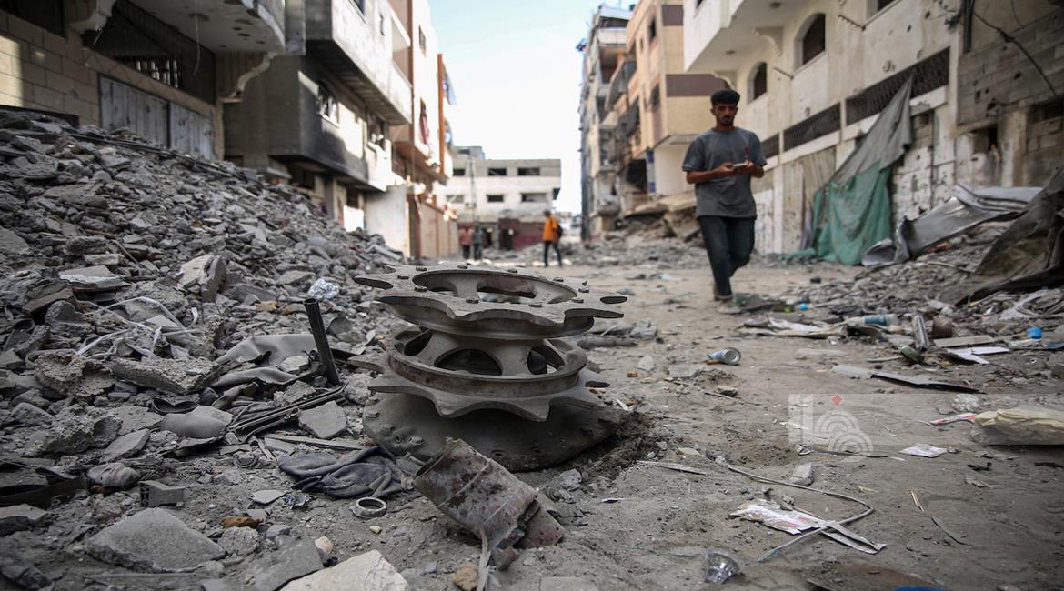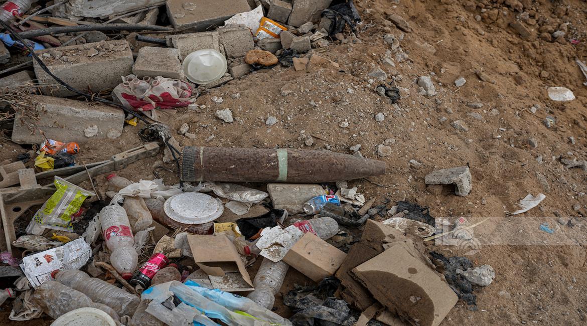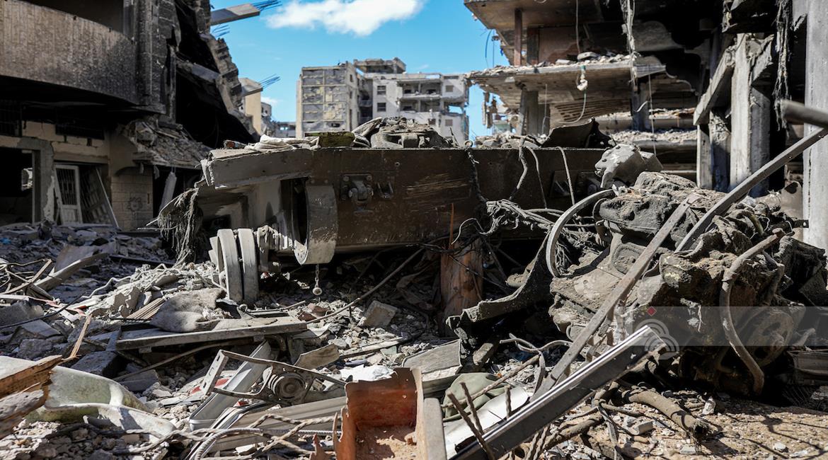 غزة - بقايا ذخائر عسكرية وروبوت متفجر وشعارات باللغة العبرية خلفها الاحتلال وسط أنقاض المباني المدمرة في منطقة الكرامة شمال غزة
