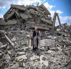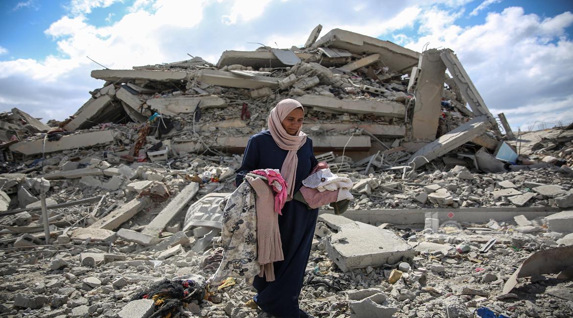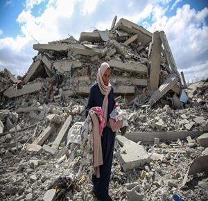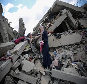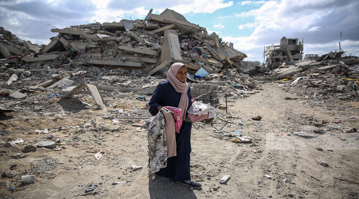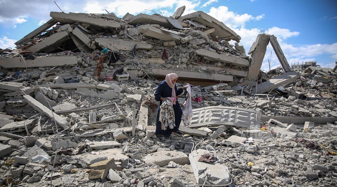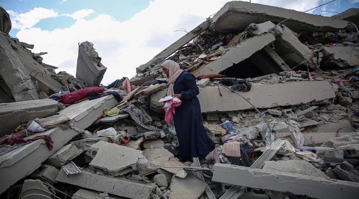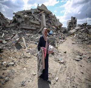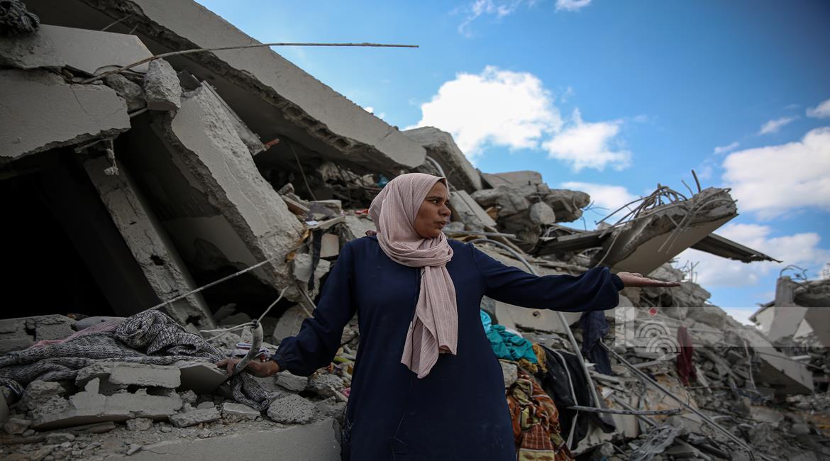 غزة - المواطنة أمل أبو ربيع تتفقد أنقاض منزلها المدمر في غزة