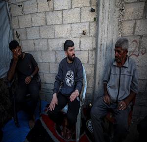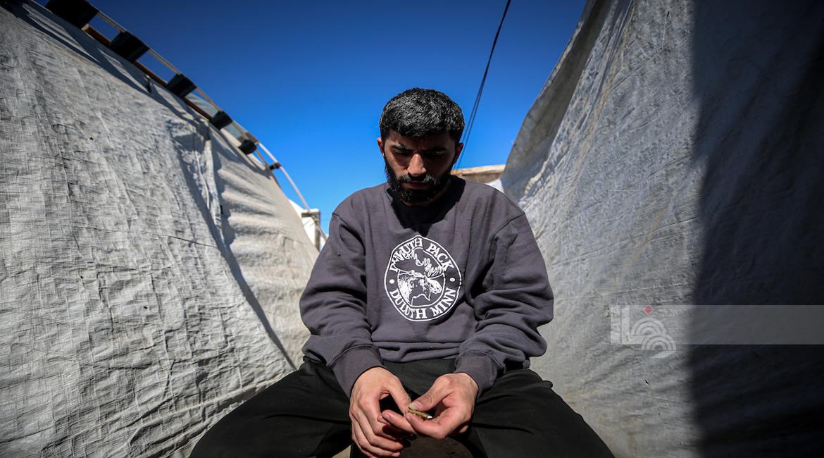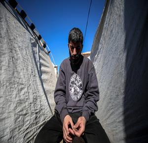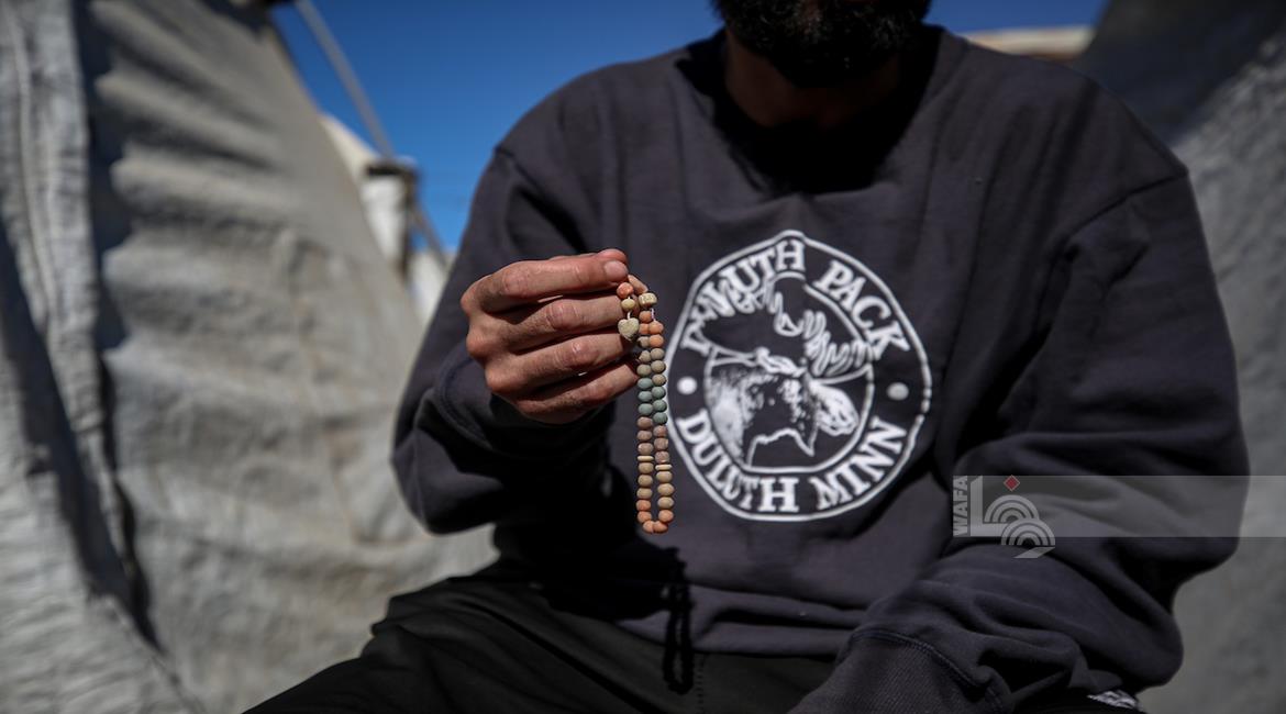 عائلة نازحة تكافح وسط ظروف غير إنسانية من أجل حماية أطفالها الأربعة من أجواء الشتاء القارس في خيام النزوح بملعب اليرموك في مدينة غزة