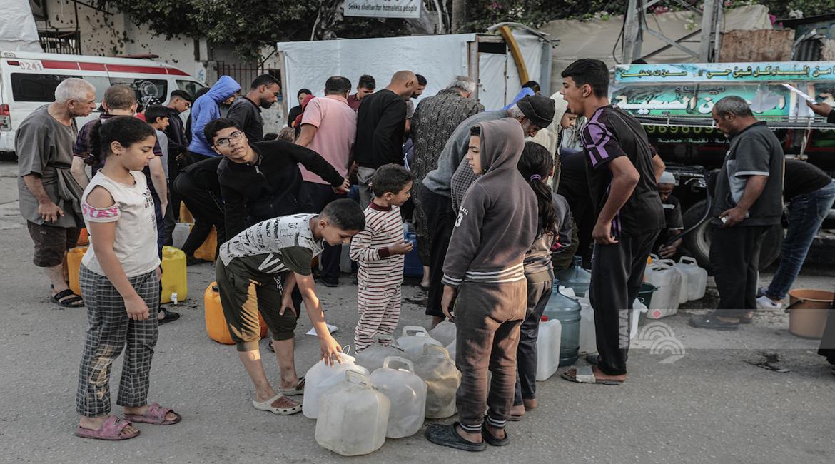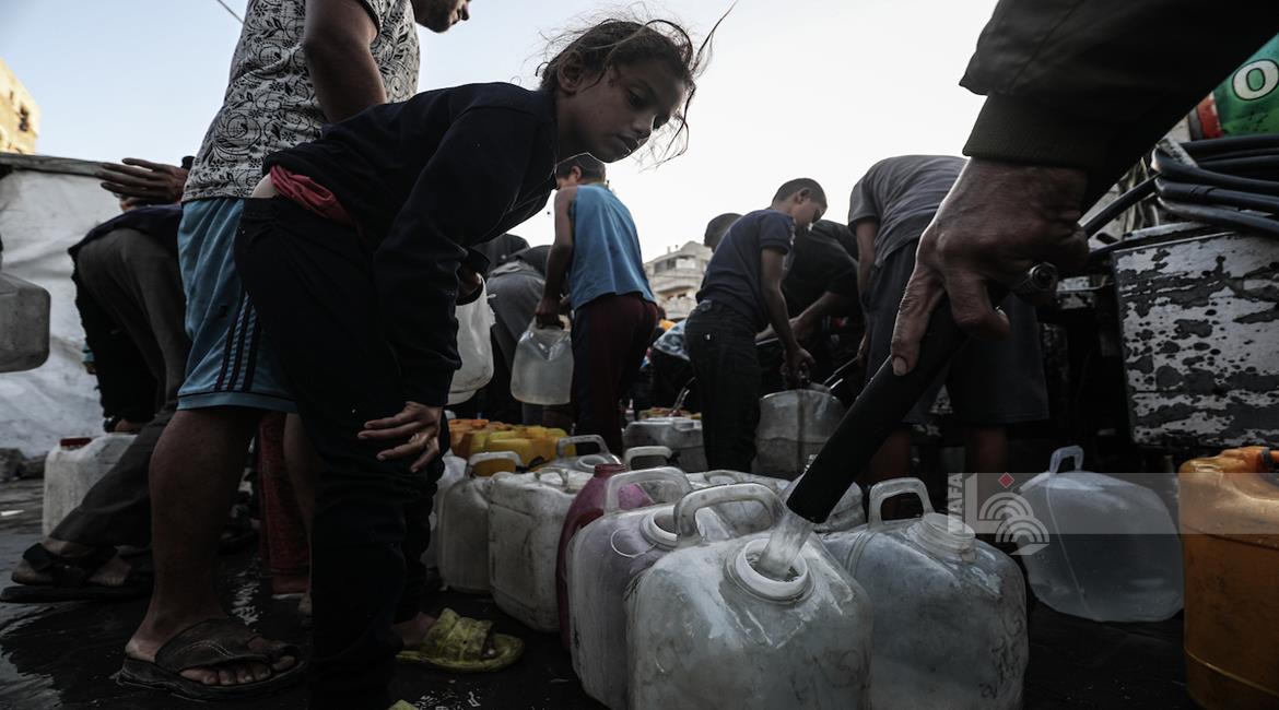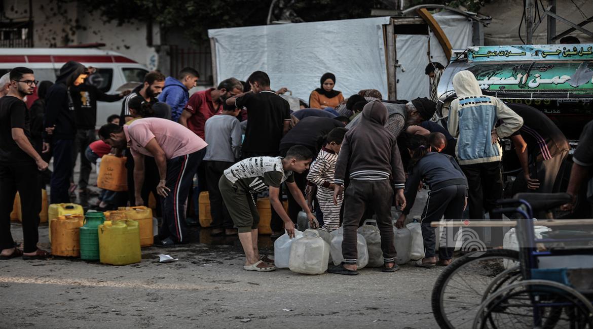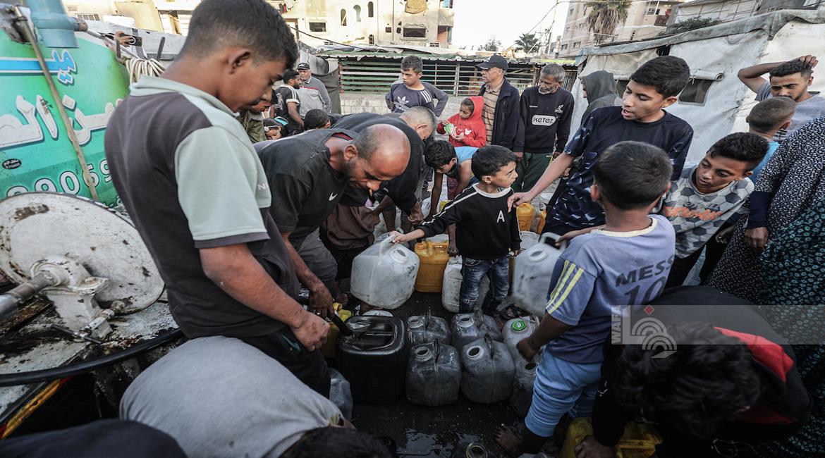 غزة - مواطنون يتجمعون للحصول على مياه الشرب في مخيم البريج