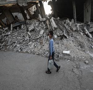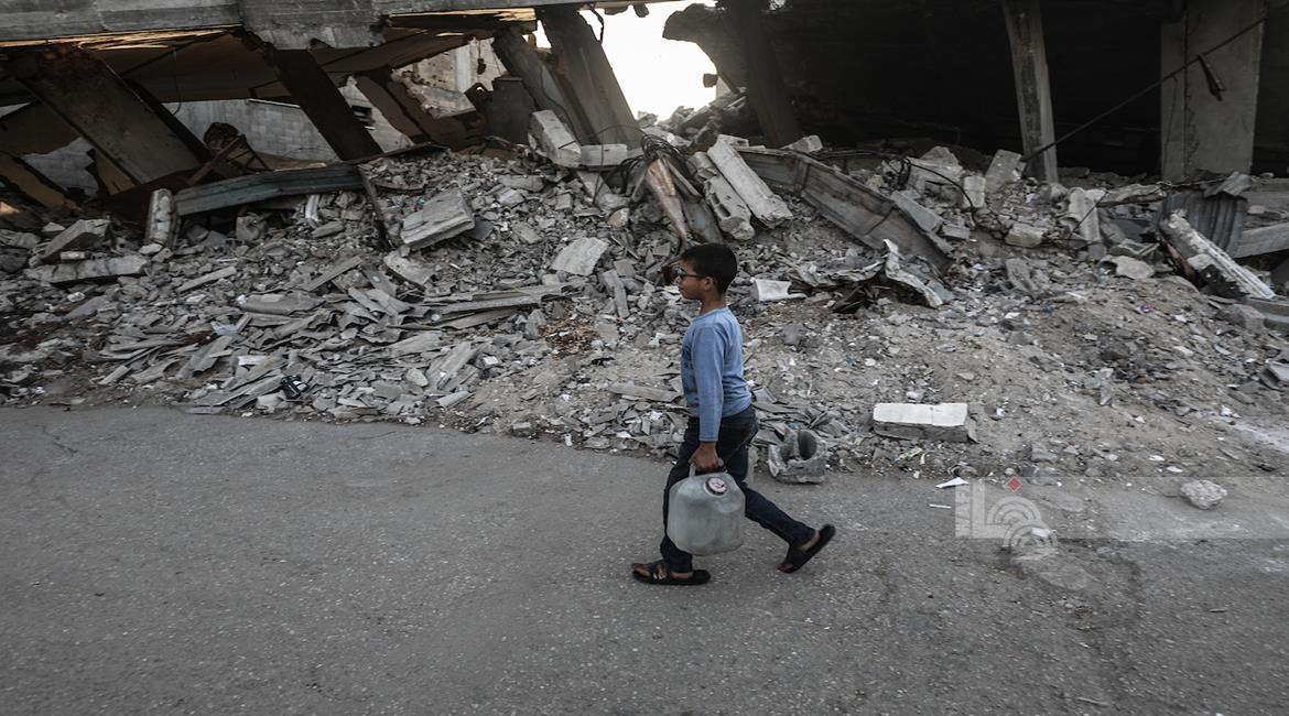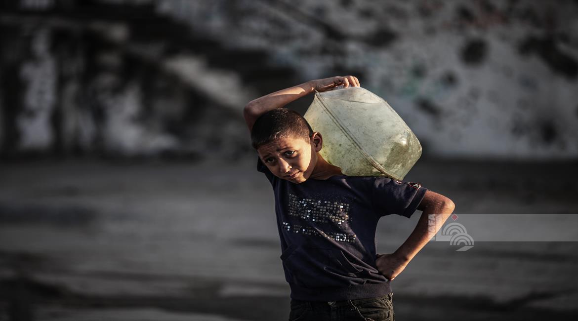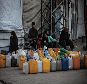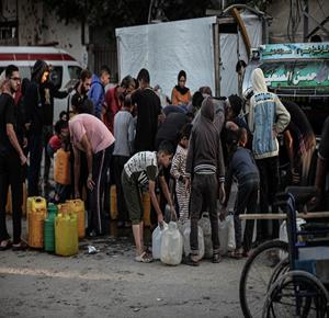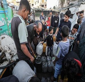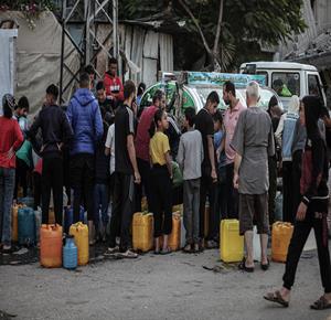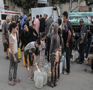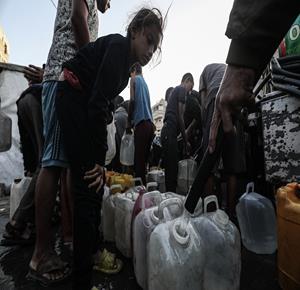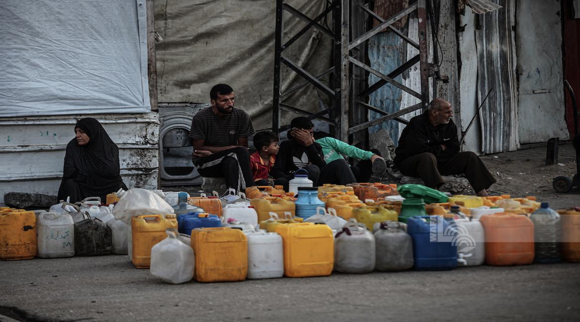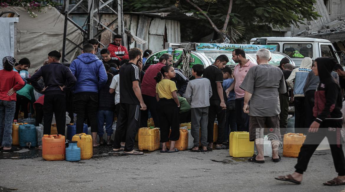 غزة - مواطنون يتجمعون للحصول على مياه الشرب في مخيم البريج