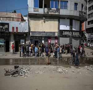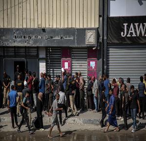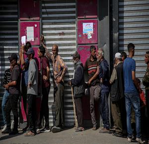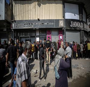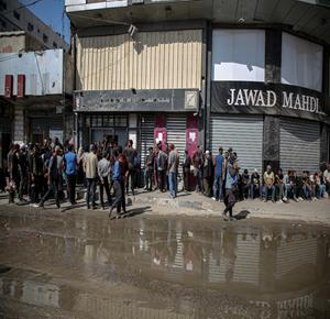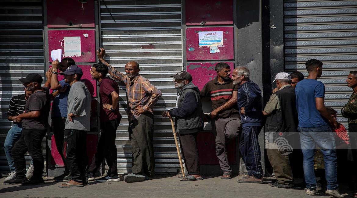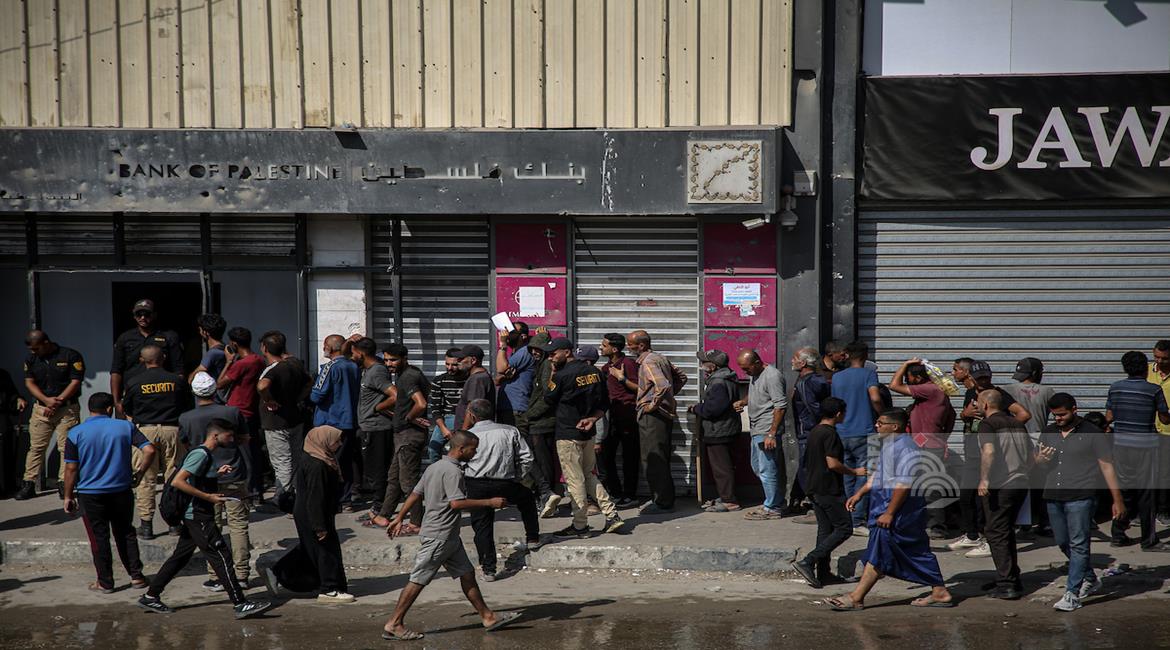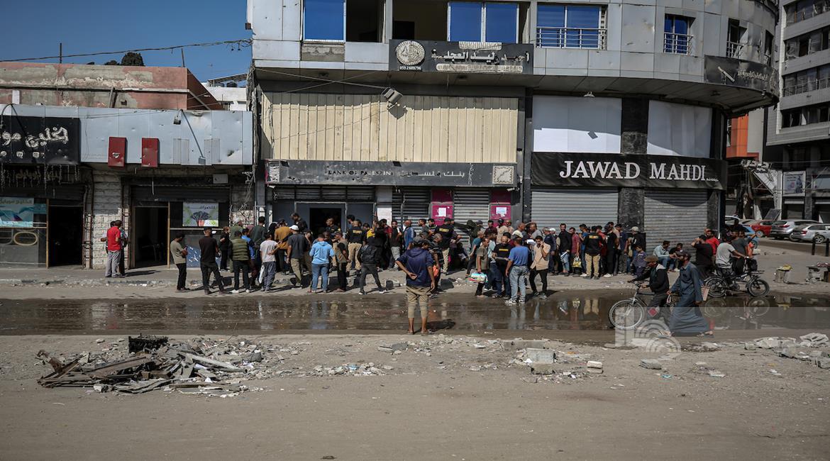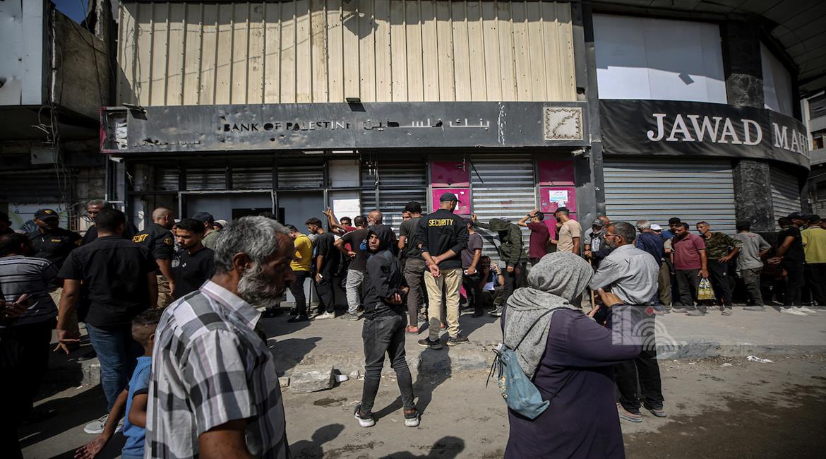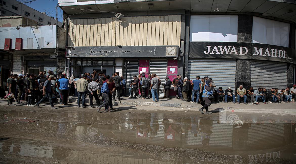 غزة - مواطنون يصطفون في طوابير امام احد البنوك المصرفية في مدينة غزة , بعد ان اغلقت خلال الفترة السابقة بسبب استمرار الحرب الاسرائيلية على قطاع غزة