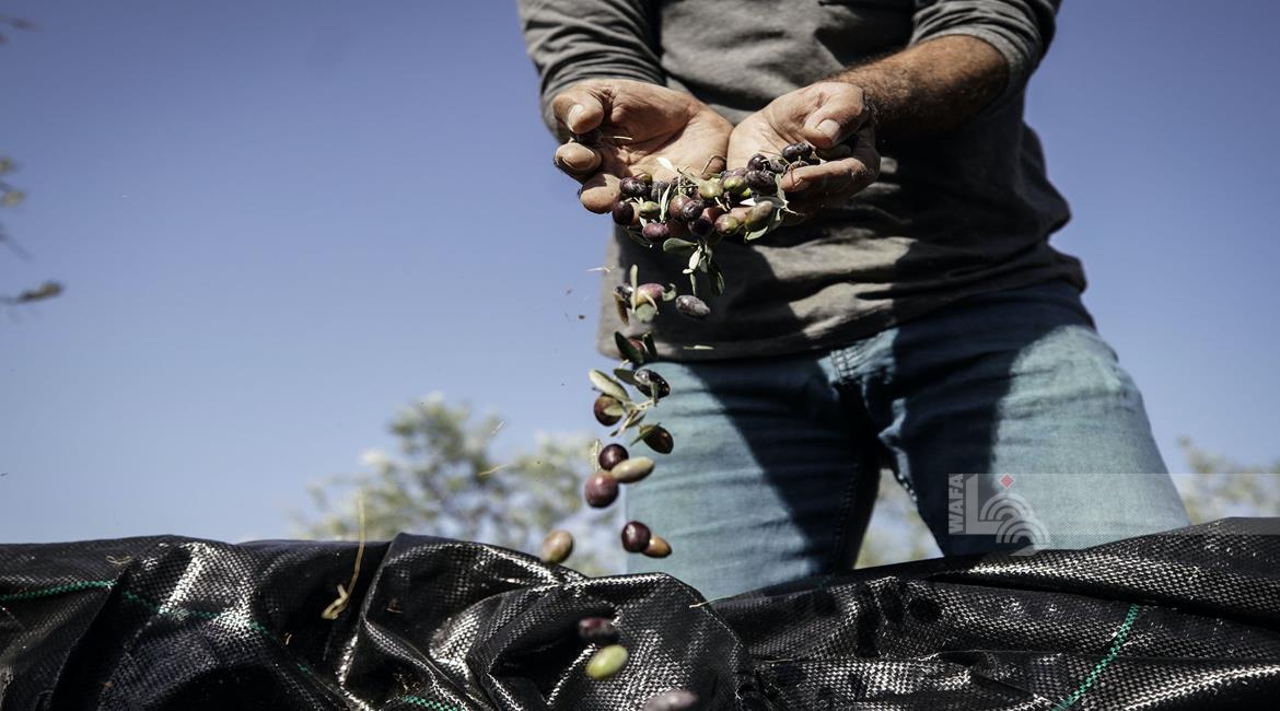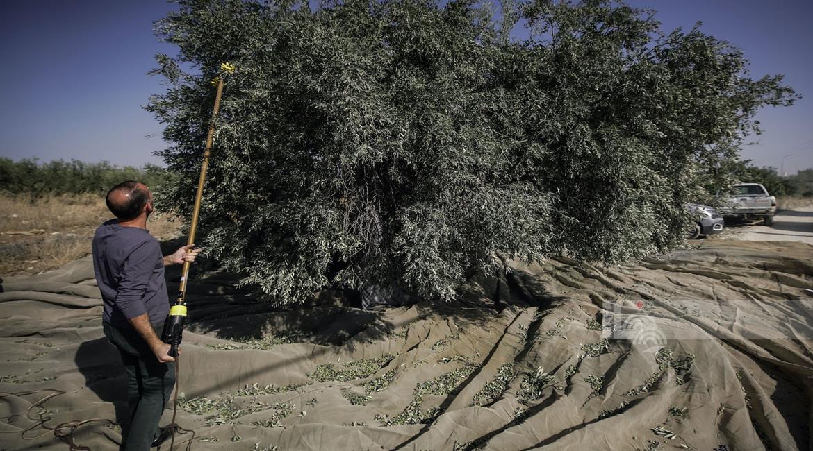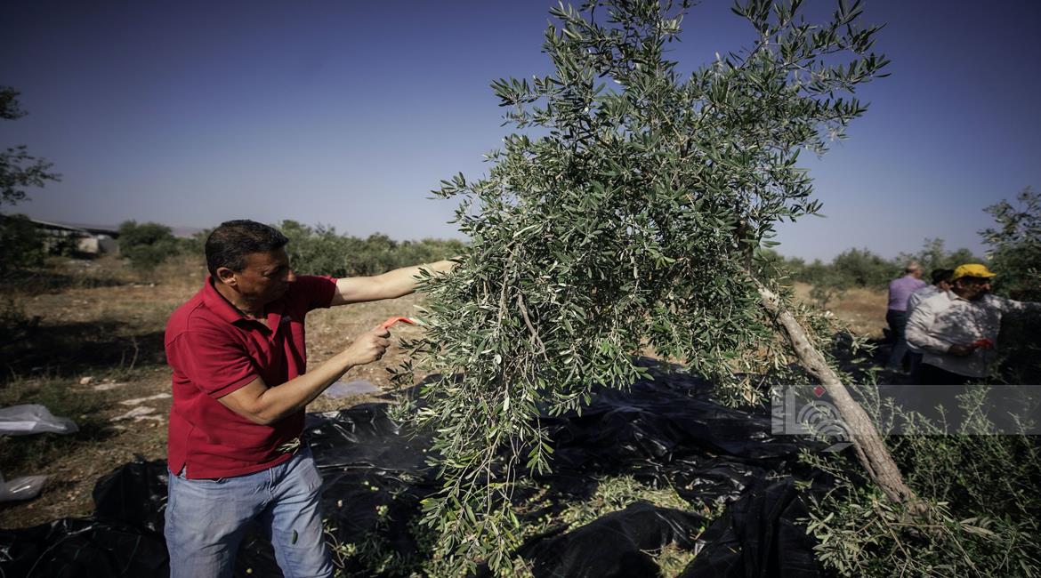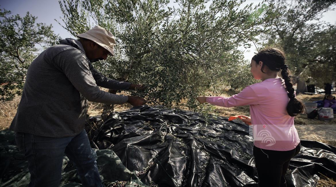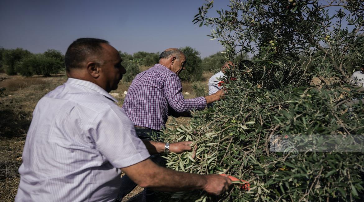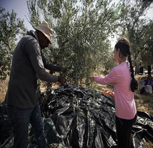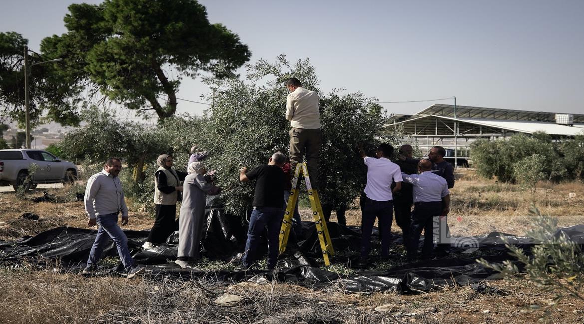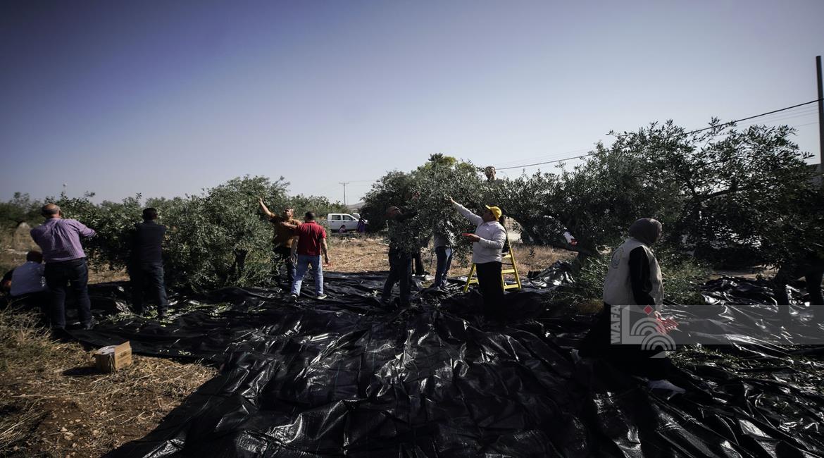 جنين - مزارعون ومتطوعون يقطفون ثمار الزيتون في قرية الجلمة المحاذية لحاجز الجلمة العسكري شمال جنين