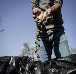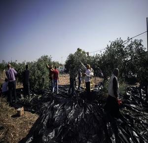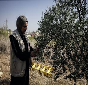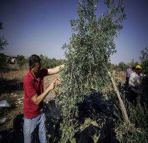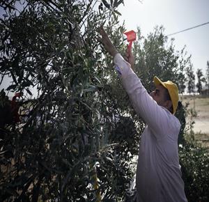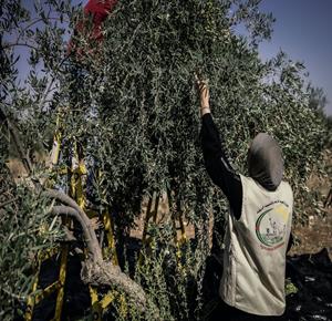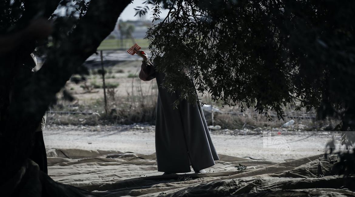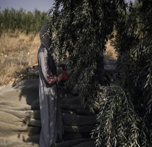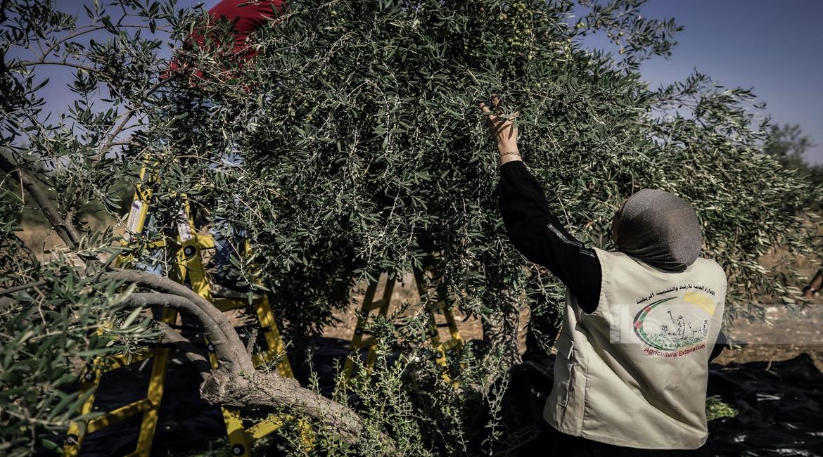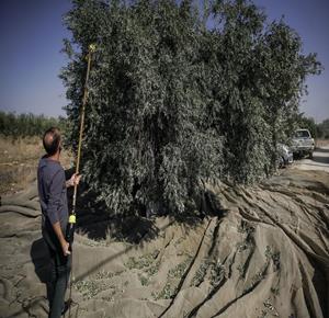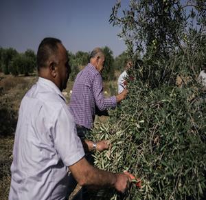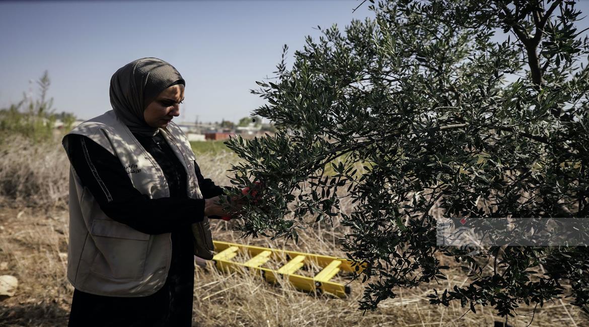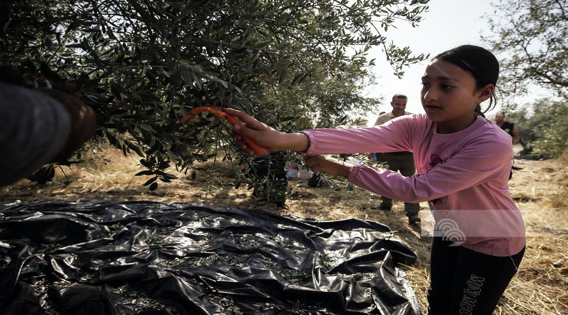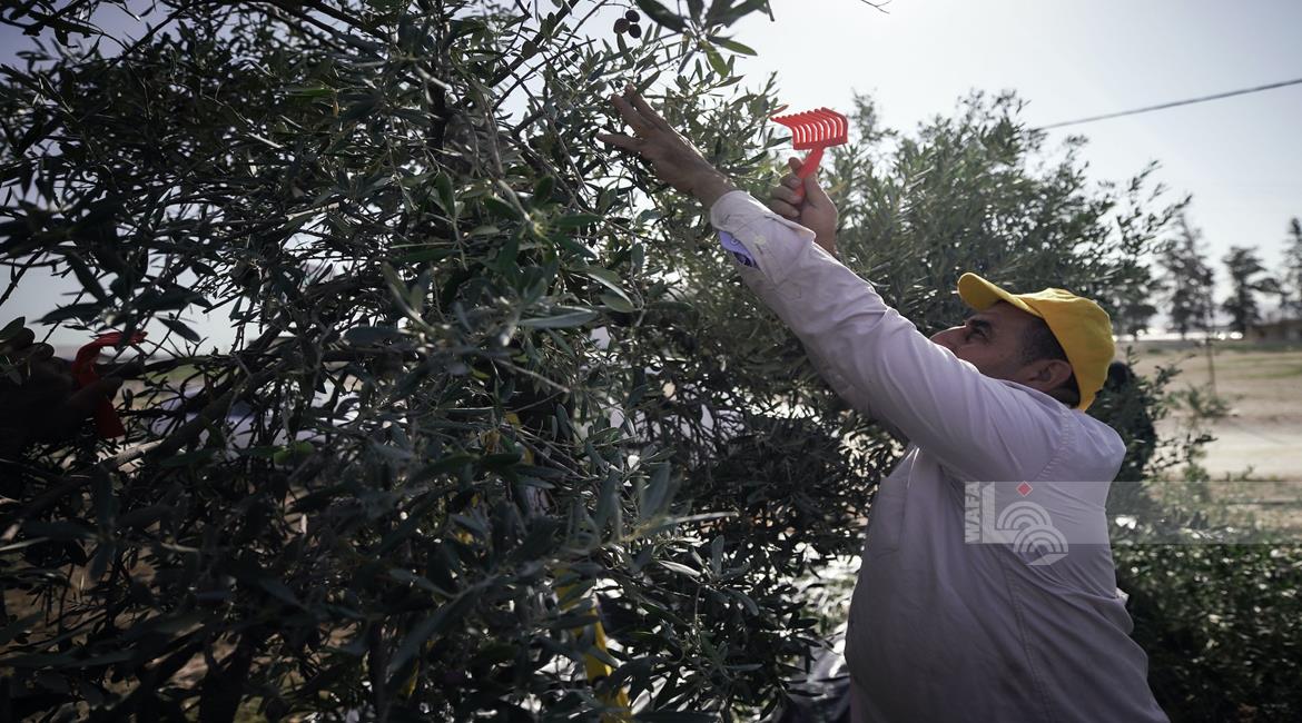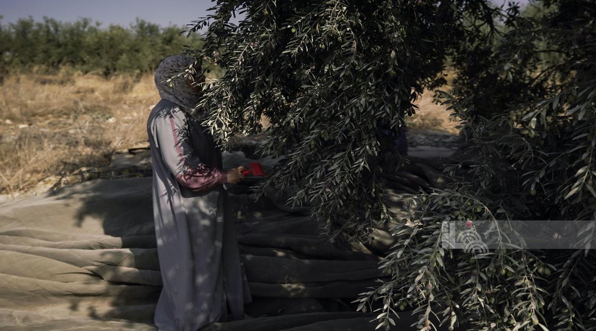 جنين - مزارعون ومتطوعون يقطفون ثمار الزيتون في قرية الجلمة المحاذية لحاجز الجلمة العسكري شمال جنين