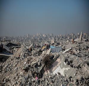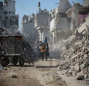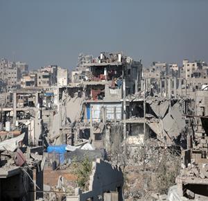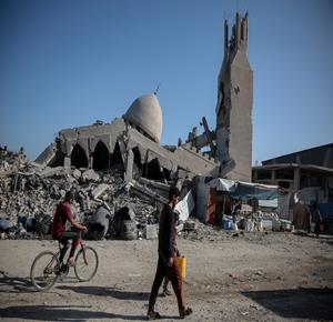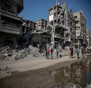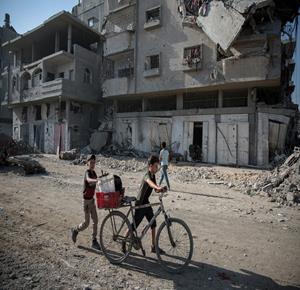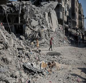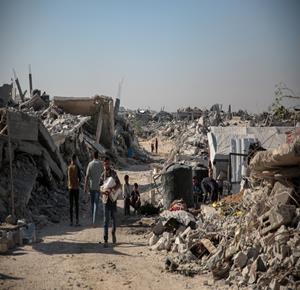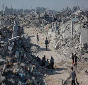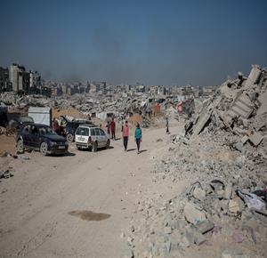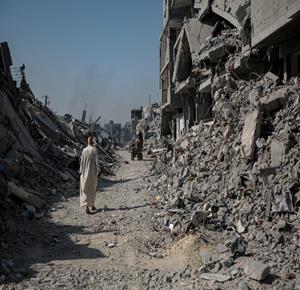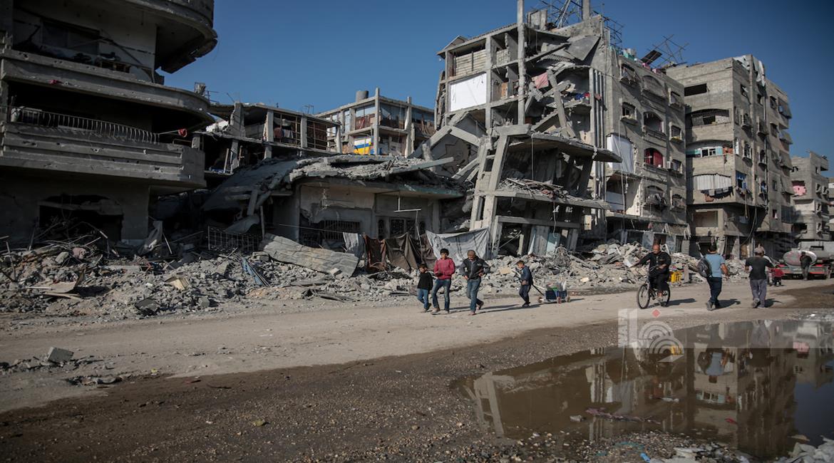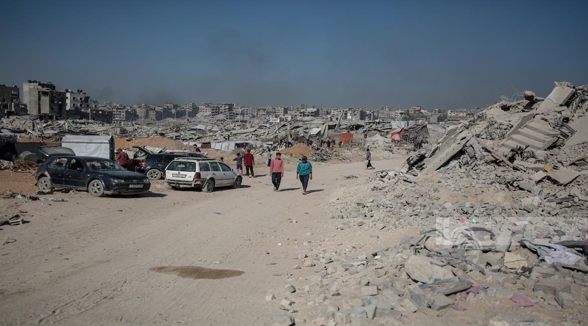 مواطنون يتفقدون منازلهم وأحيائهم المدمرة في منطقة تل الهوا جنوب مدينة غزة