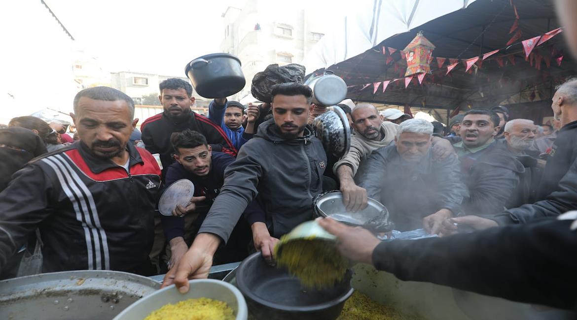 عائلات نازحة تتجمع للحصول على وجبات مجانية من مطبخ خيري في مخيم النصيرات للاجئين، وسط تعليق عمل العديد من المنظمات الإنسانية بسبب القيود الإسرائيلية وتقليص دخول المساعدات