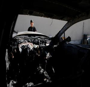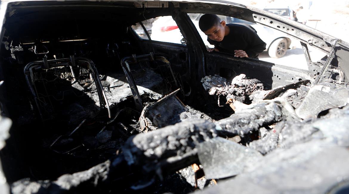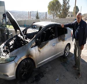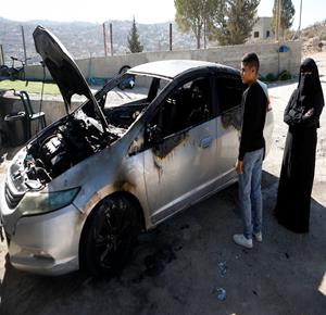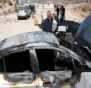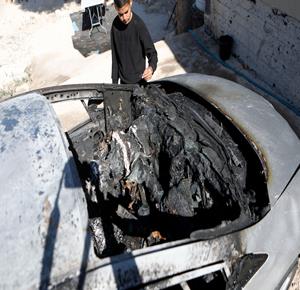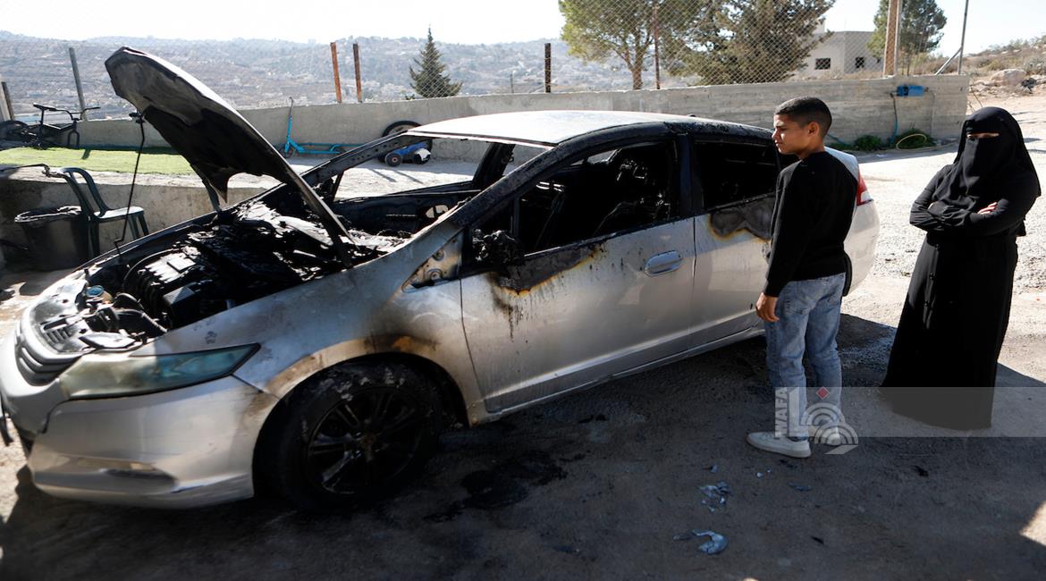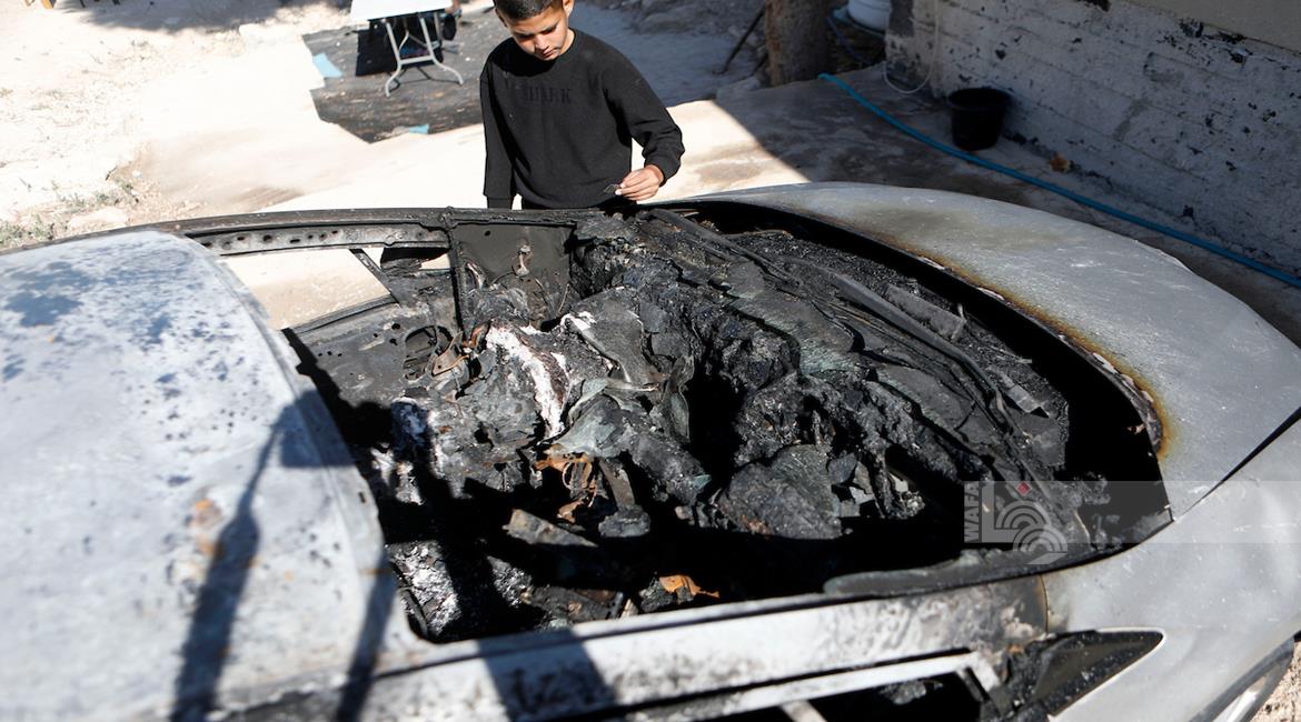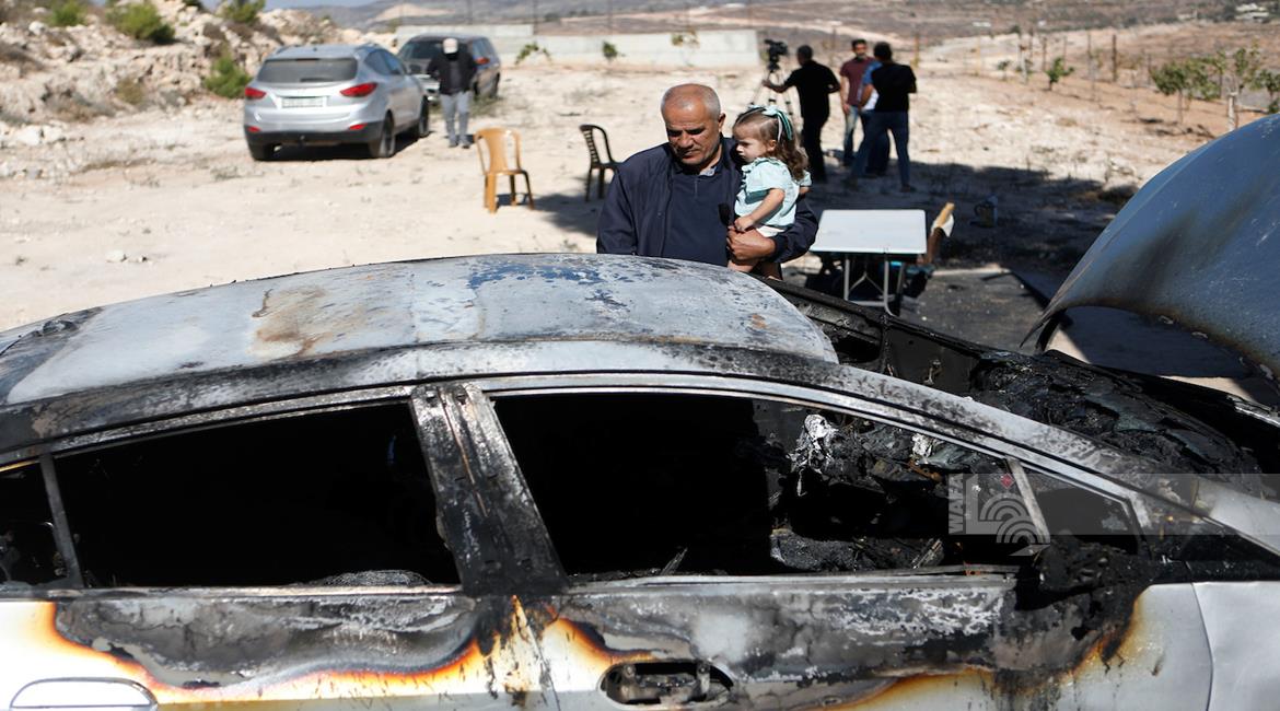 الخليل - مواطنون يتفقدون مركبة أضرم مستعمرون النار فيها في قرية صوريف شمال الخليل