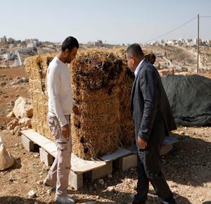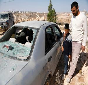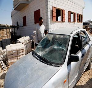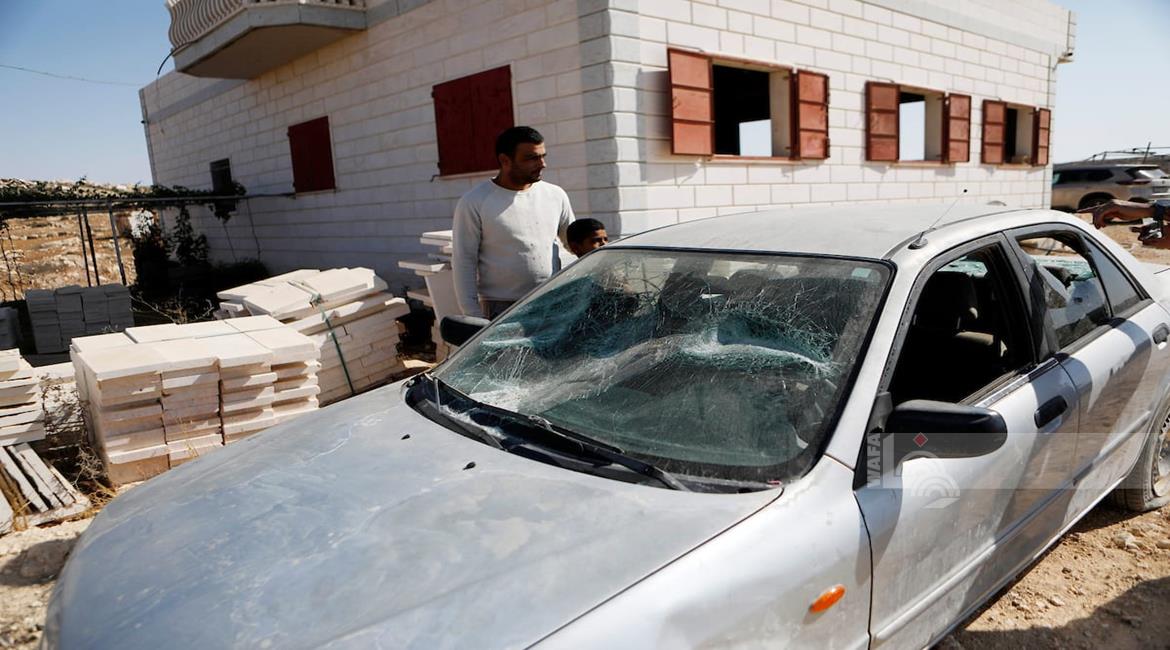 الخليل - مواطنون يتفقدون الأضرار التي لحقت بمنزل عائلة الدغامين بعد هجوم المستعمرين الذي أسفر عن إصابة خمسة من أفراد العائلة في بلدة السموع