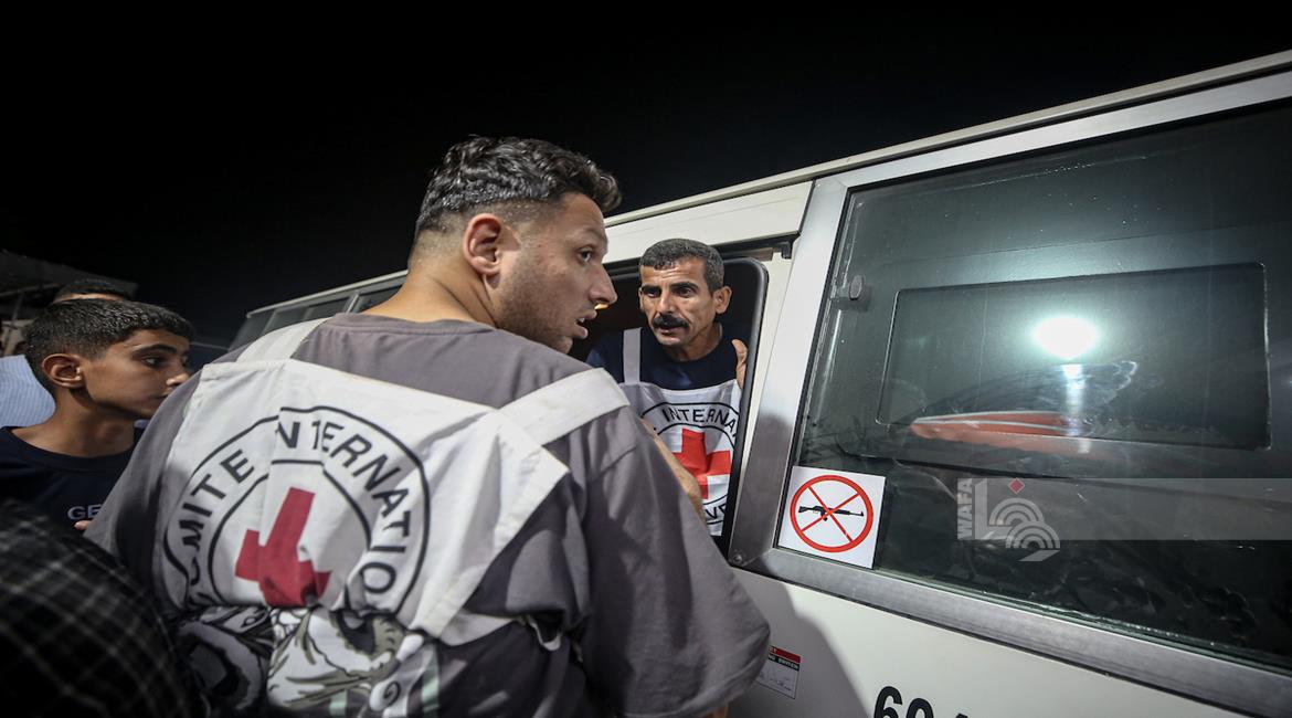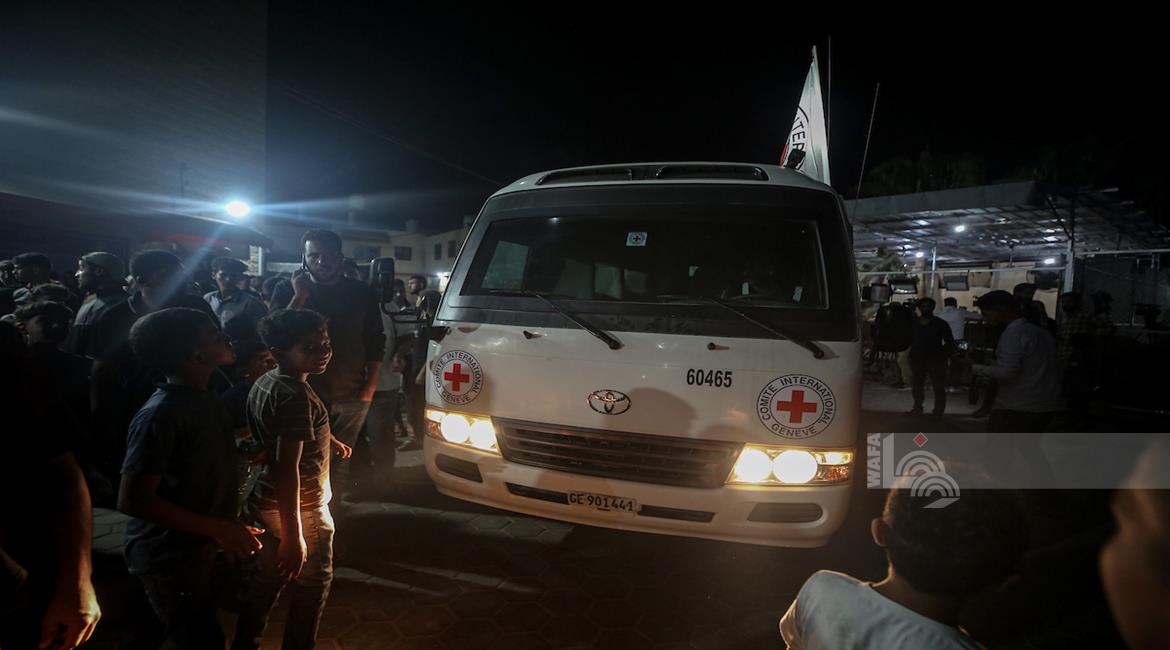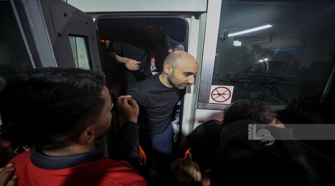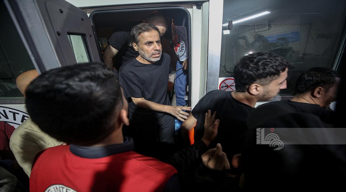 غزة - طواقم الصليب الأحمر تتسلم خمسة أسرى من قطاع غزة بعد أن أفرج عنهم الاحتلال، وتقوم بنقلهم إلى مستشفى شهداء الأقصى لتلقي العلاج