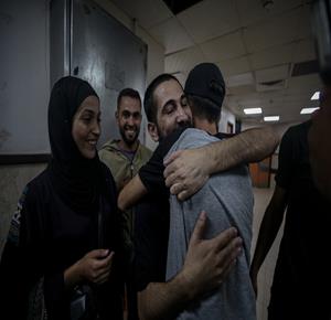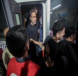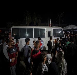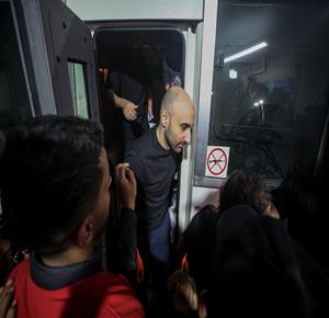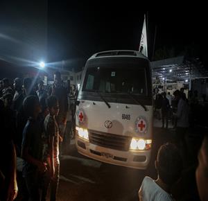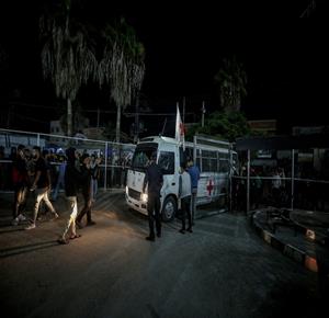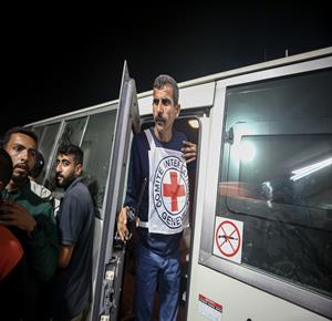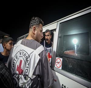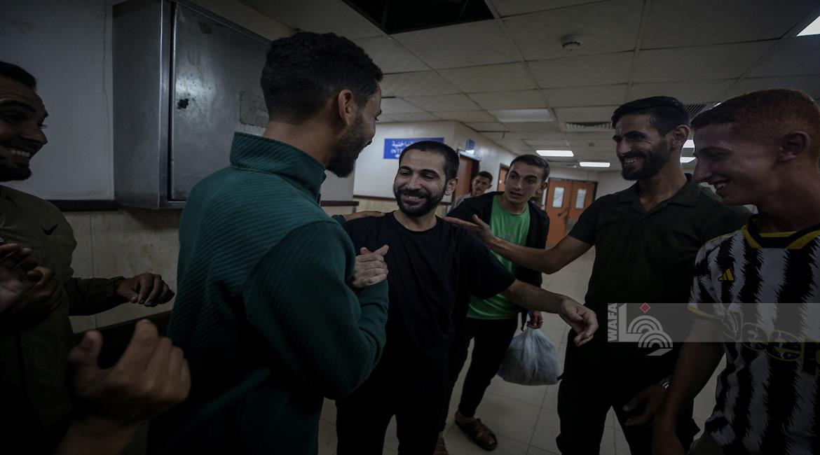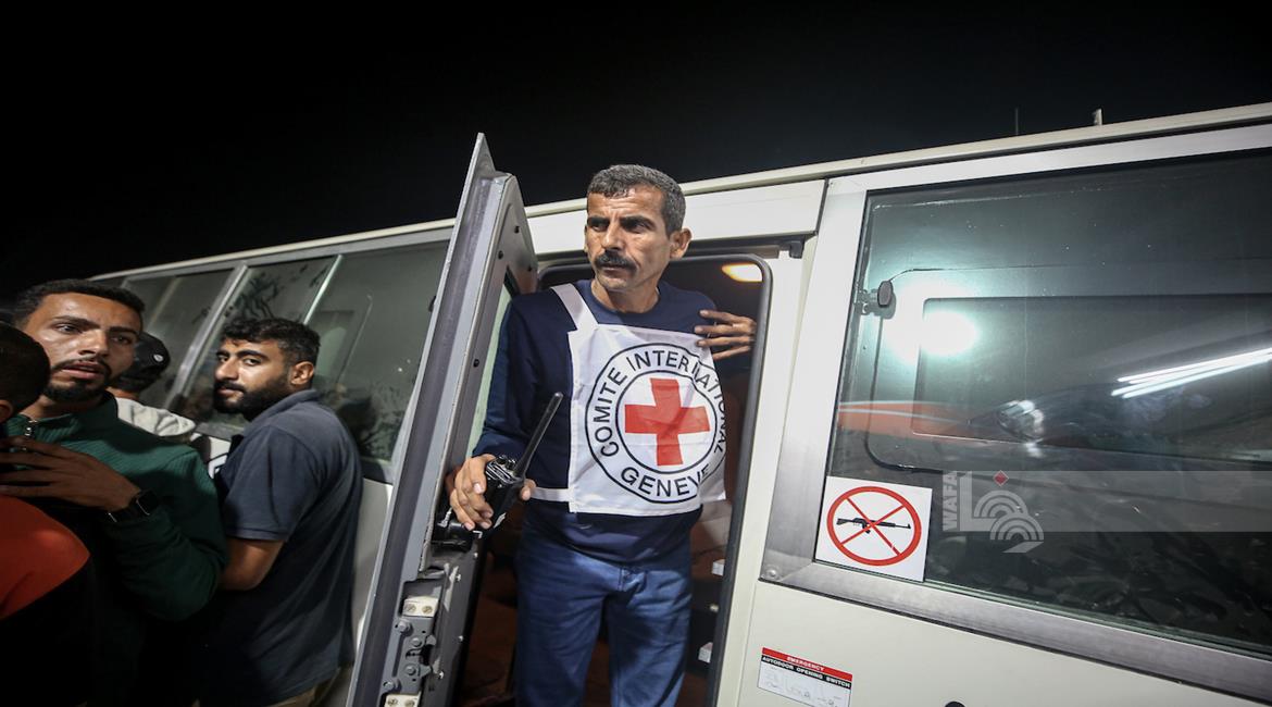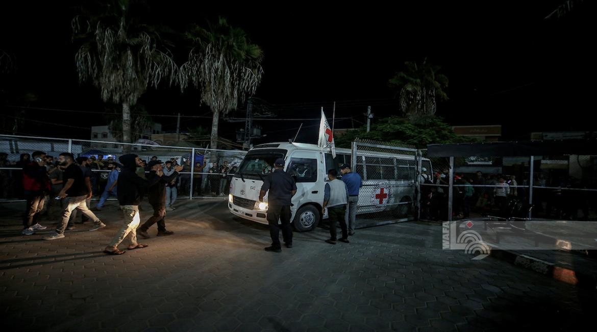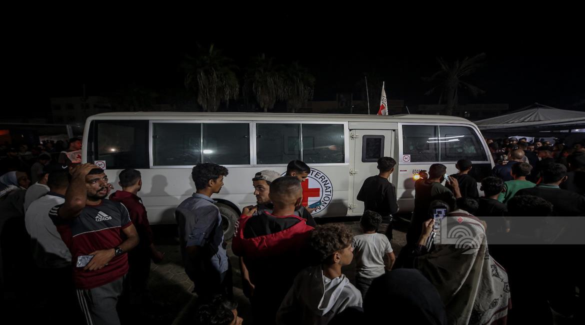 غزة - طواقم الصليب الأحمر تتسلم خمسة أسرى من قطاع غزة بعد أن أفرج عنهم الاحتلال، وتقوم بنقلهم إلى مستشفى شهداء الأقصى لتلقي العلاج