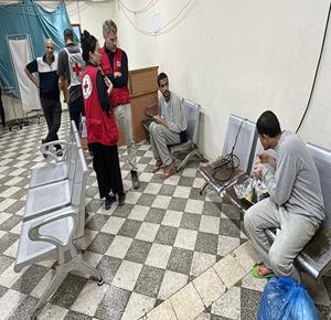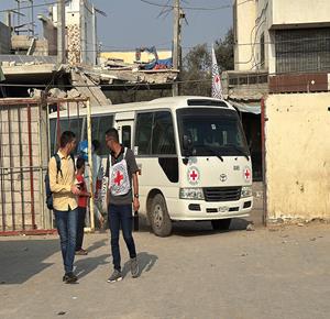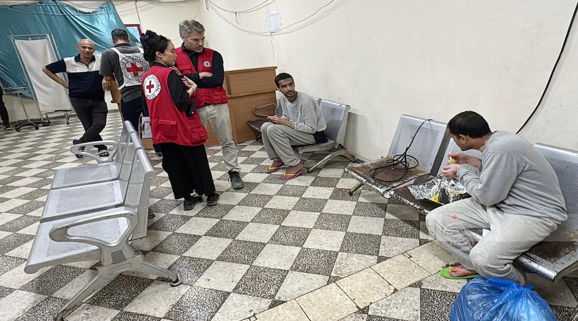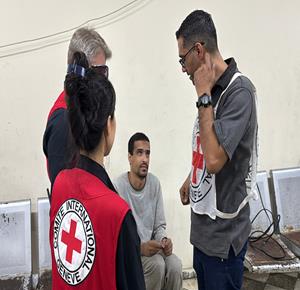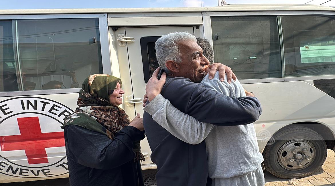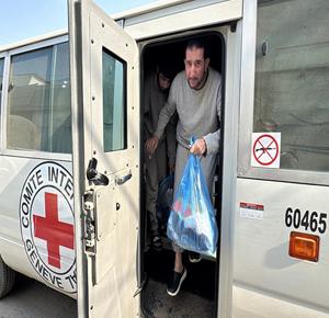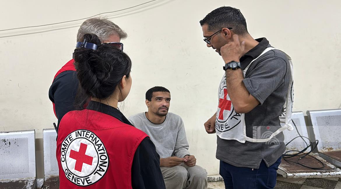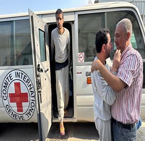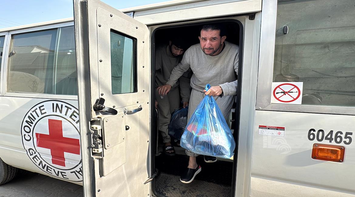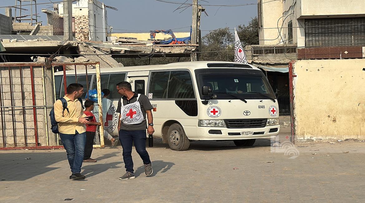 غزة - طواقم الصليب الأحمر تتسلم أسرى من قطاع غزة بعد أن أفرج عنهم الاحتلال، وتقوم بنقلهم إلى مستشفى شهداء الأقصى لتلقي العلاج