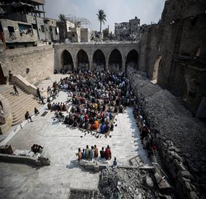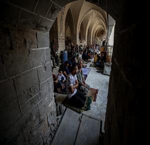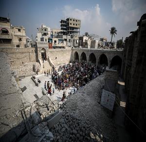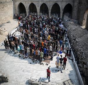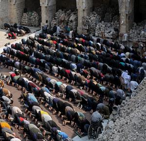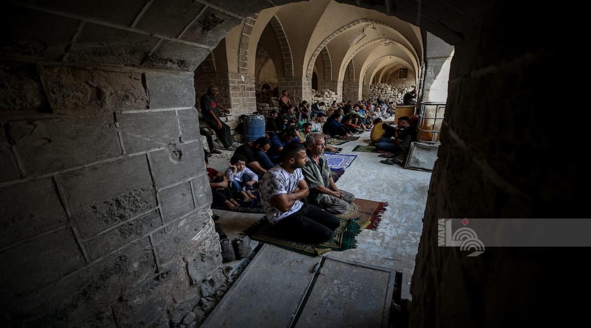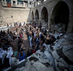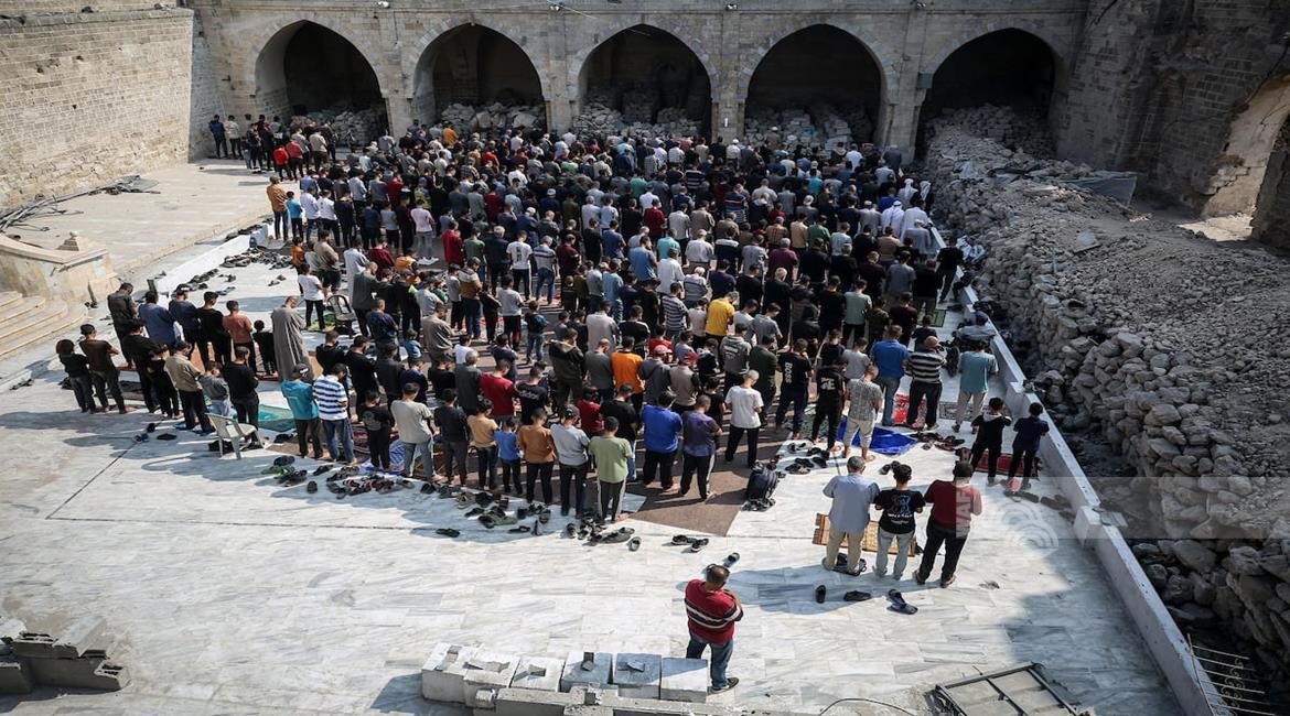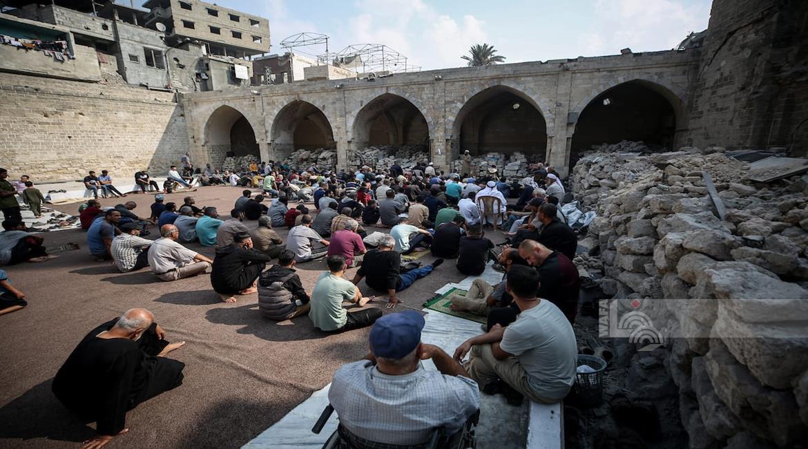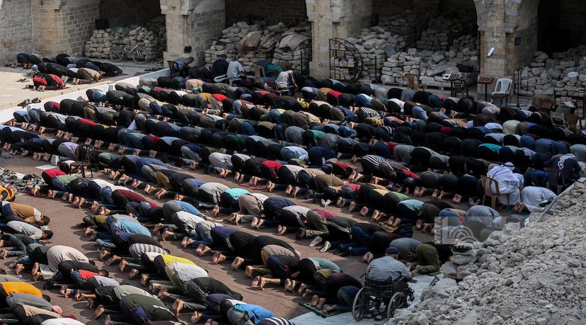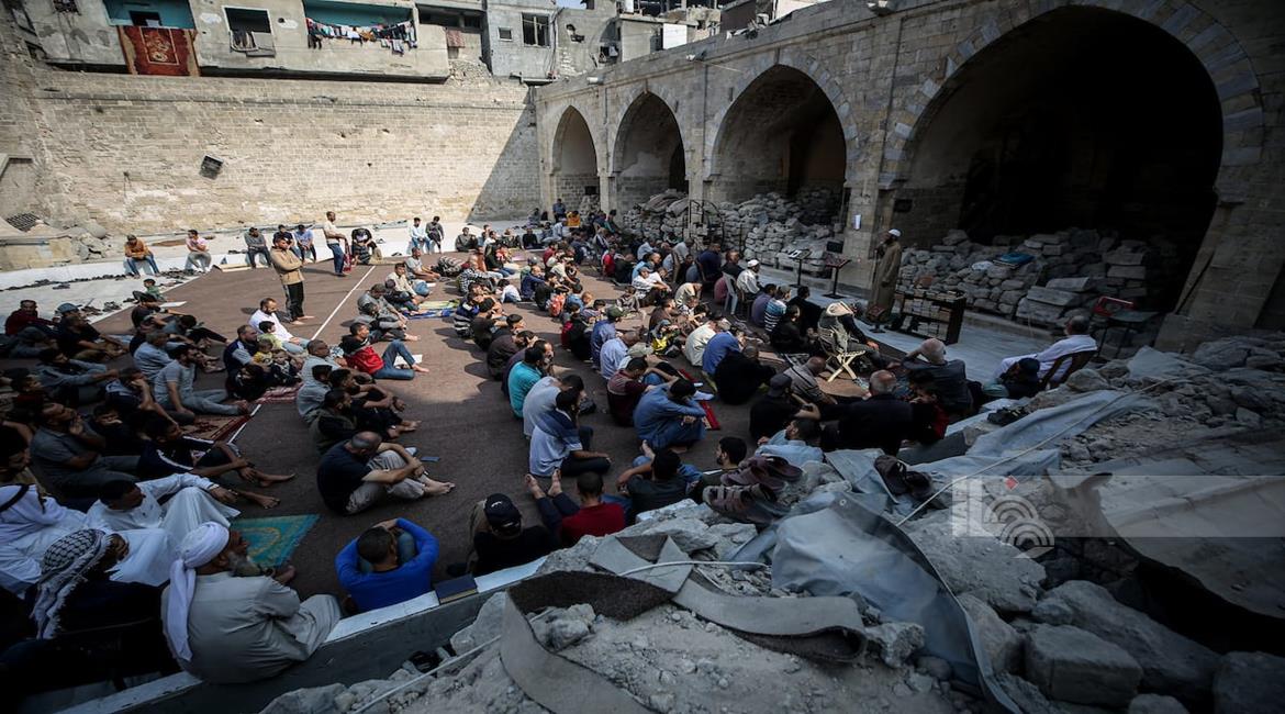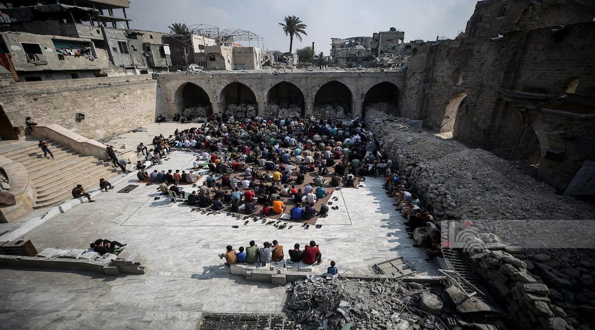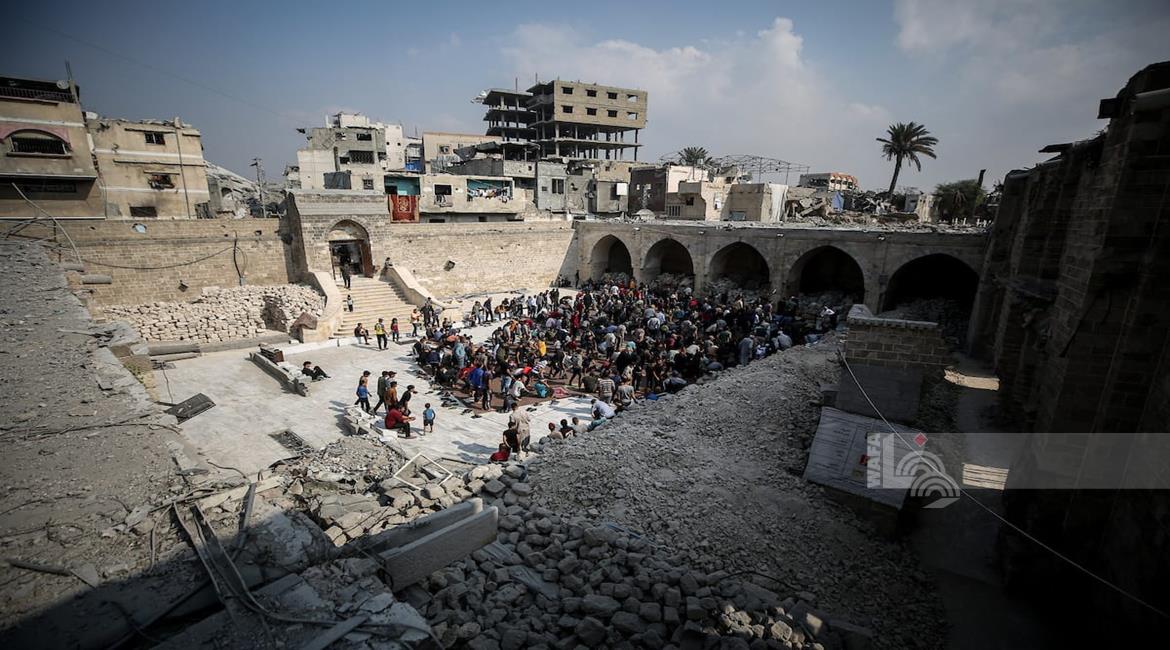 غزة - مواطنون يؤدون صلاة الجمعة في مسجد عمر الكبير بمدينة غزة الذي تعرض لأضرار جسيمة خلال العدوان الإسرائيلي