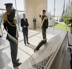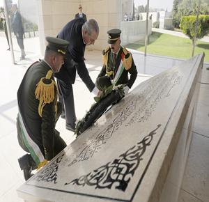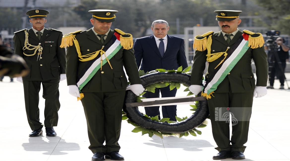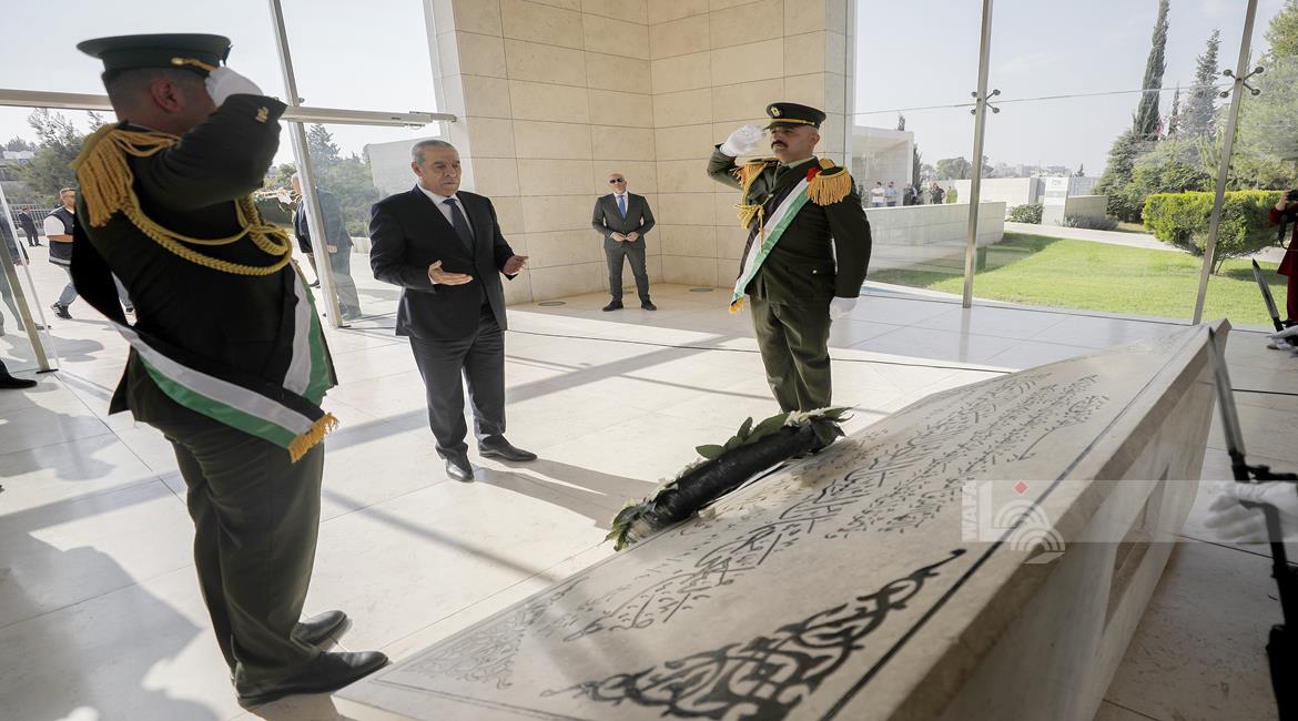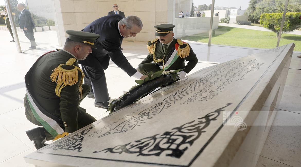 رام الله - نيابة عن الرئيس محمود عباس، نائب رئيس دولة فلسطين، نائب رئيس اللجنة التنفيذية لمنظمة التحرير حسين الشيخ، يضع إكليلا من الزهور على ضريح الشهيد القائد ياسر عرفات في الذكرى ال21 لاستشهاده