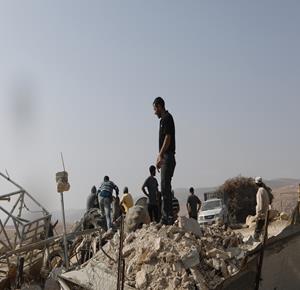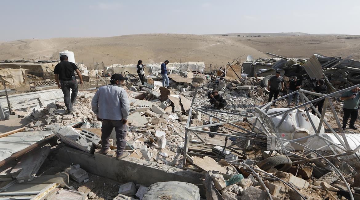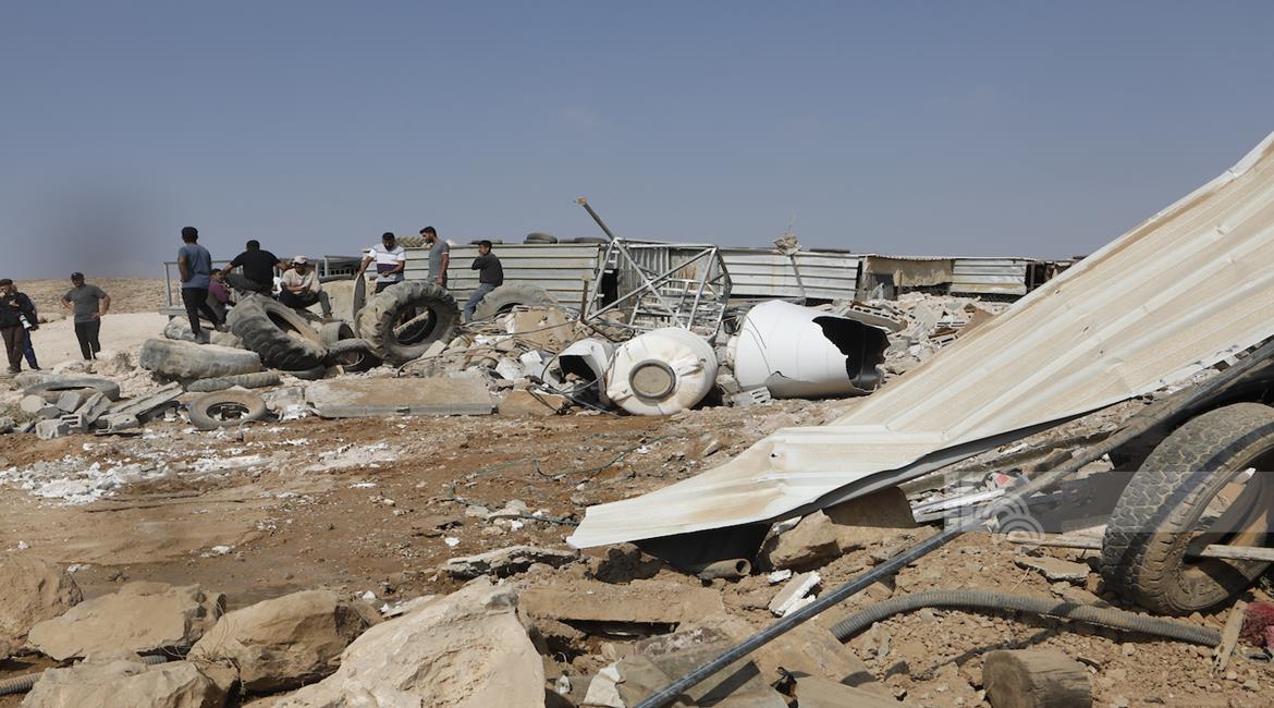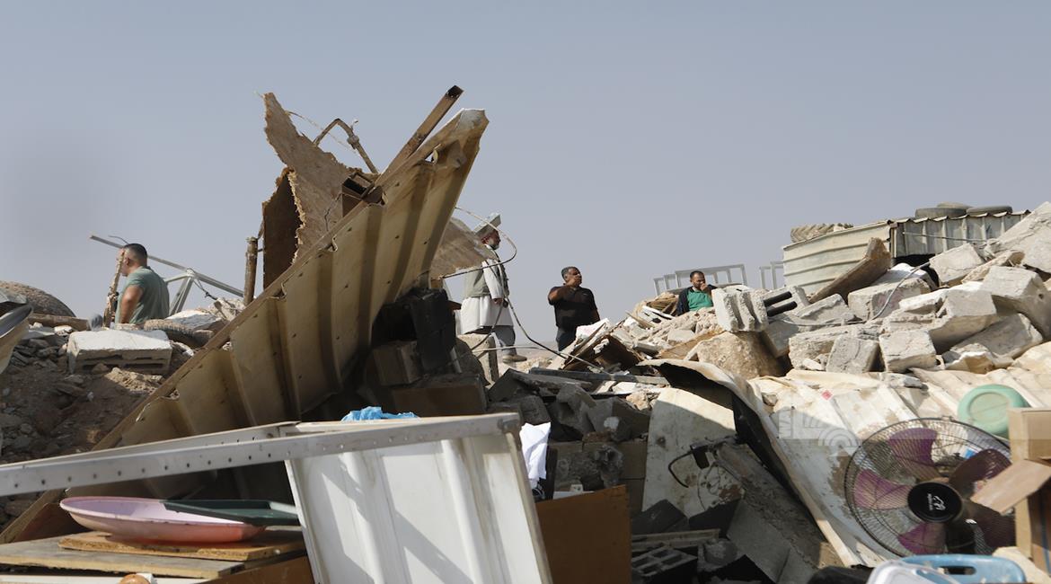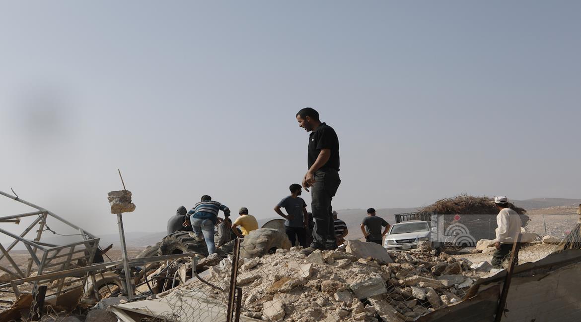 الخليل - مواطنون يتفقدون منازلهم وحظائرهم المهدمة بعد أن هدمتها قوات الاحتلال بالجرافات في منطقة مسافر يطا