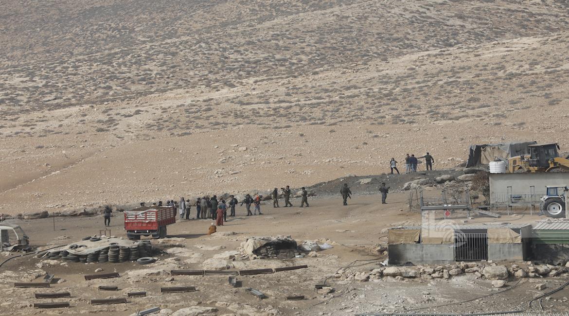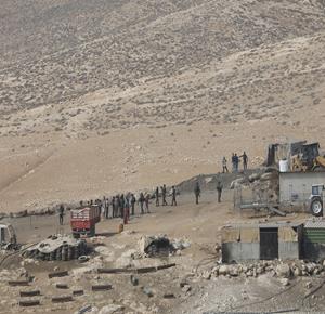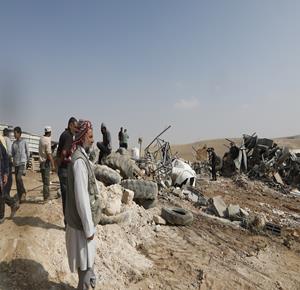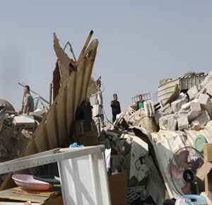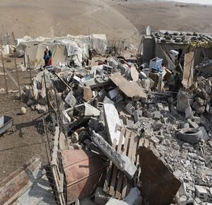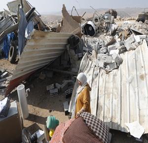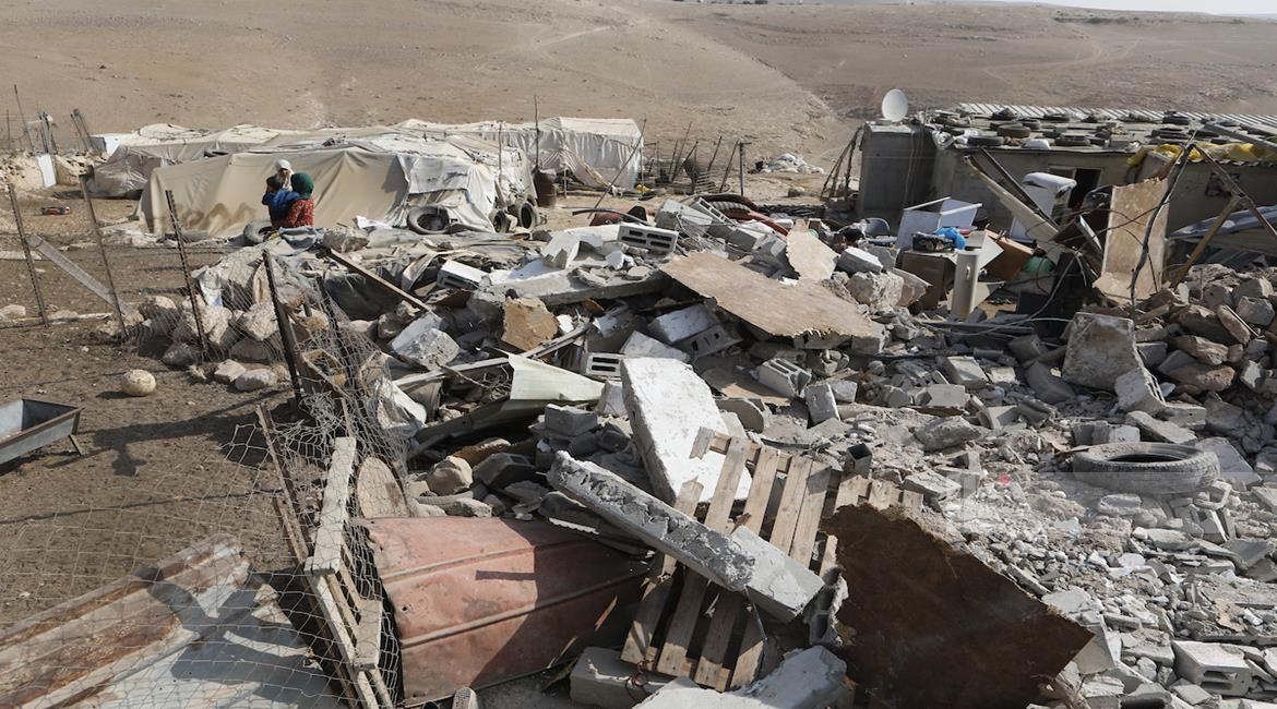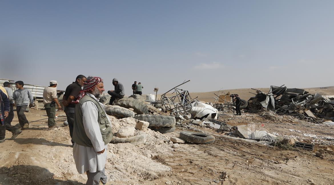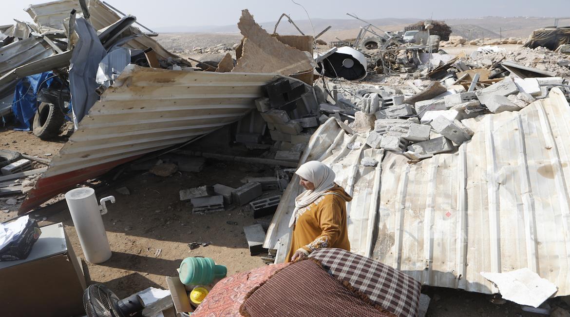 الخليل - مواطنون يتفقدون منازلهم وحظائرهم المهدمة بعد أن هدمتها قوات الاحتلال بالجرافات في منطقة مسافر يطا