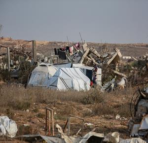مواطنون يتفقدون منازلهم وحظائرهم المهدمة بعد أن هدمتها قوات الاحتلال بالجرافات في منطقة مسافر يطا