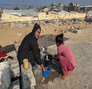 الطفل راتب اقليق (10 أعوام) يعيش مع جده داخل خيمة في دير البلح بعد أن فقد والدته وشقيقه جراء القصف خلال زيارته لهما في خانيونس، يستخدم راتب أنبوب صرف صحي كبديل عن طرف صناعي لمساعدته على الحركة بعد أن أصيب في القصف ذاته وبترت ساقه في وقت يحتاج فيه إلى تركيب طرف صناعي ورعاية طبية وتأهيل عاجل، وسط النقص الحاد في المعدات الطبية جراء استمرار الحرب
