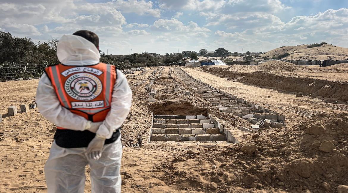 دفن جثامين شهداء مجهولي الهوية في مقبرة جماعية جنوب دير البلح وسط قطاع غزة، بعد استلامها من الاحتلال الإسرائيلي